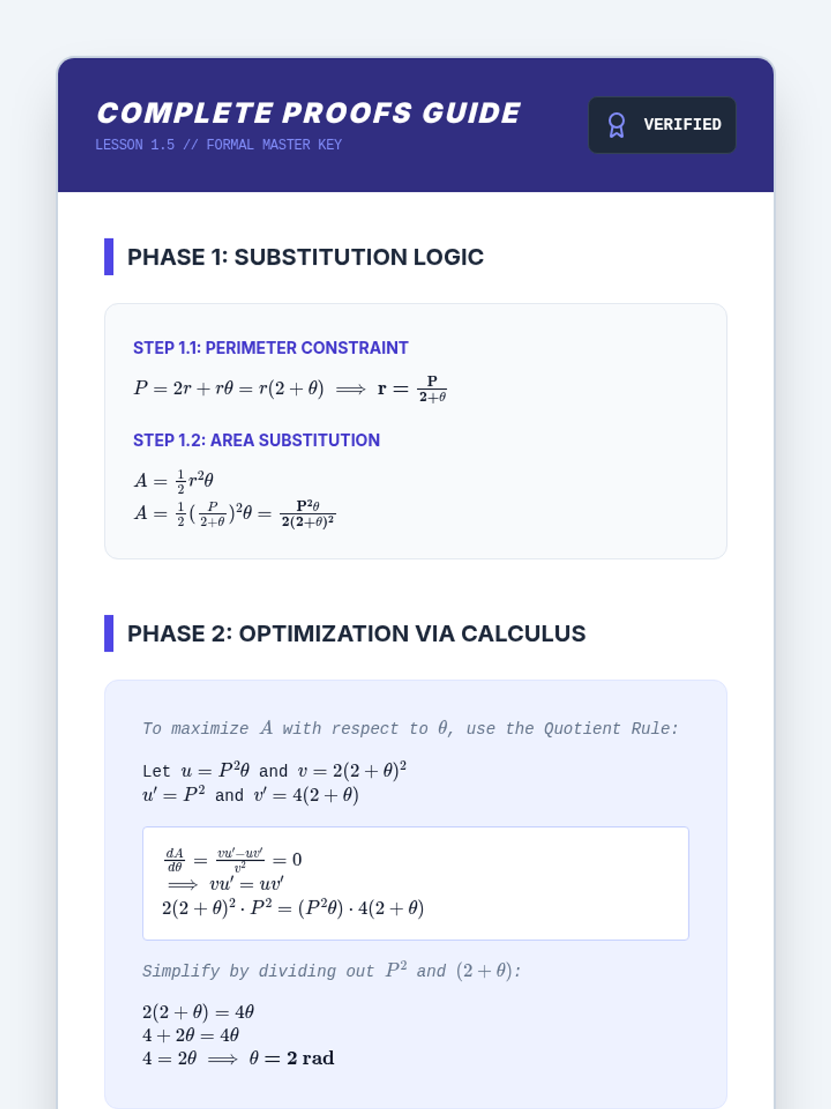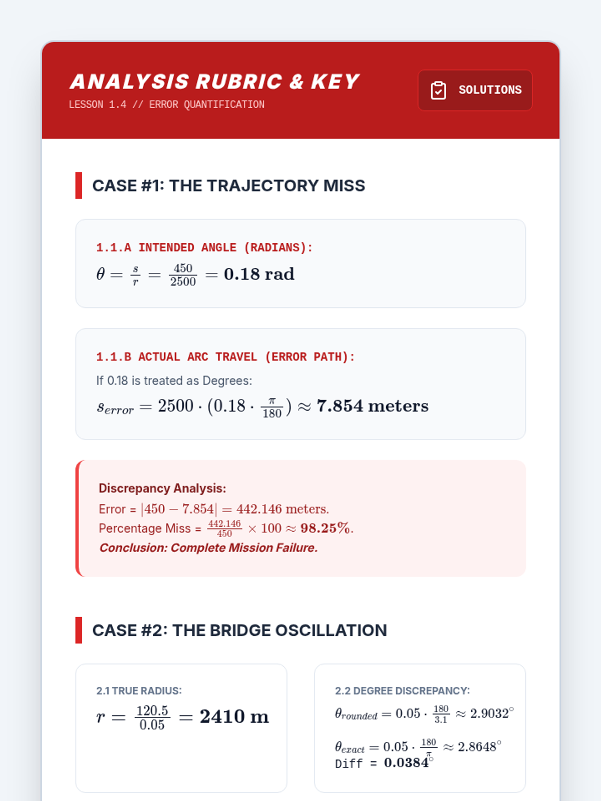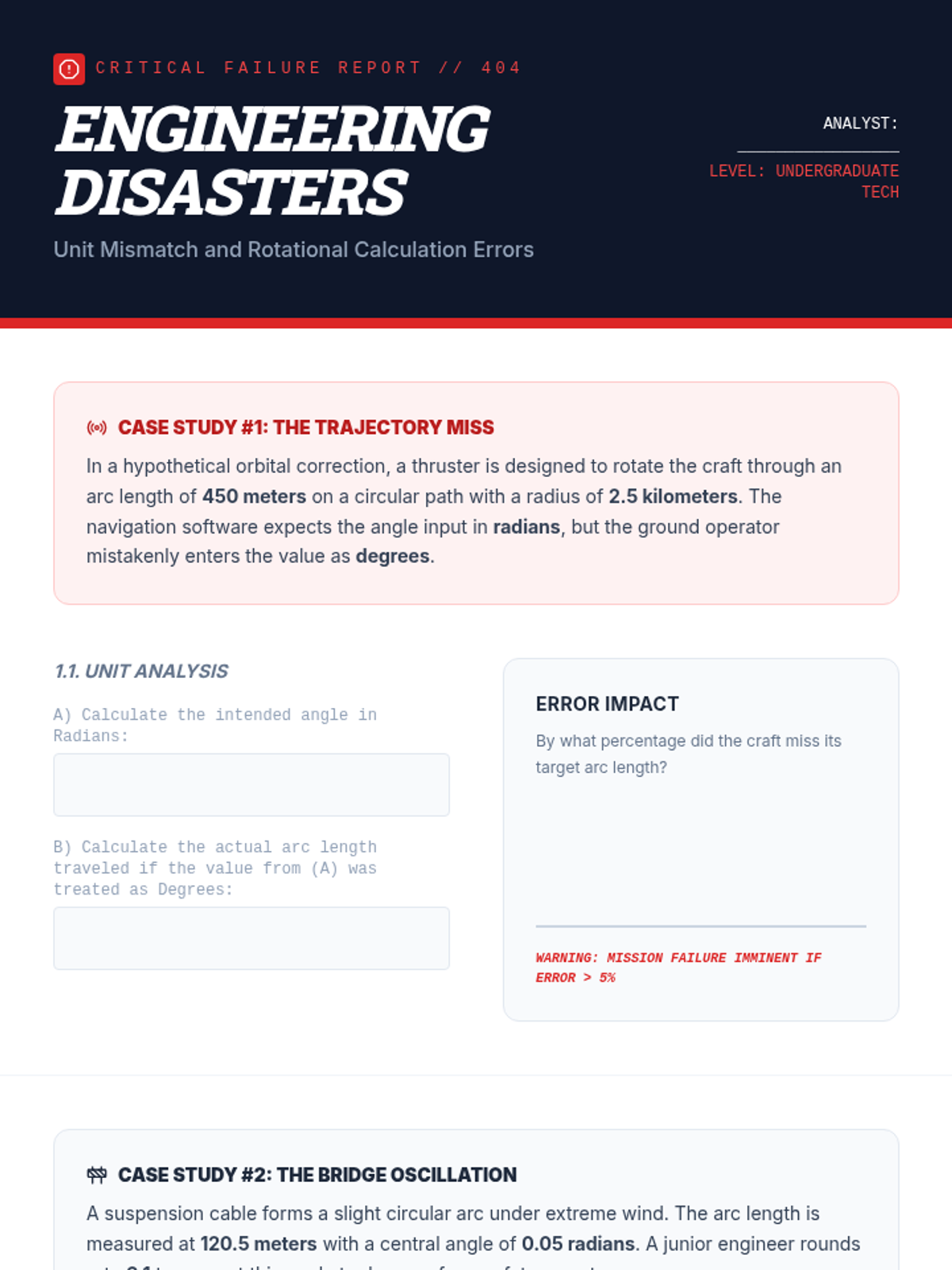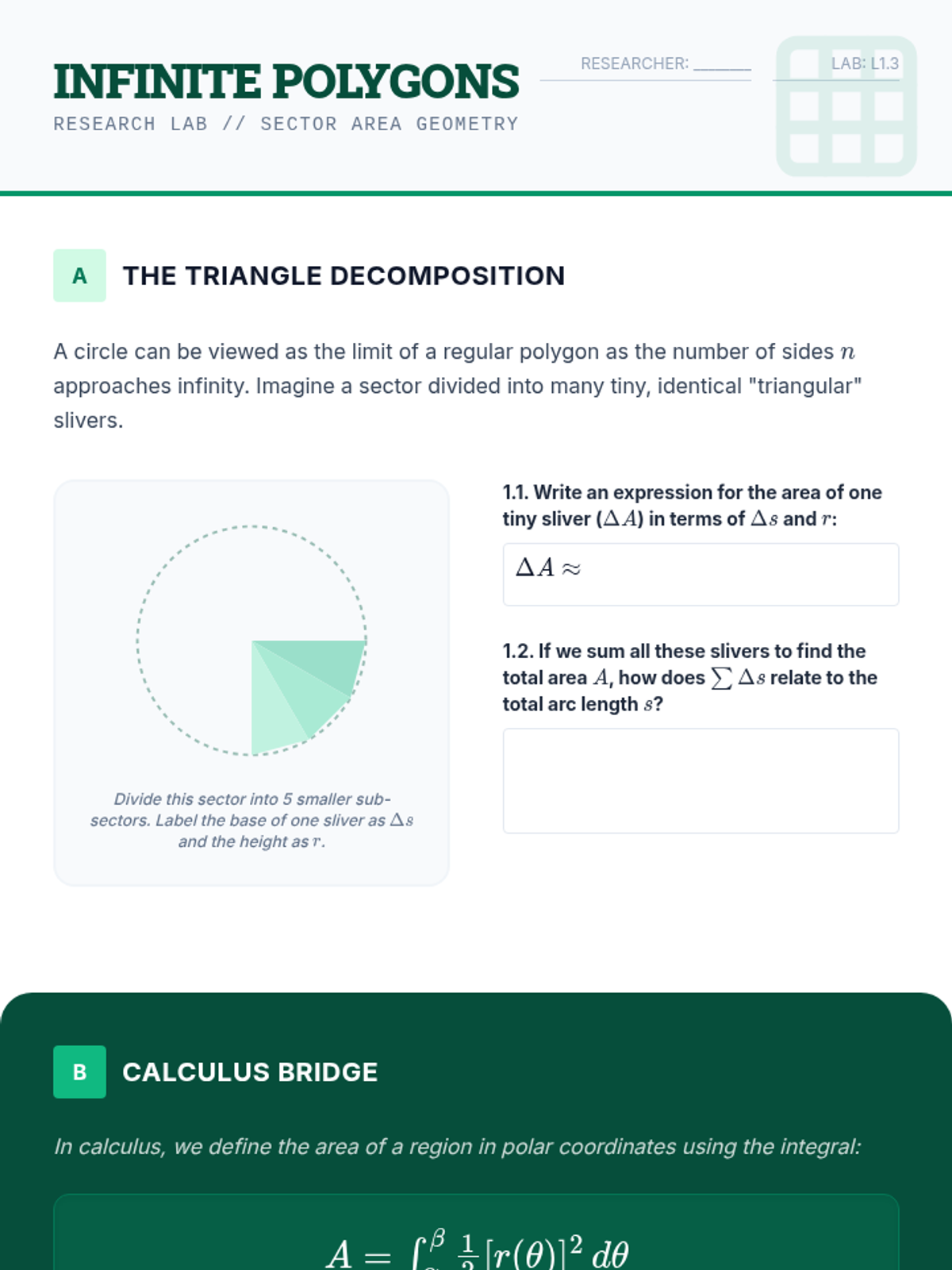 This undergraduate sequence explores the transition from degree-based geometry to the more 'natural' radian measure, focusing on the derivation of arc length and sector area formulas through proportional reasoning. Students will connect these geometric concepts to calculus preparation, analyze engineering errors, and perform formal abstract proofs.