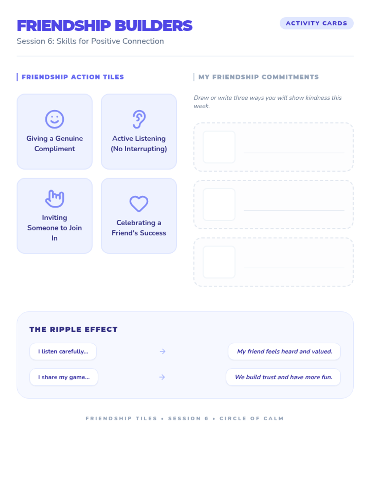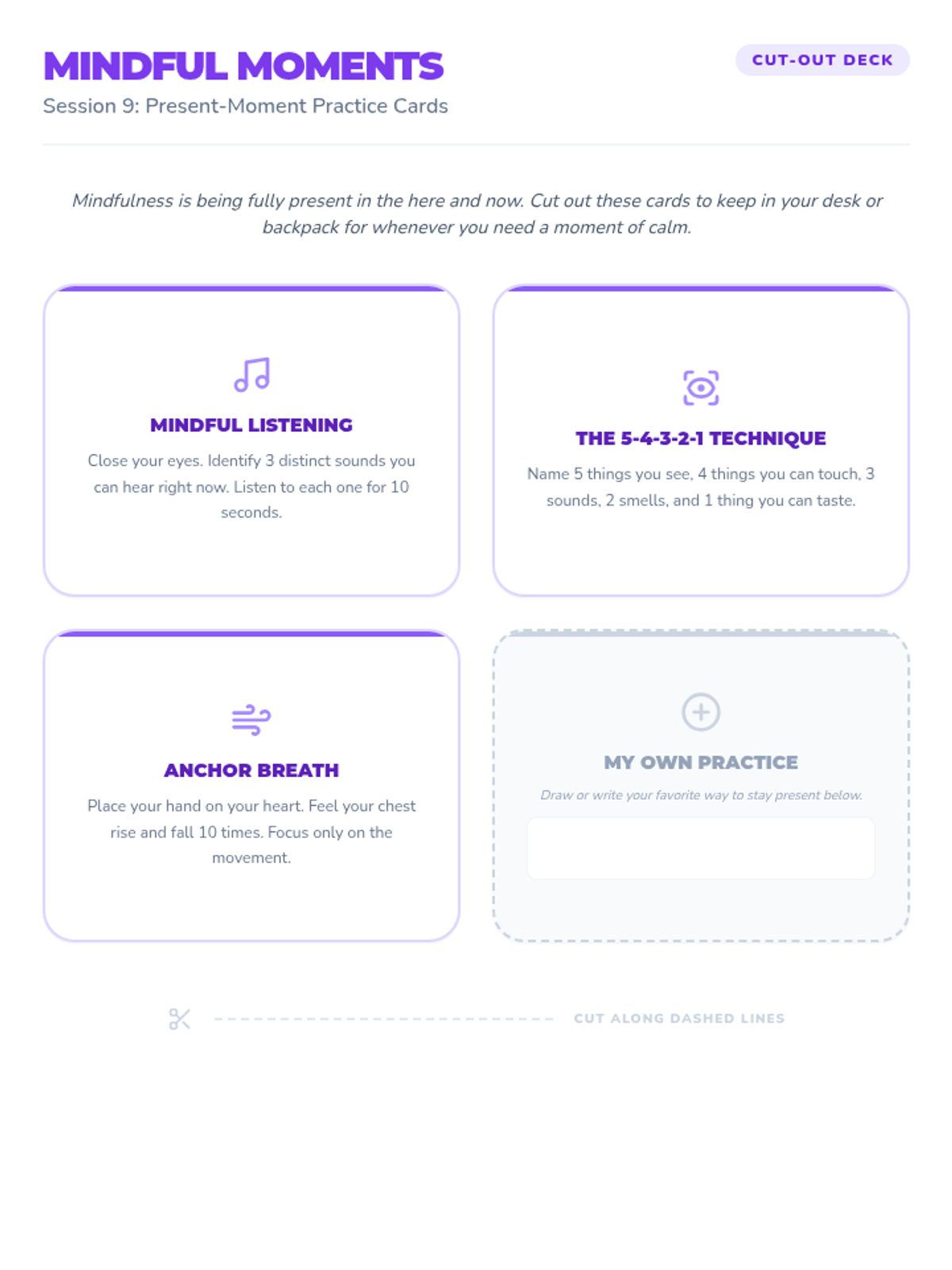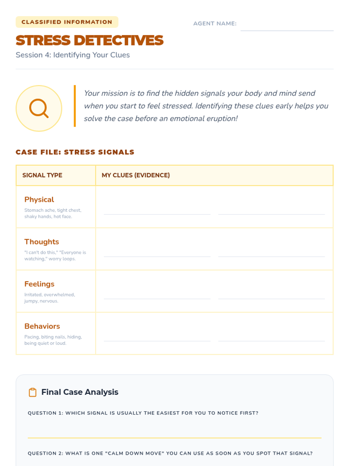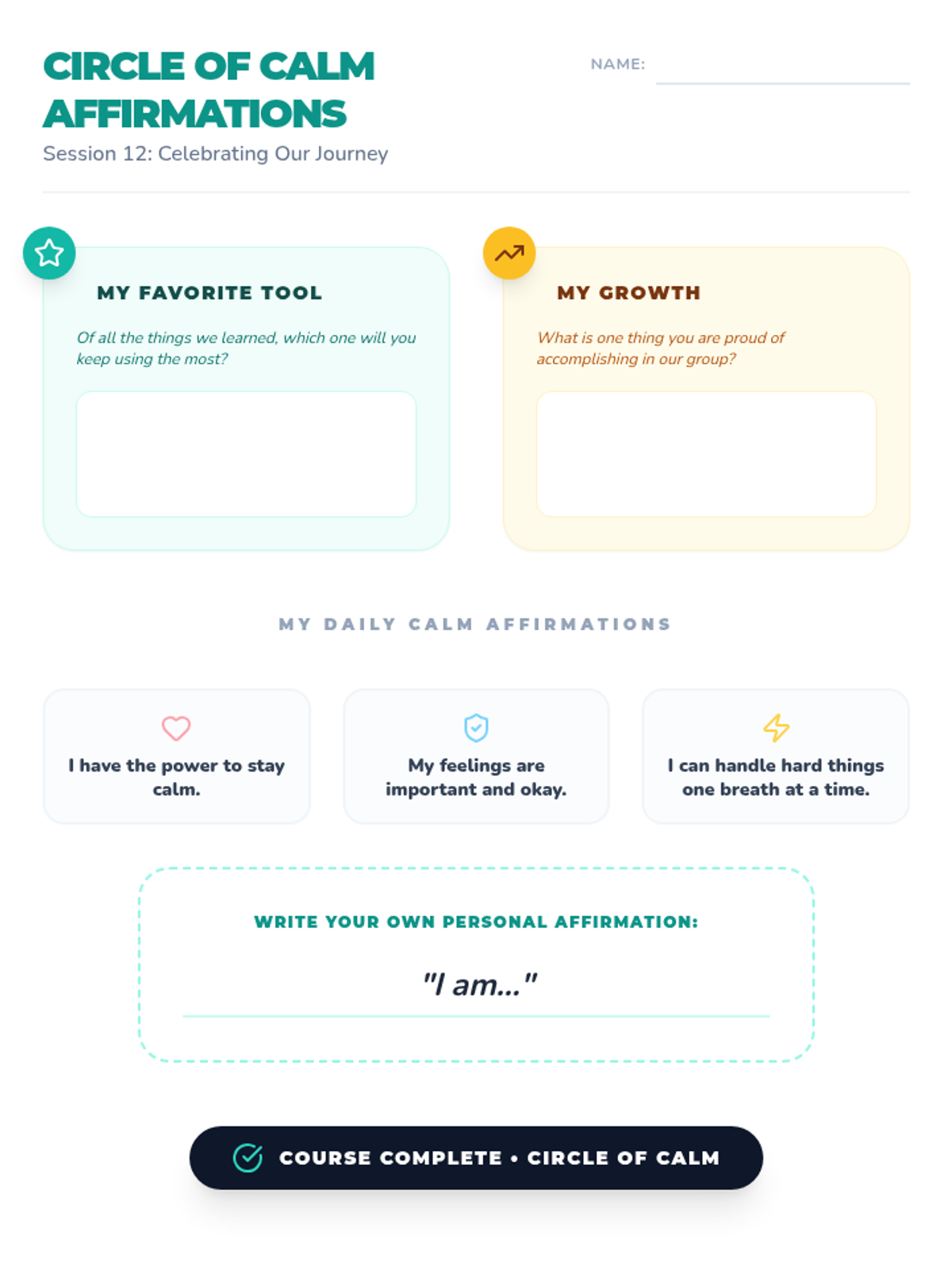 A 6-session counseling group designed to help students identify triggers, understand physical symptoms of anxiety, and build a personalized toolkit of coping strategies through a 'Calm Explorer' theme.