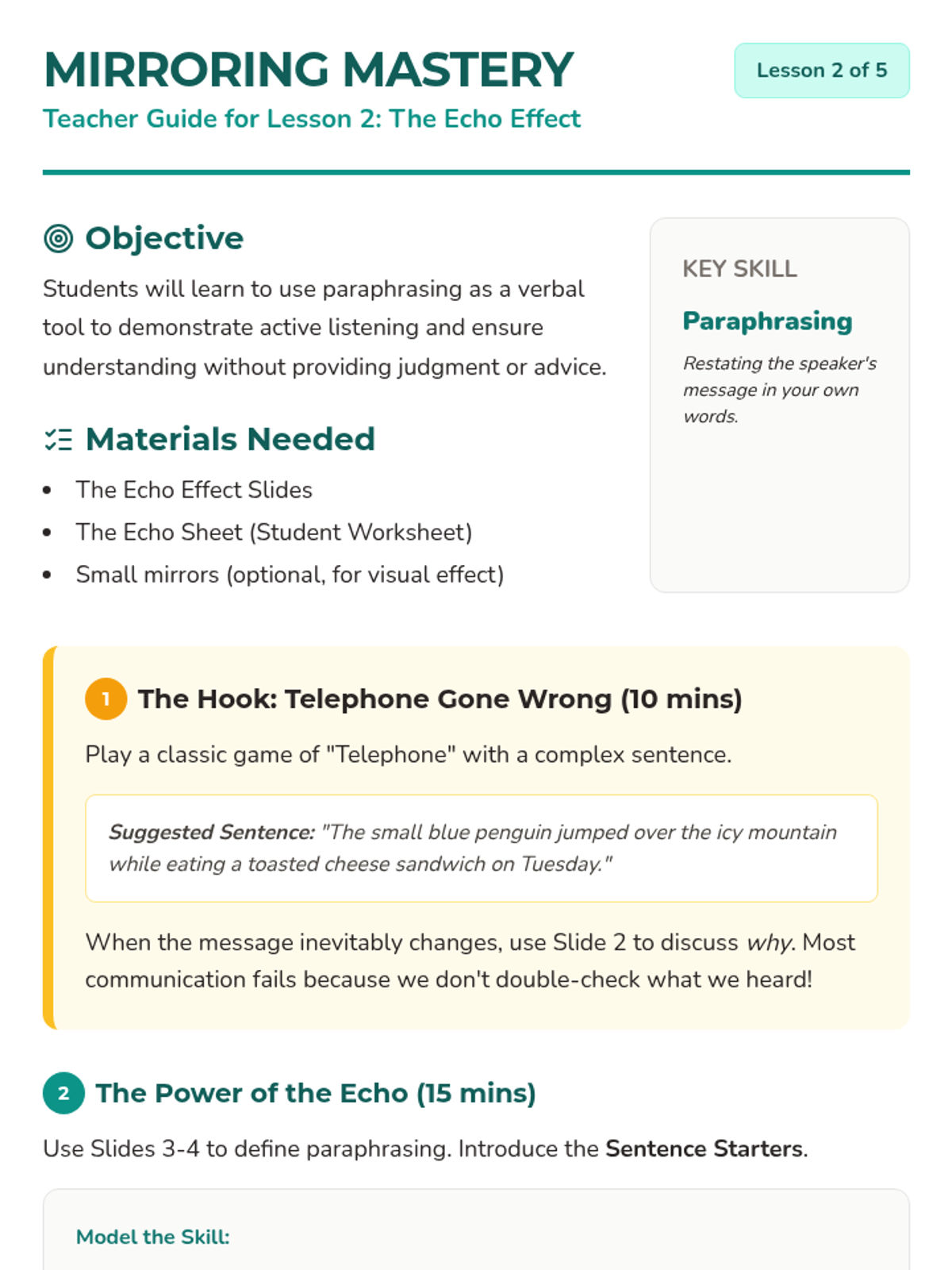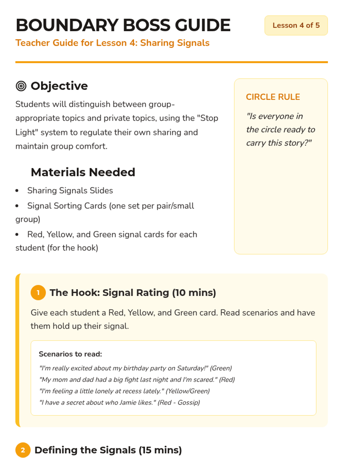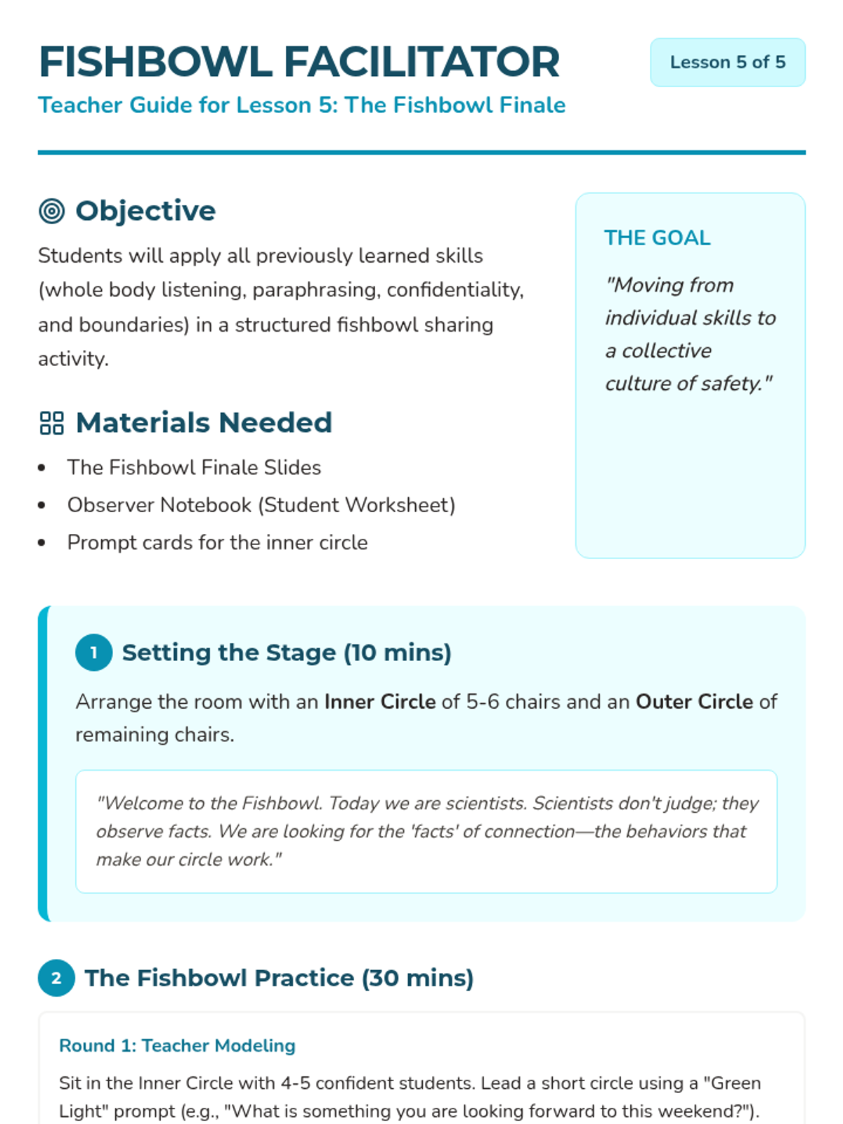 A 5-lesson sequence for 4th graders focused on active listening, paraphrasing, confidentiality, and group boundaries to create a safe sharing environment. Students progress from individual body regulation to collective group trust and practical application in a fishbowl setting.