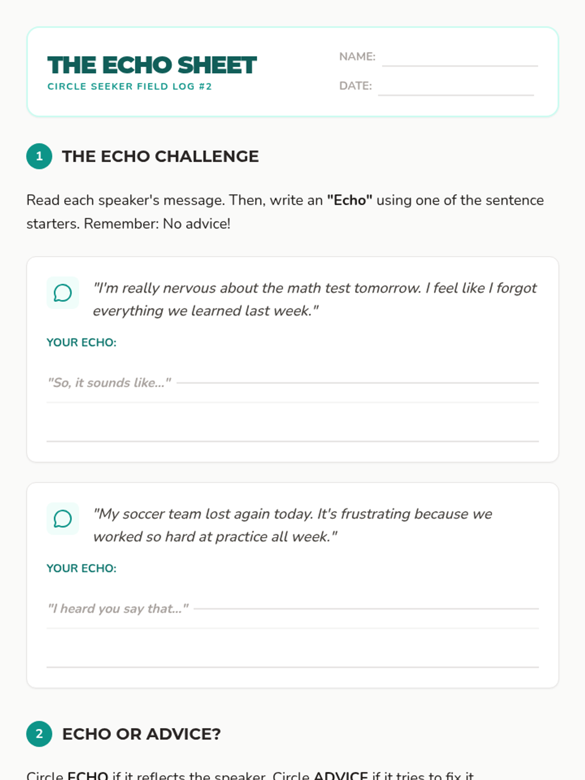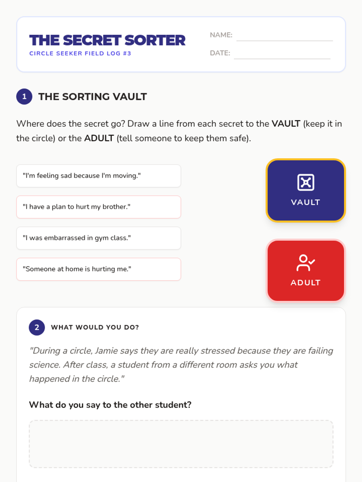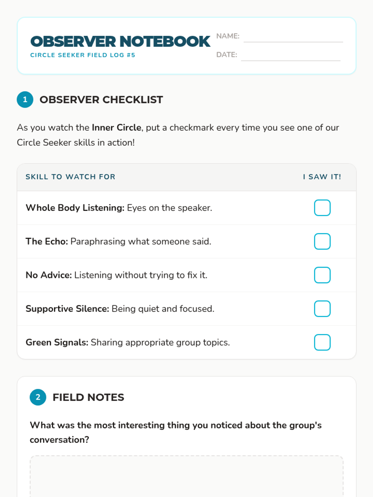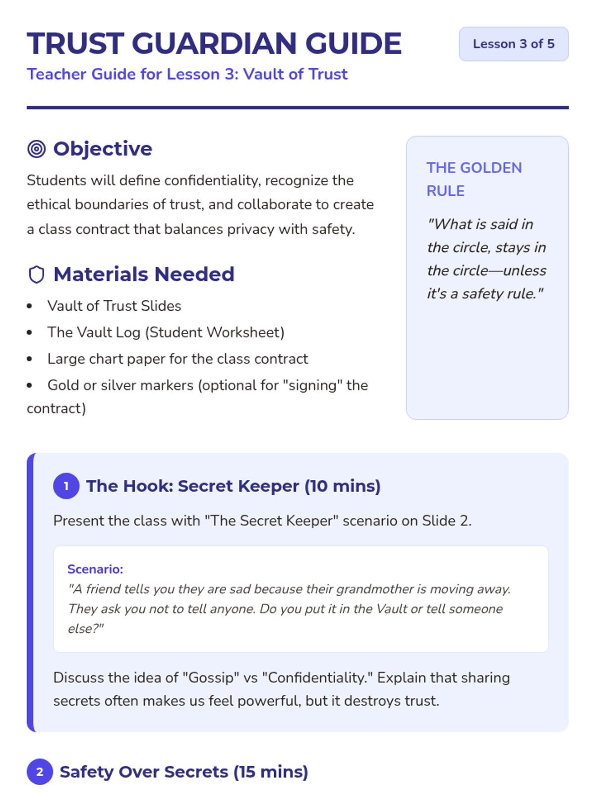 A 5-lesson sequence for 4th graders focused on active listening, paraphrasing, confidentiality, and group boundaries to create a safe sharing environment. Students progress from individual body regulation to collective group trust and practical application in a fishbowl setting.