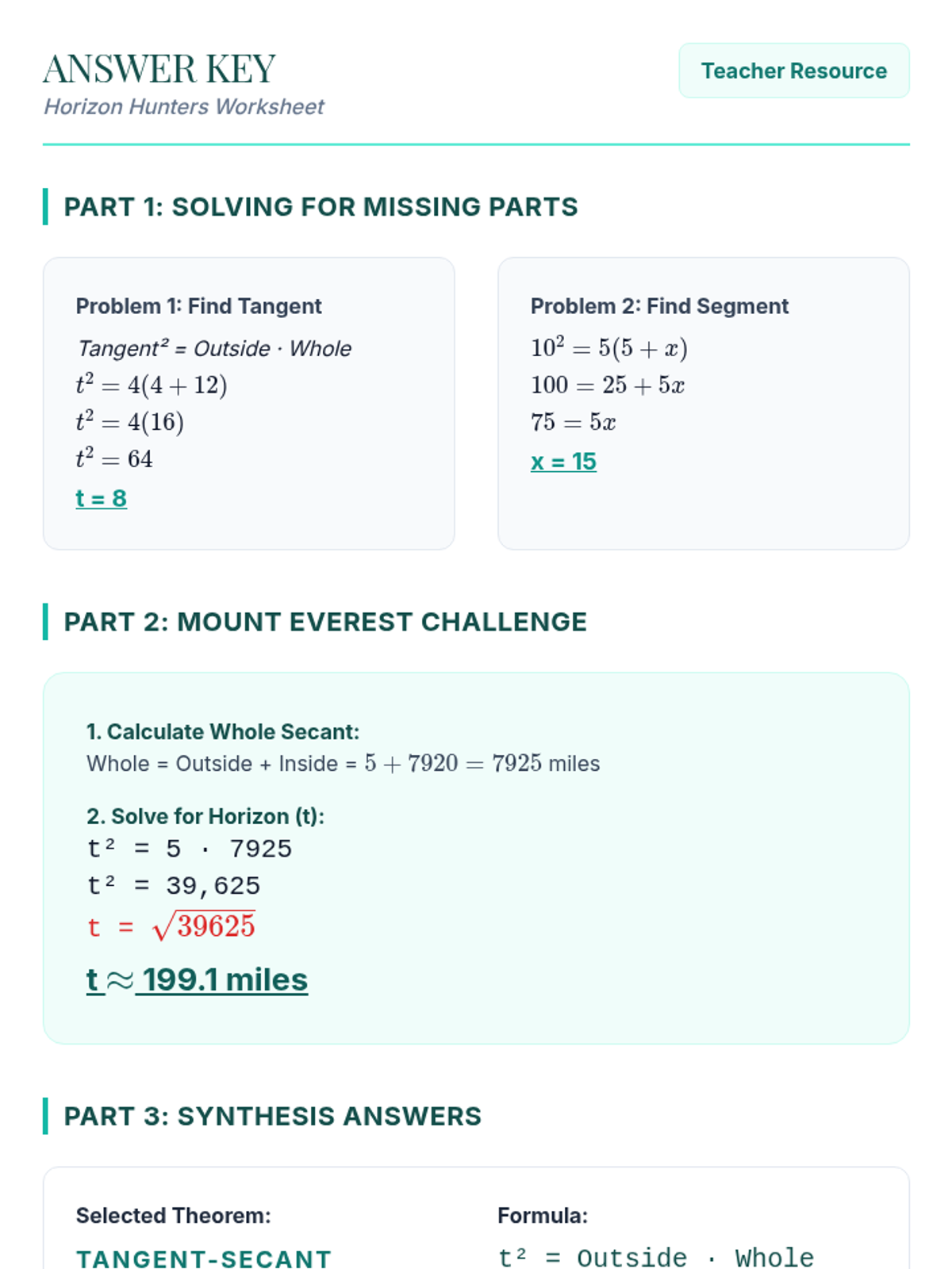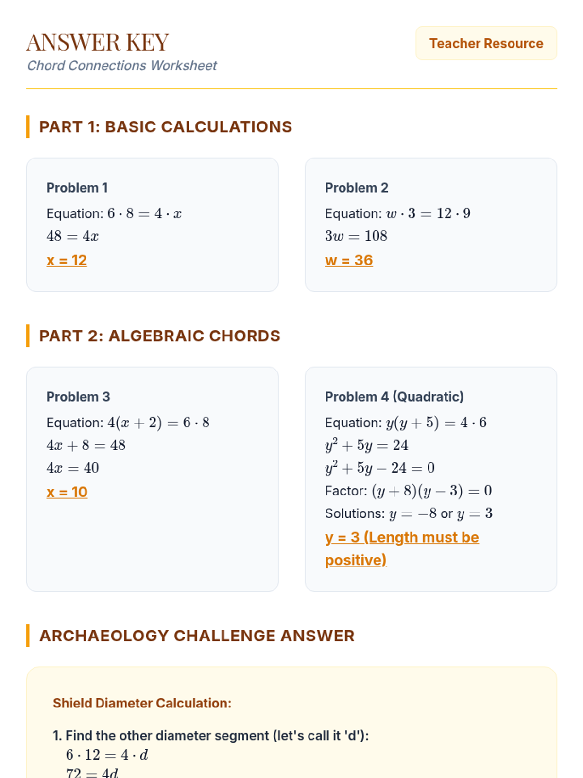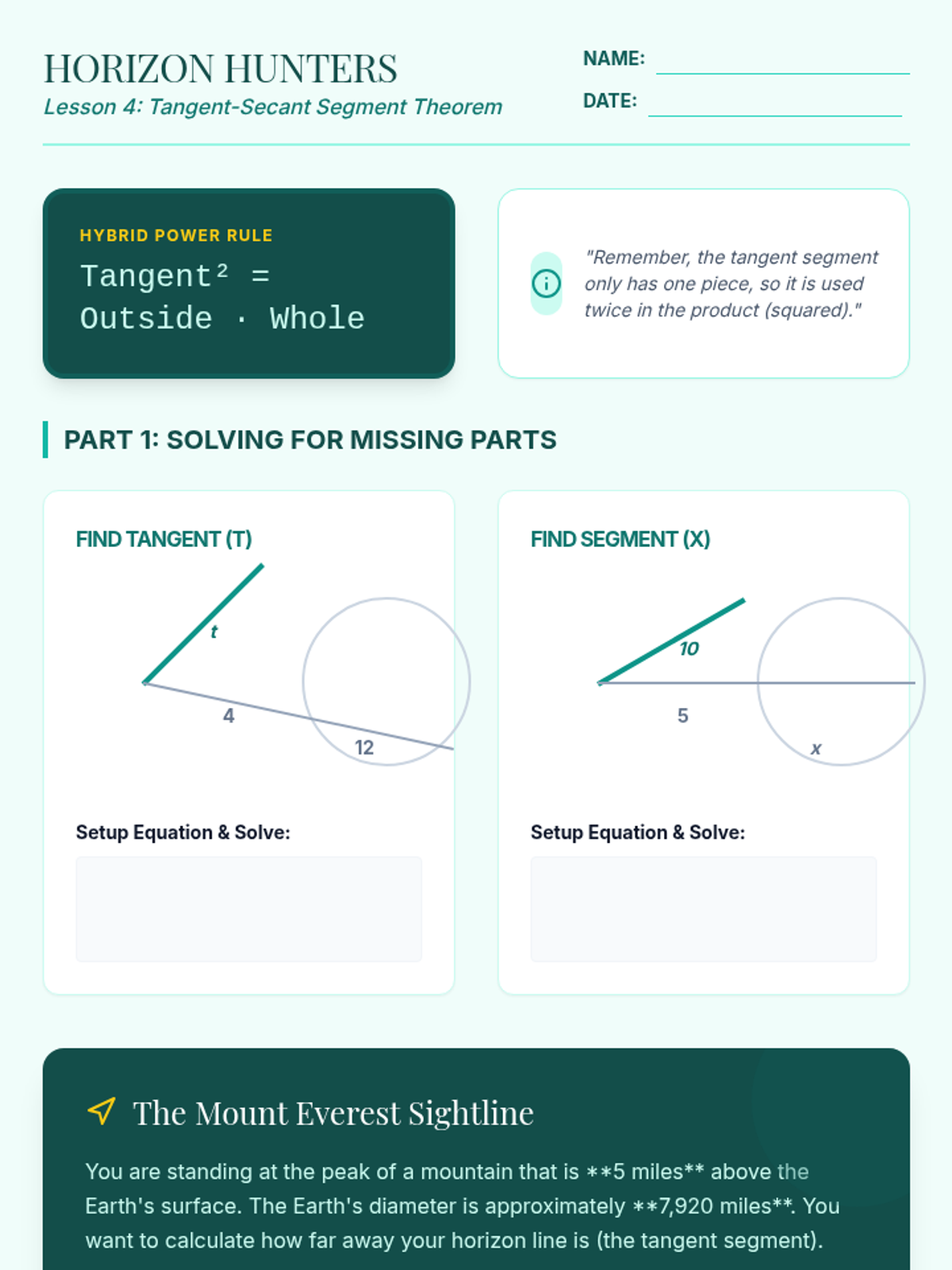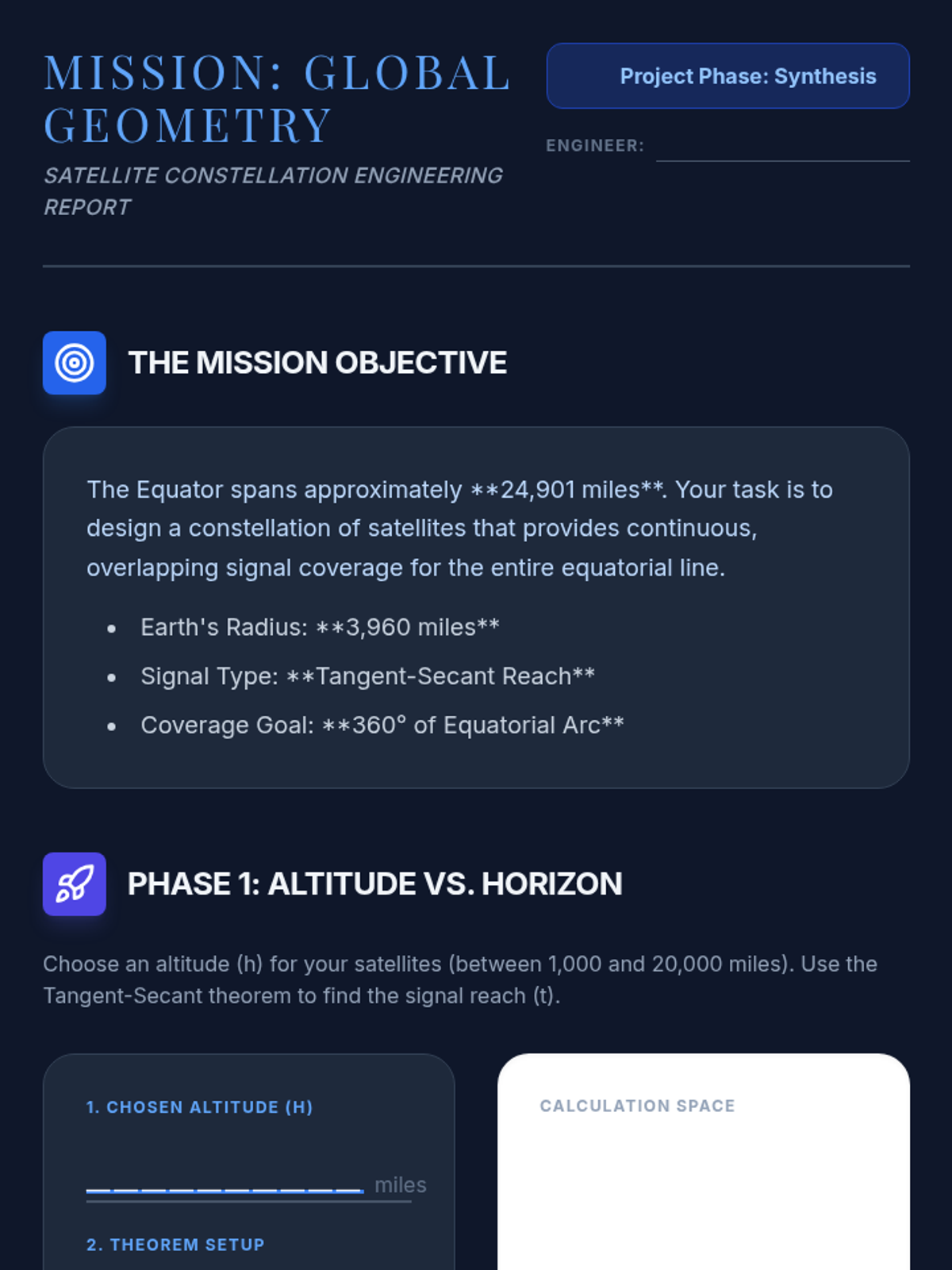 This sequence explores the metric relationships of segments in circles, including chords, secants, and tangents. Students progress from basic tangent properties to complex 'Power of a Point' theorems, culminating in a real-world modeling project.