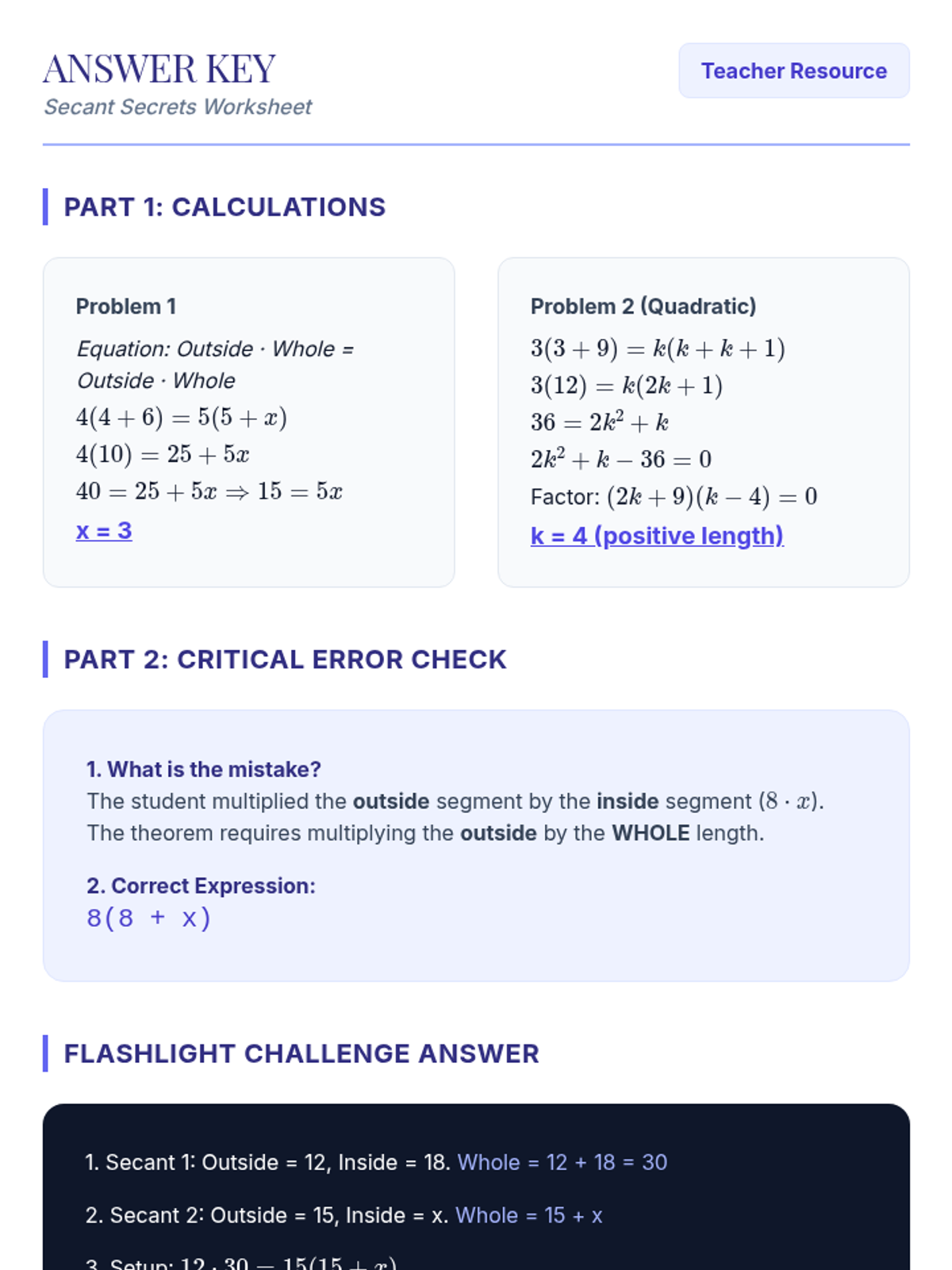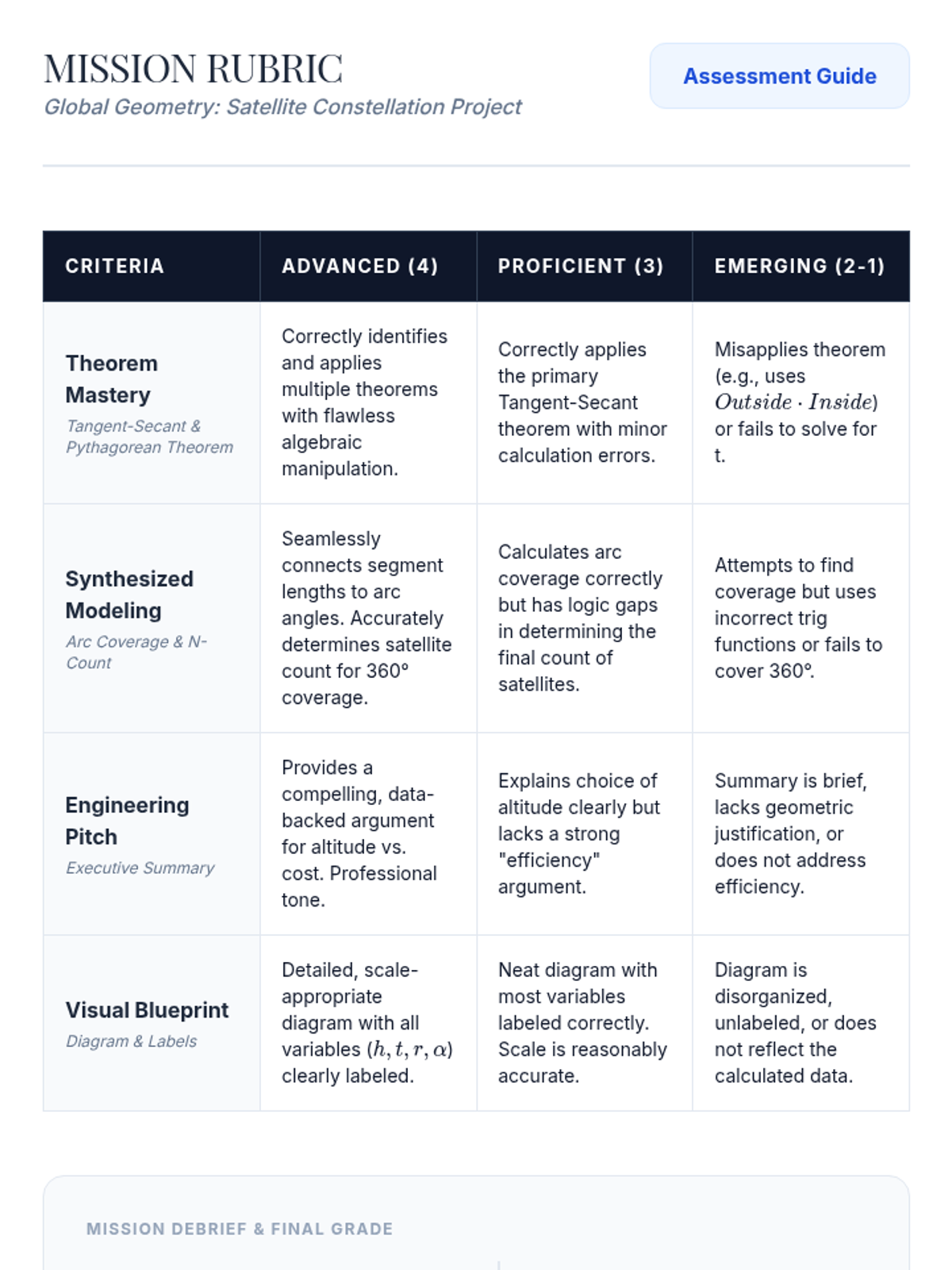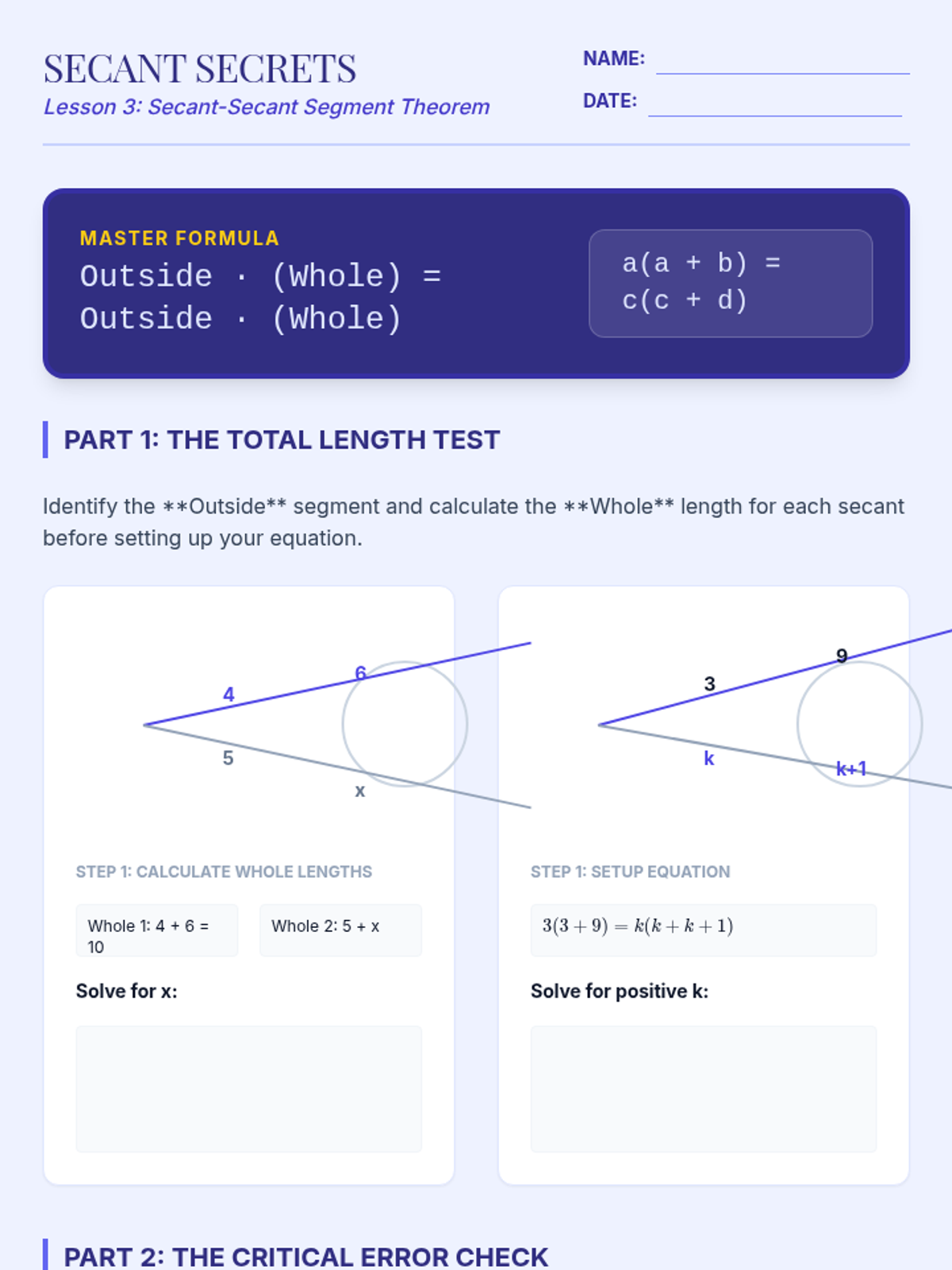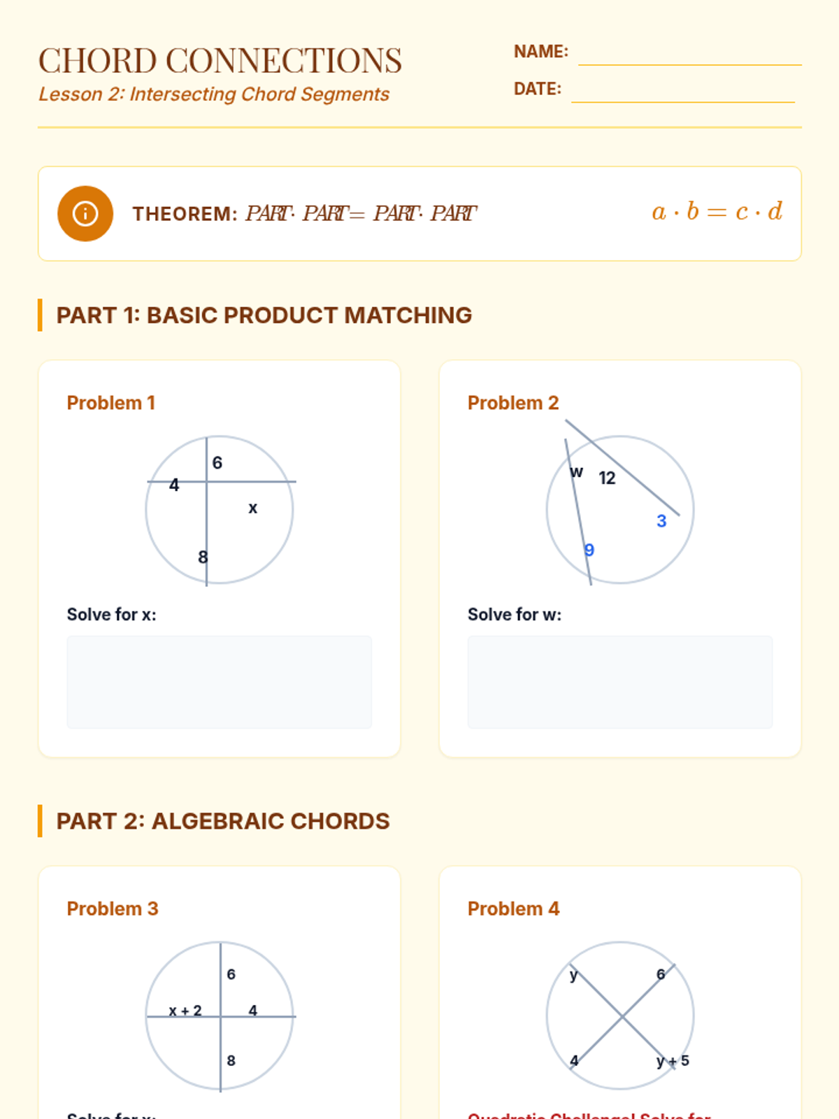 This sequence explores the metric relationships of segments in circles, including chords, secants, and tangents. Students progress from basic tangent properties to complex 'Power of a Point' theorems, culminating in a real-world modeling project.