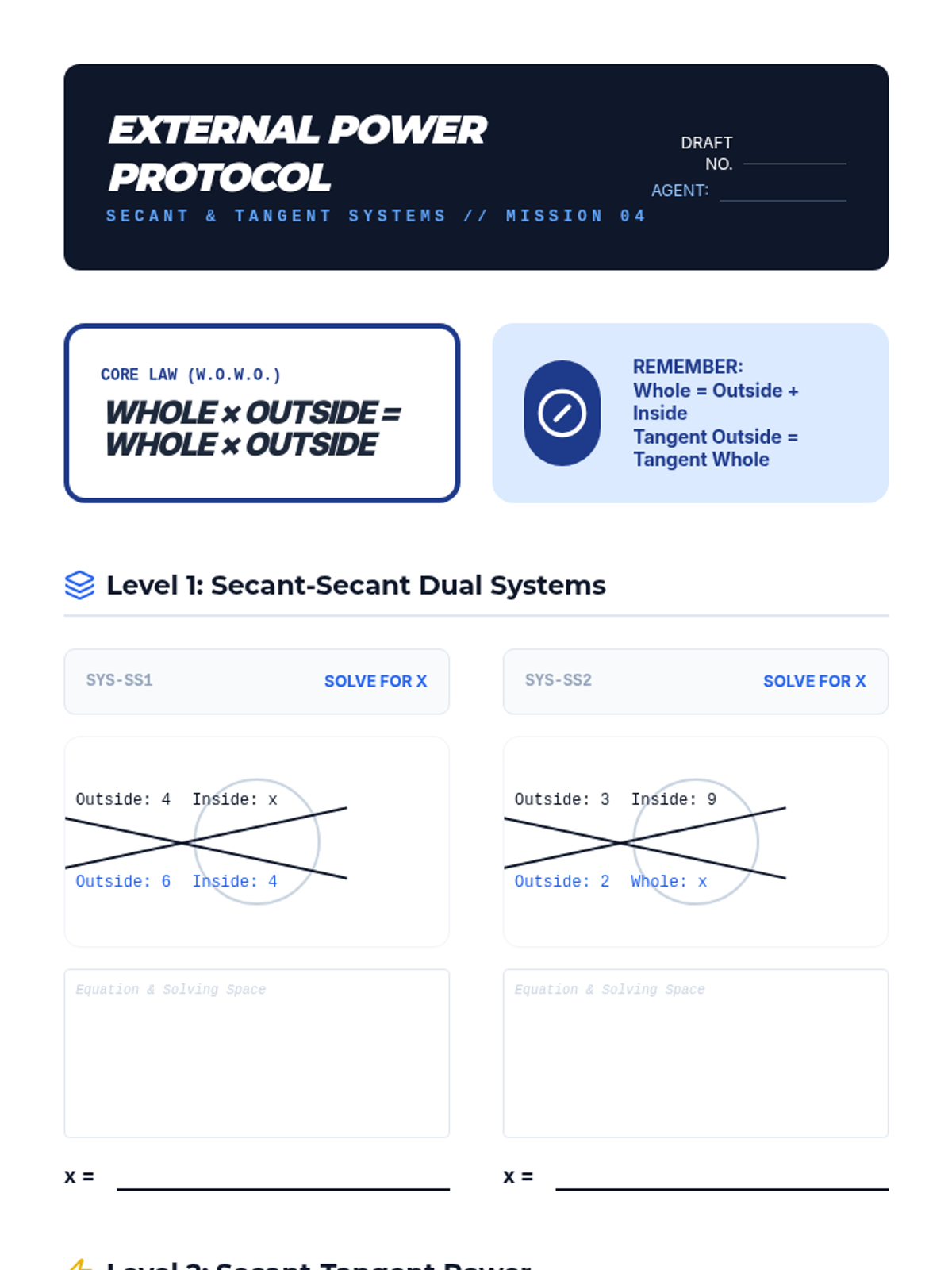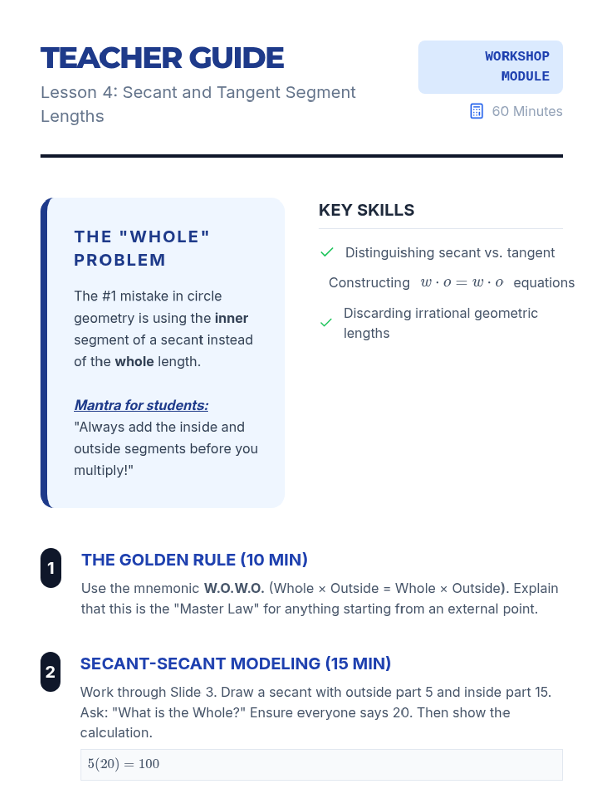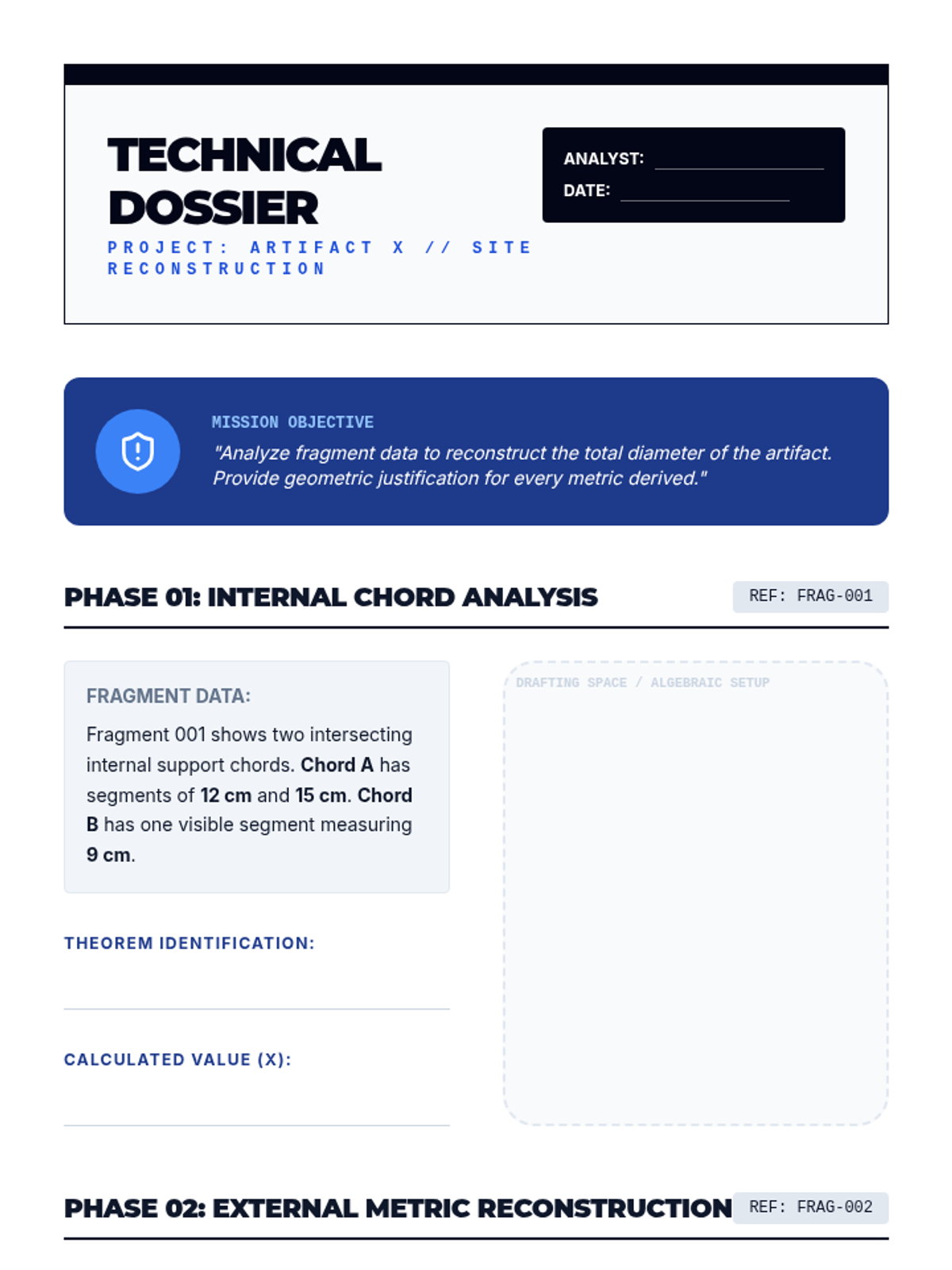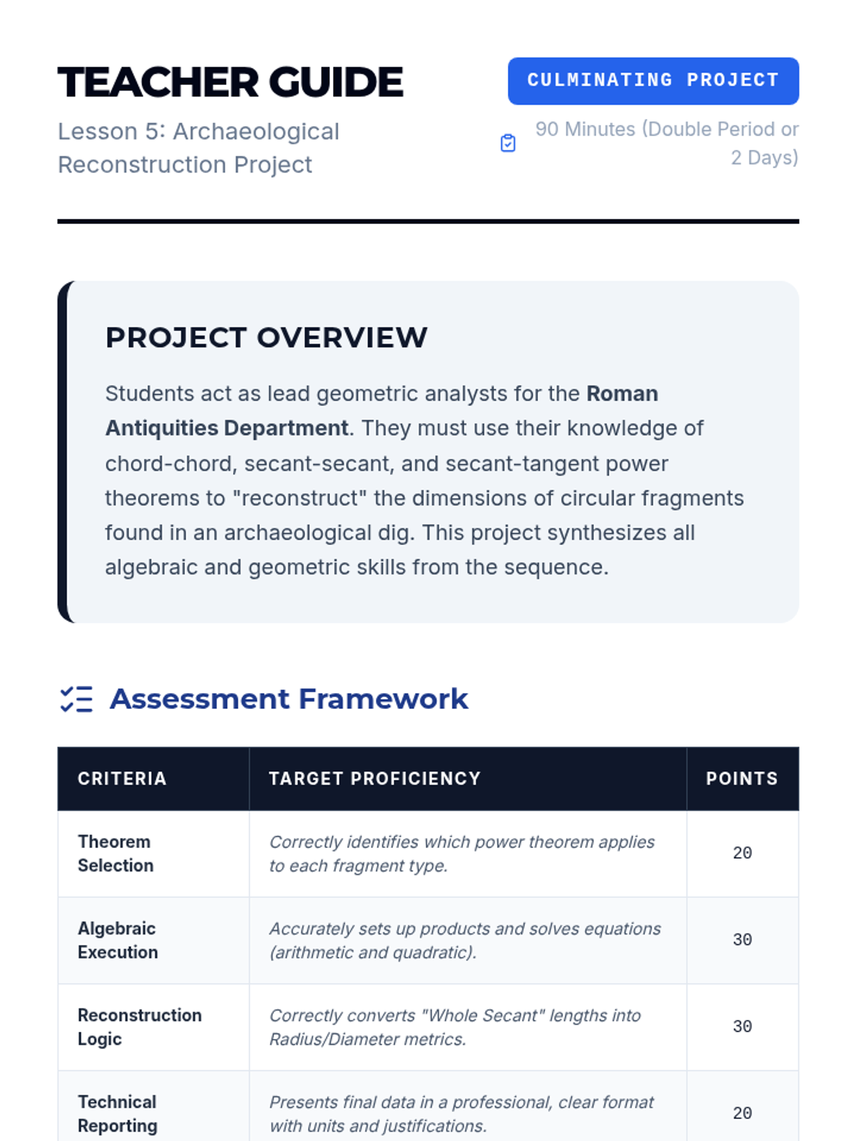 This sequence explores the metric properties of circles, specifically segment lengths formed by tangents, chords, and secants. Students progress from basic tangent properties to complex 'Power of a Point' theorems, culminating in a real-world archaeological reconstruction project.