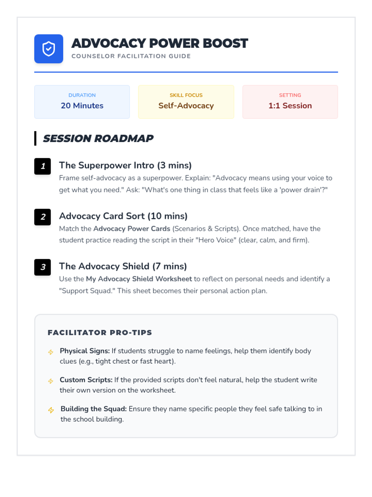 An 8-week social-emotional learning curriculum designed for 20-minute sessions. Students learn to identify, categorize, and apply coping skills through a blueprint-inspired framework of self-regulation.