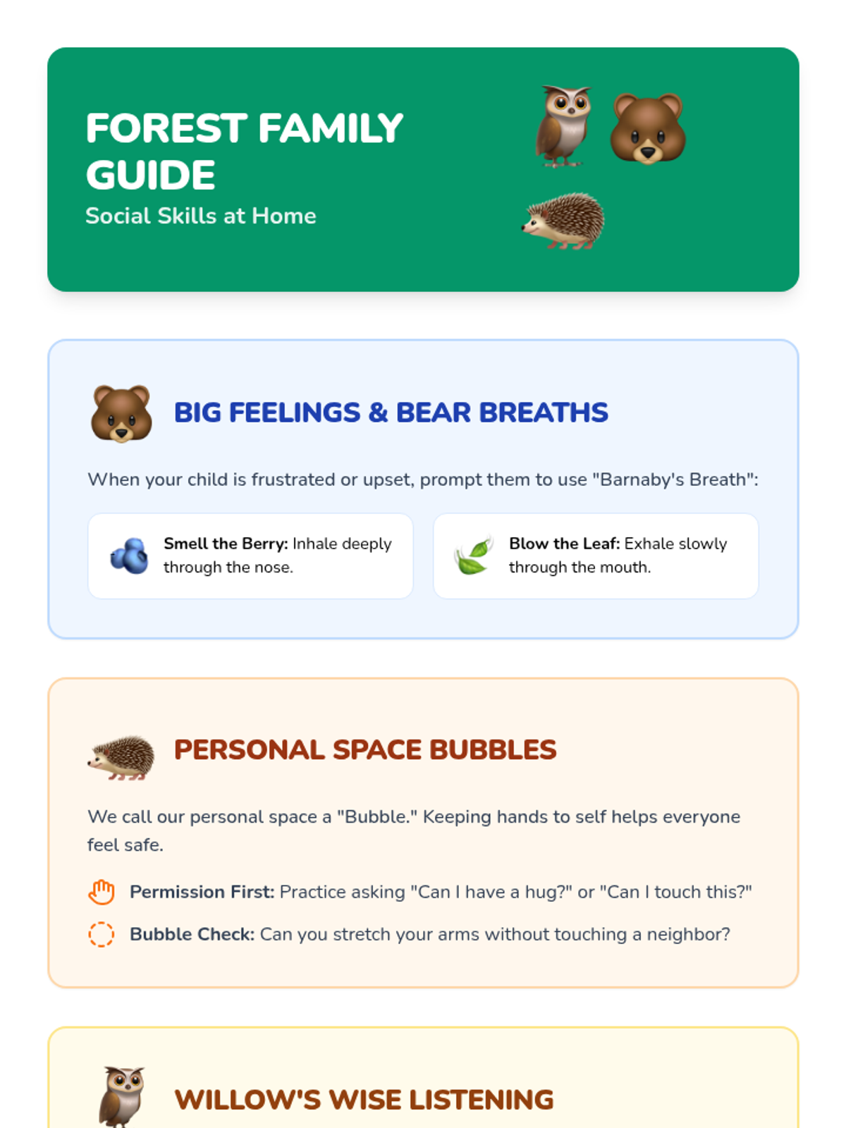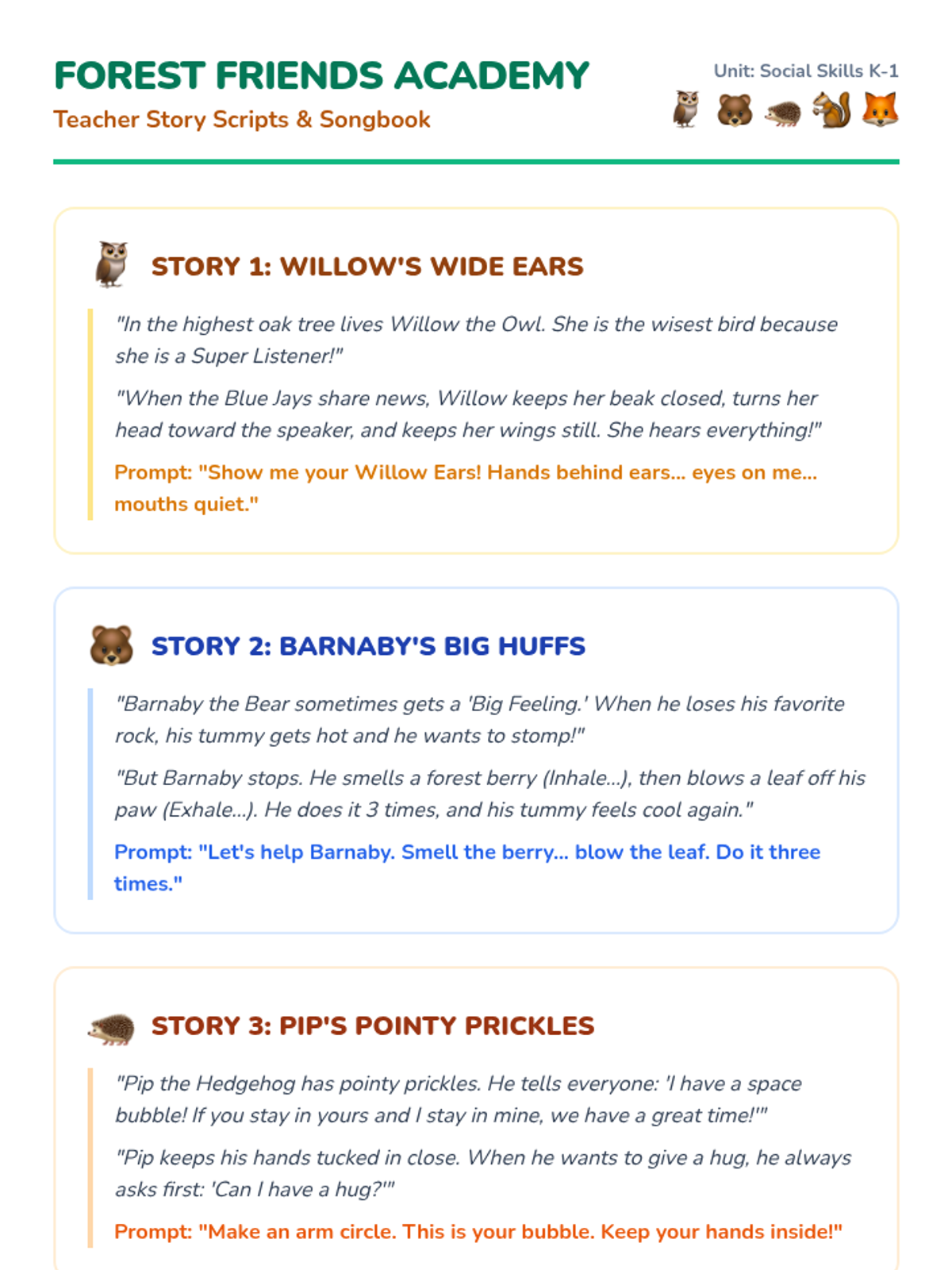 A 6-lesson social skills unit for K-1 students focused on self-regulation, personal space, and social interaction through the theme of forest animal friends. Students learn essential classroom behaviors like listening, deep breathing, and sharing through stories and guided activities.