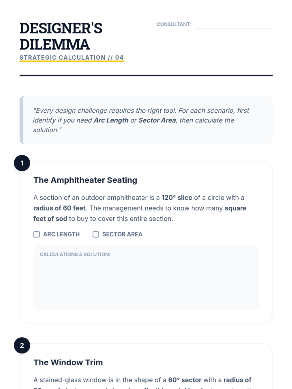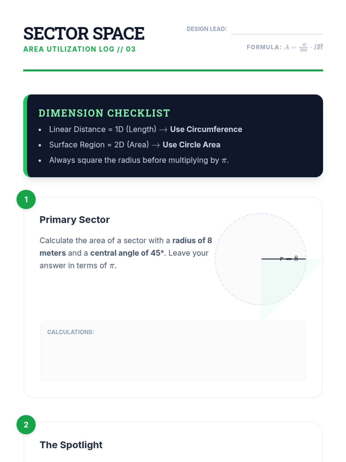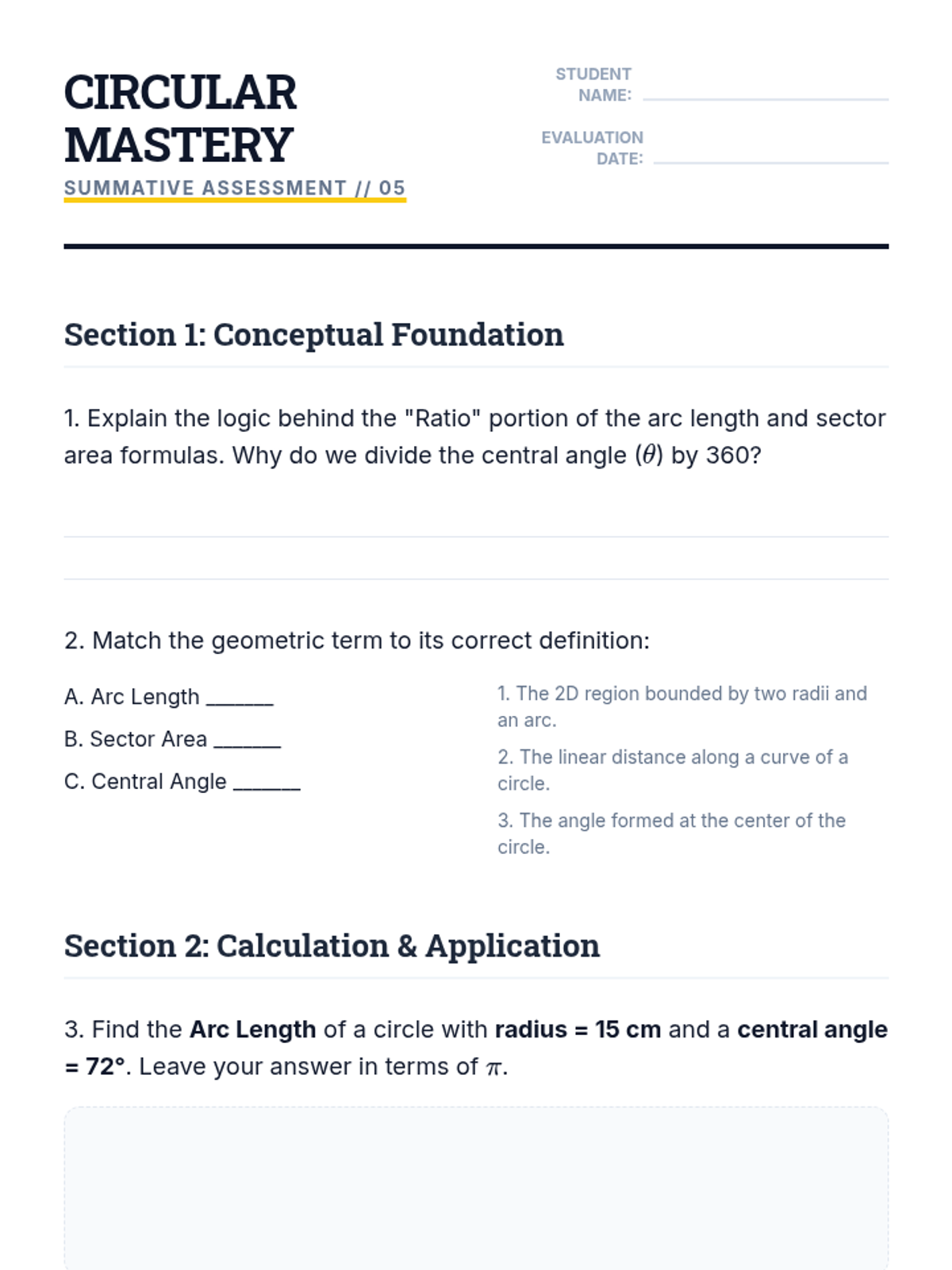 A logical, inquiry-based progression through the derivation and application of arc length and sector area formulas. Students use proportional reasoning to move from 'parts of a whole' to formal geometric expressions.