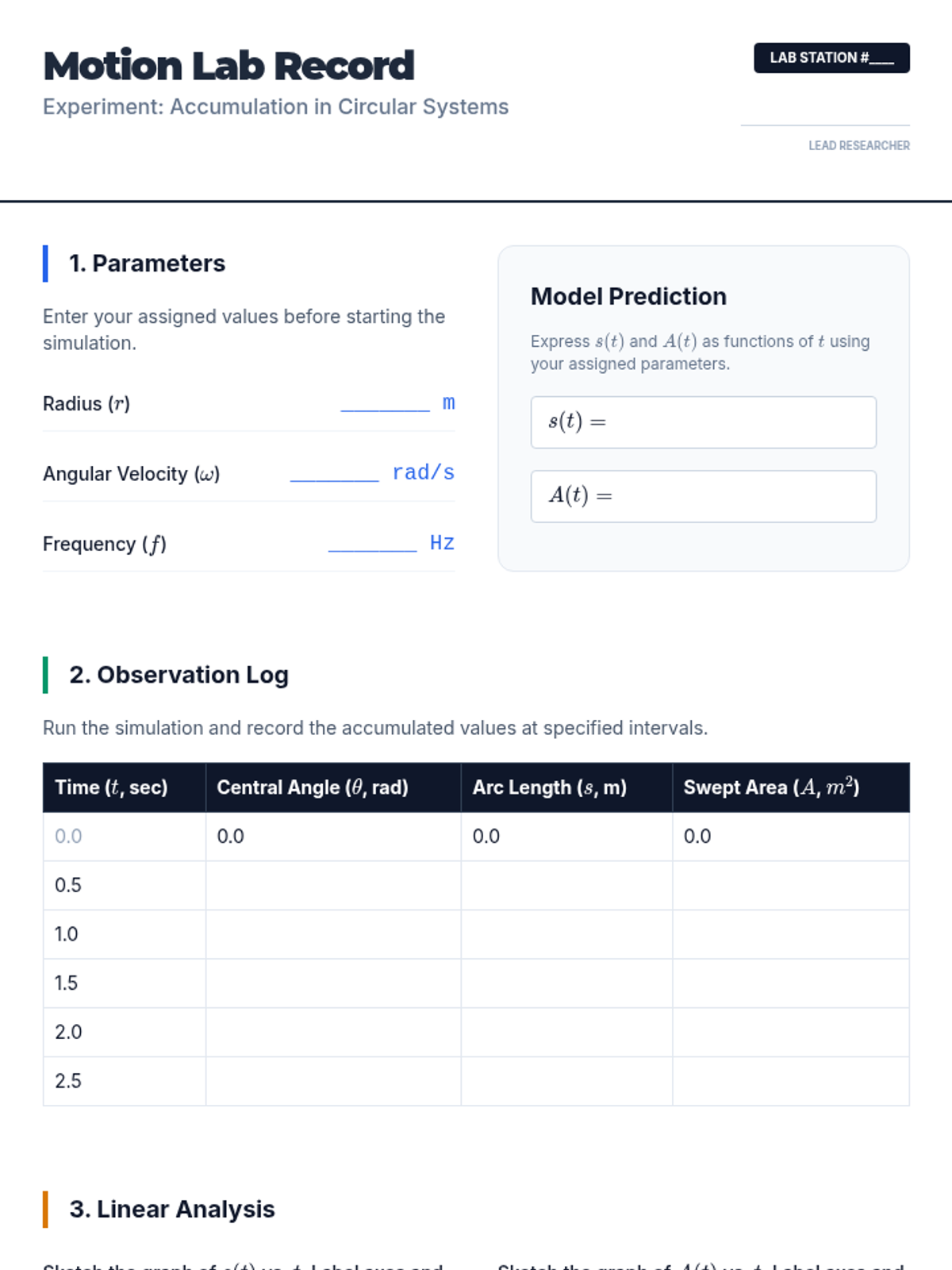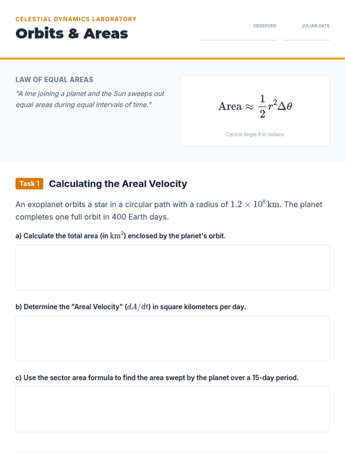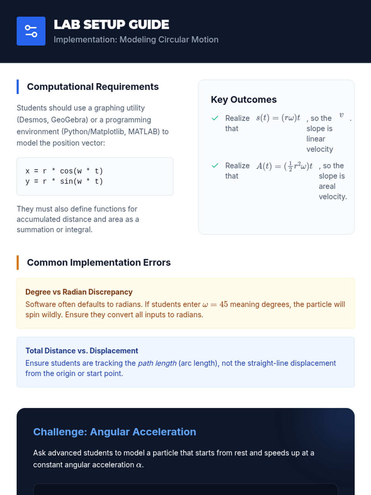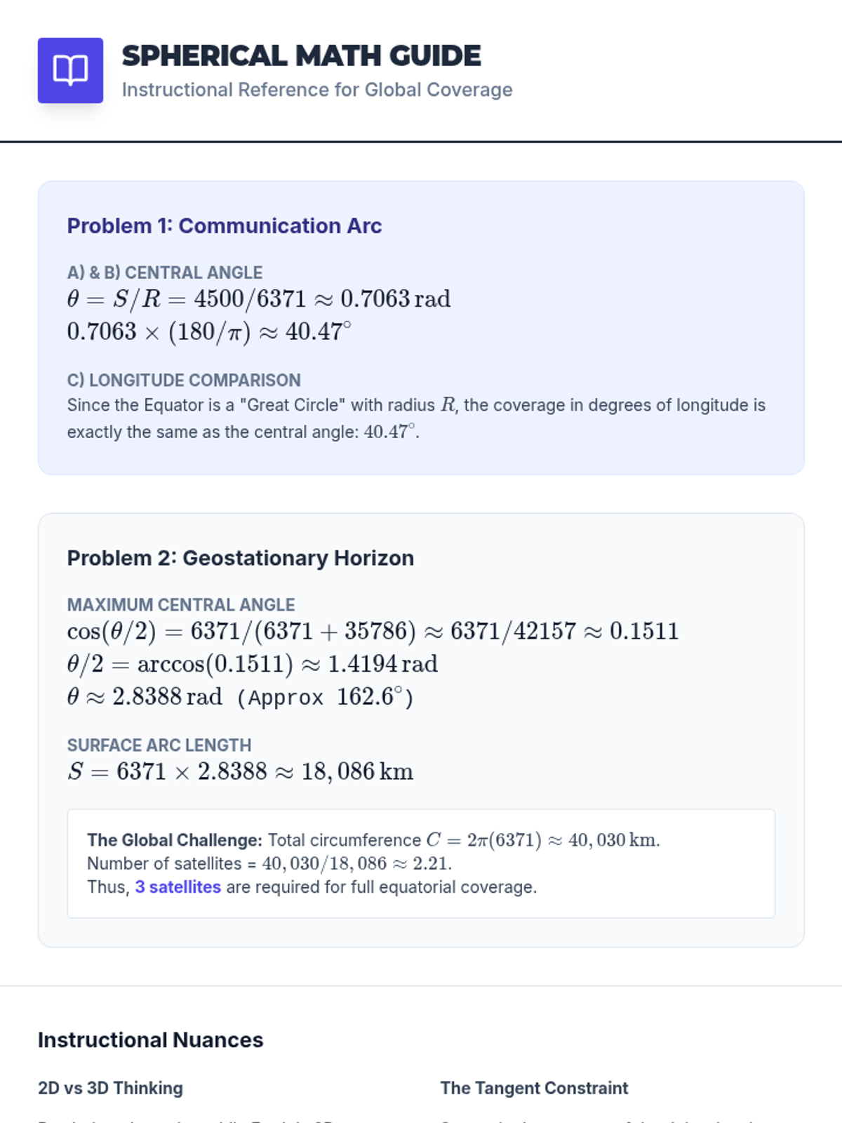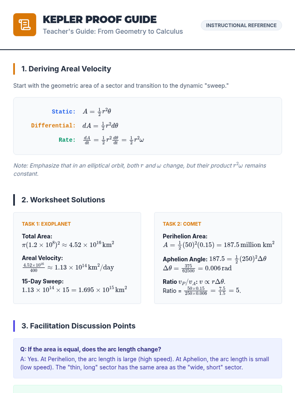 A sophisticated sequence for undergraduate students bridging the gap between static geometry (arc length and sector area) and dynamic circular motion. This unit explores linear and angular velocity, Kepler's Second Law, satellite communication footprints, and visual angles.