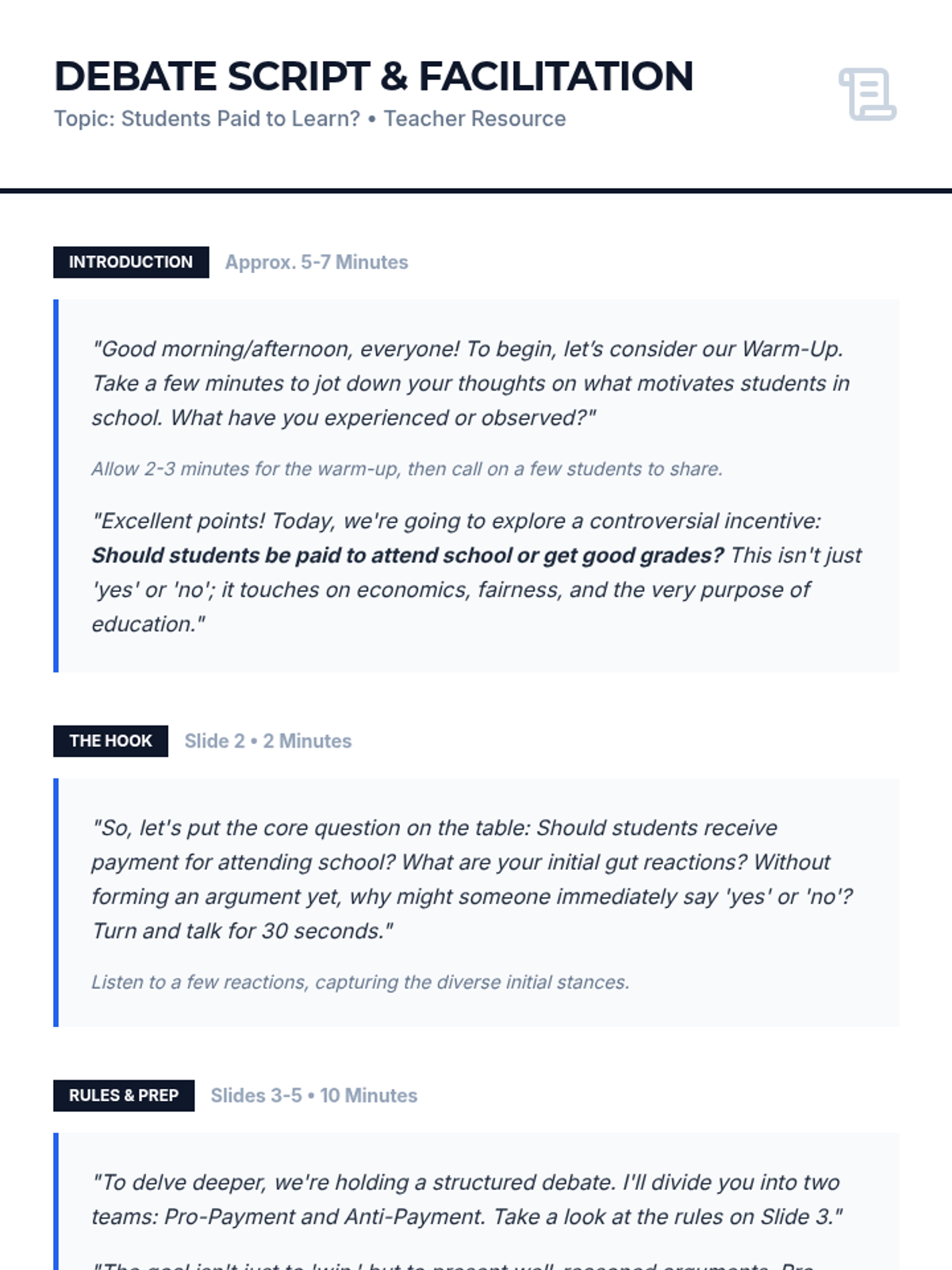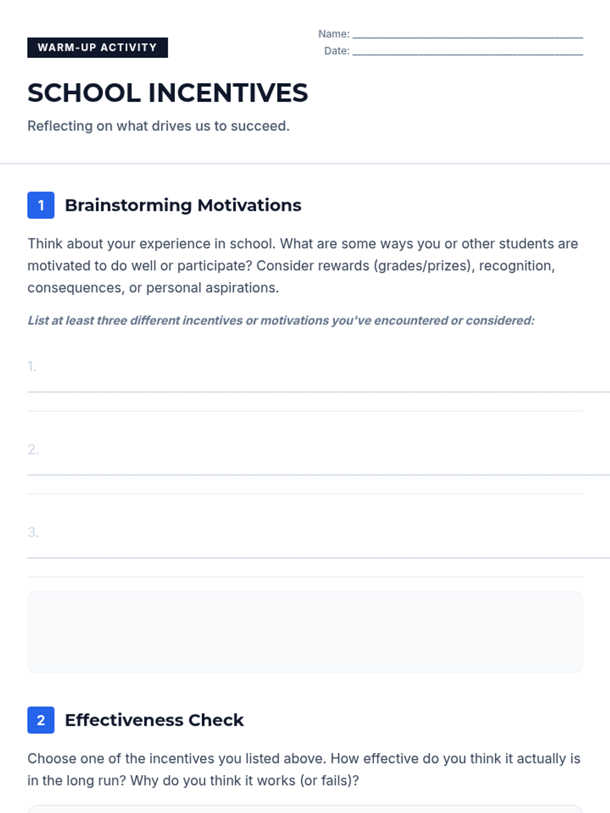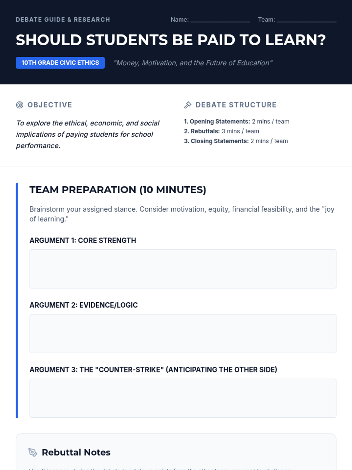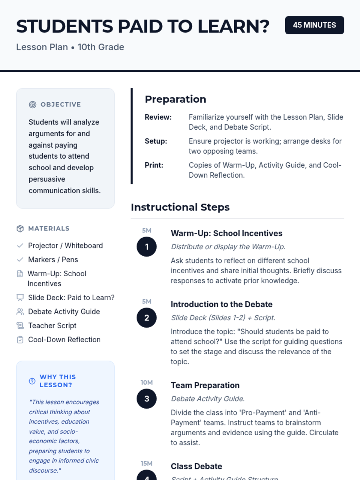 A 10th-grade sequence exploring incentives in education and the responsibilities of global citizenship through structured debate and reflective discussion.