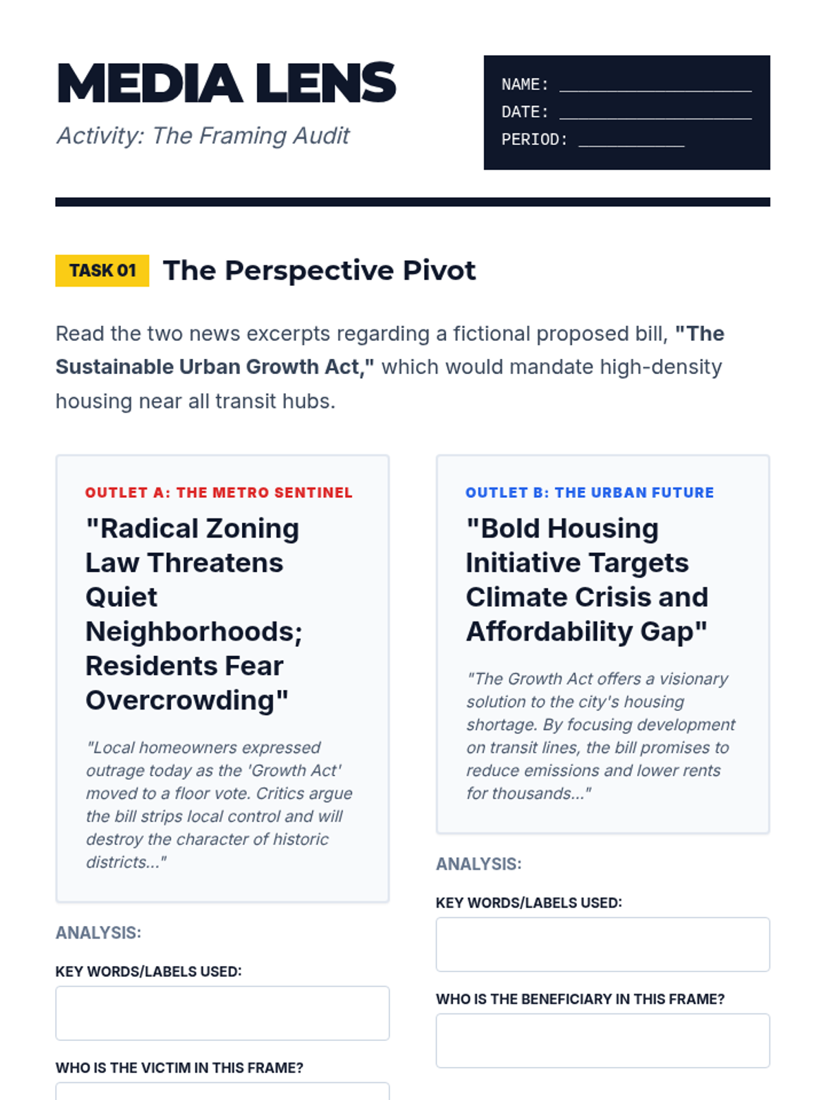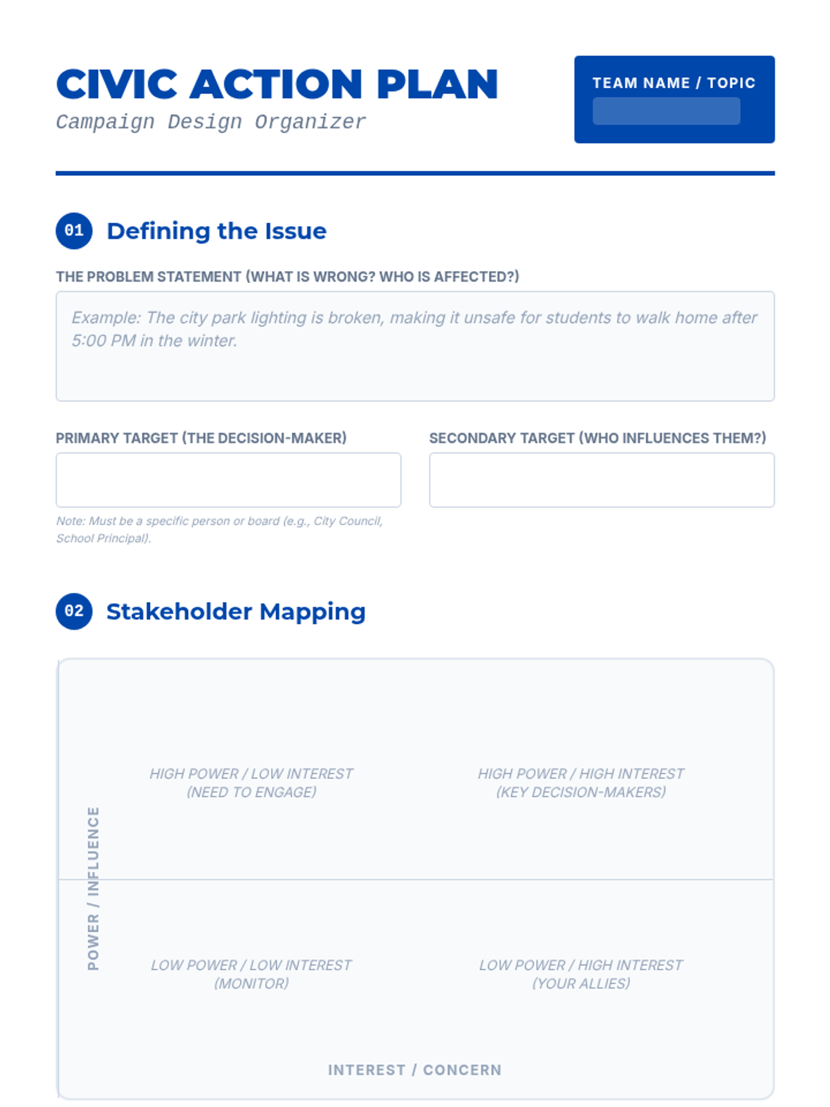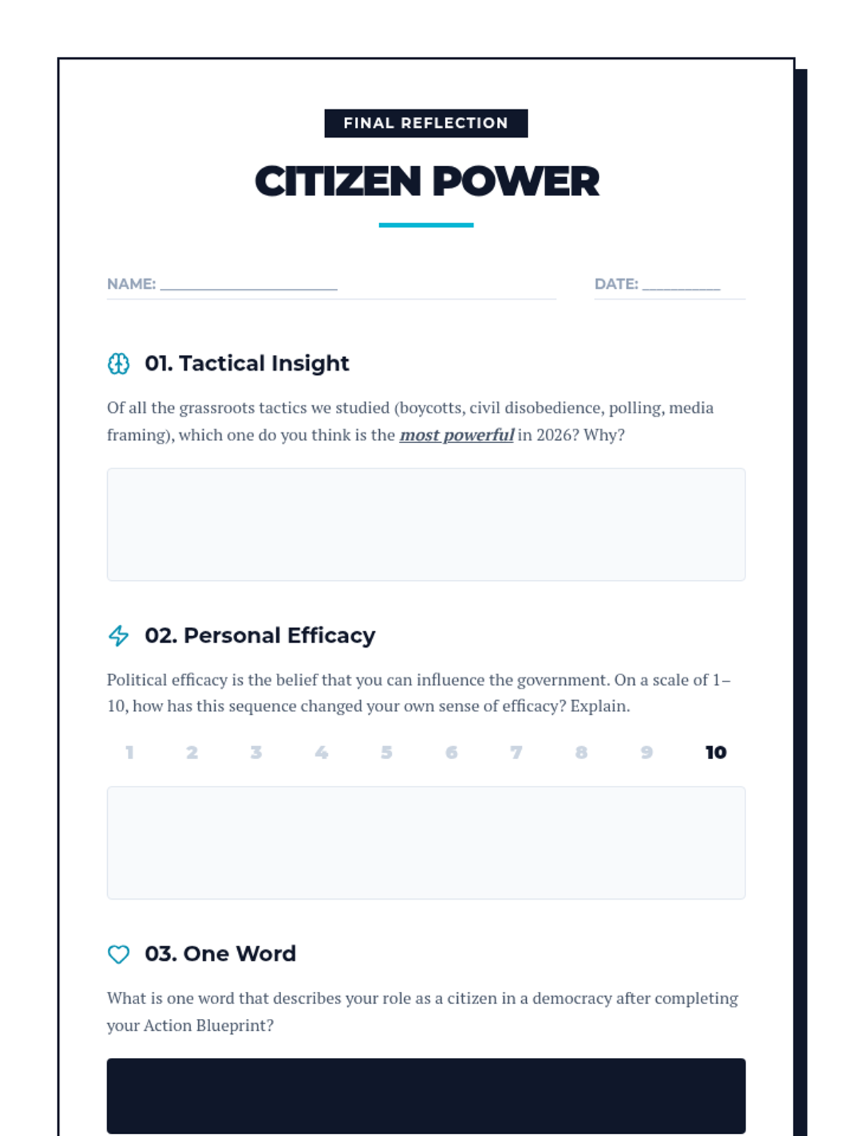 This project-based sequence empowers 11th-grade students to understand and utilize mechanisms of grassroots change and public opinion. It bridges the gap between passive citizenship and active engagement by teaching students how to measure public sentiment, analyze media framing, and organize for a cause through a comprehensive civic action plan.