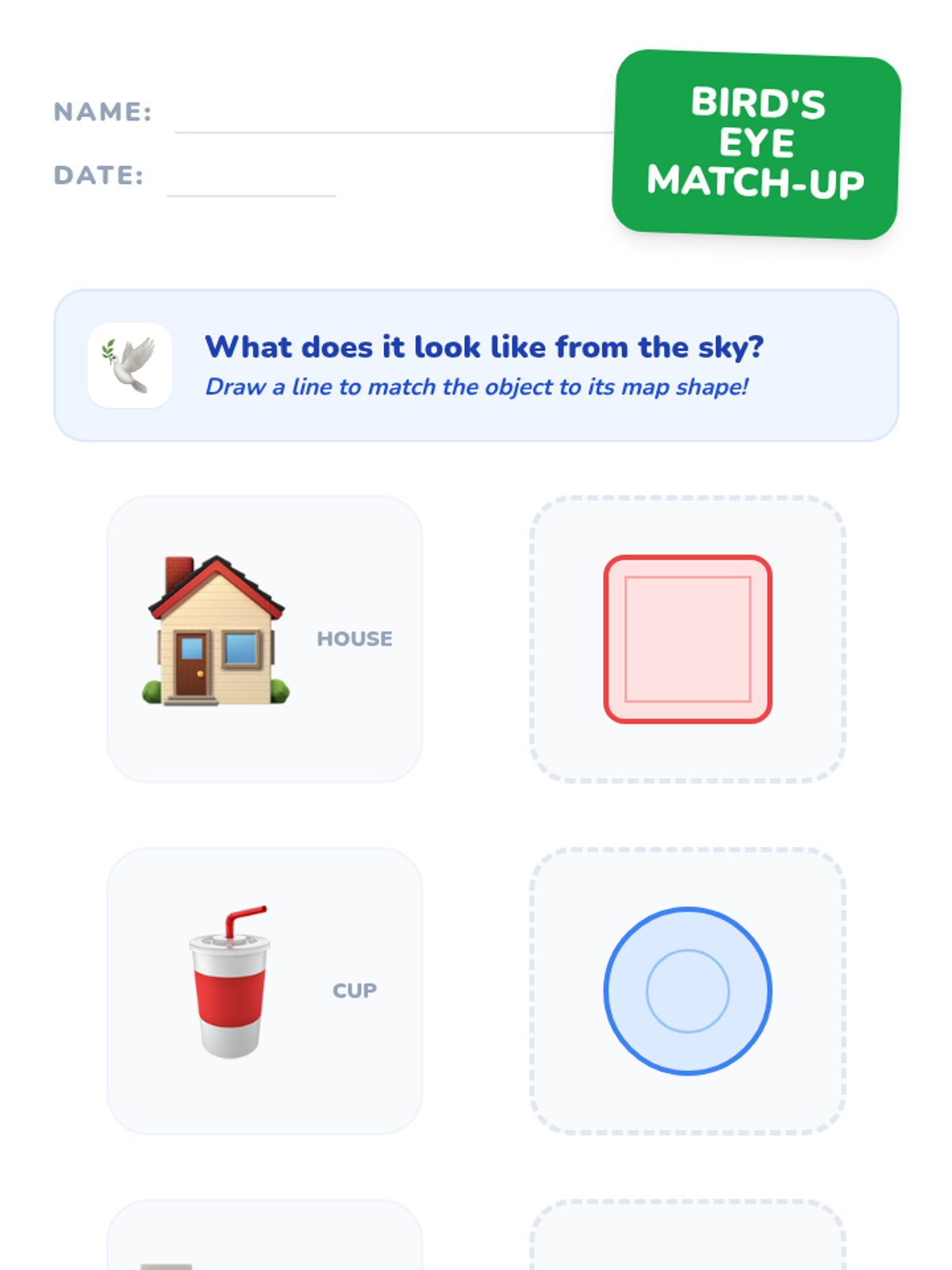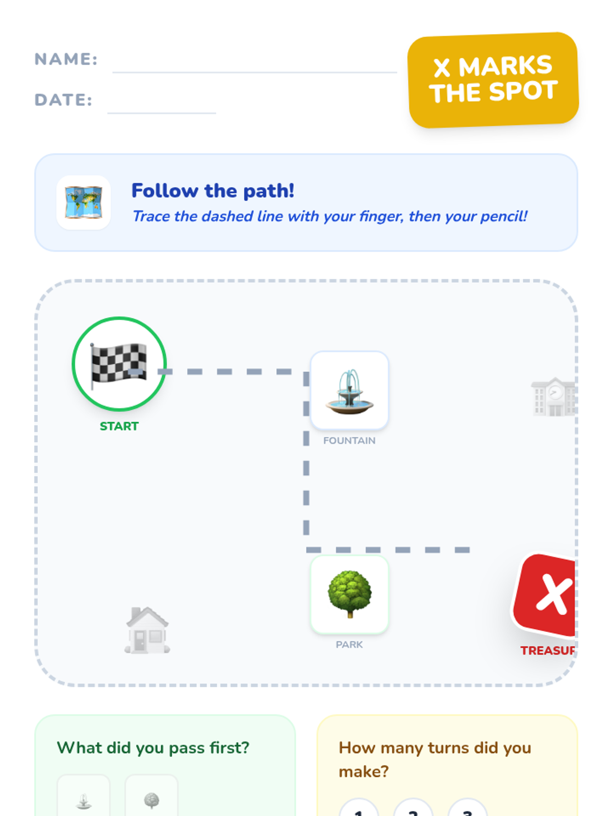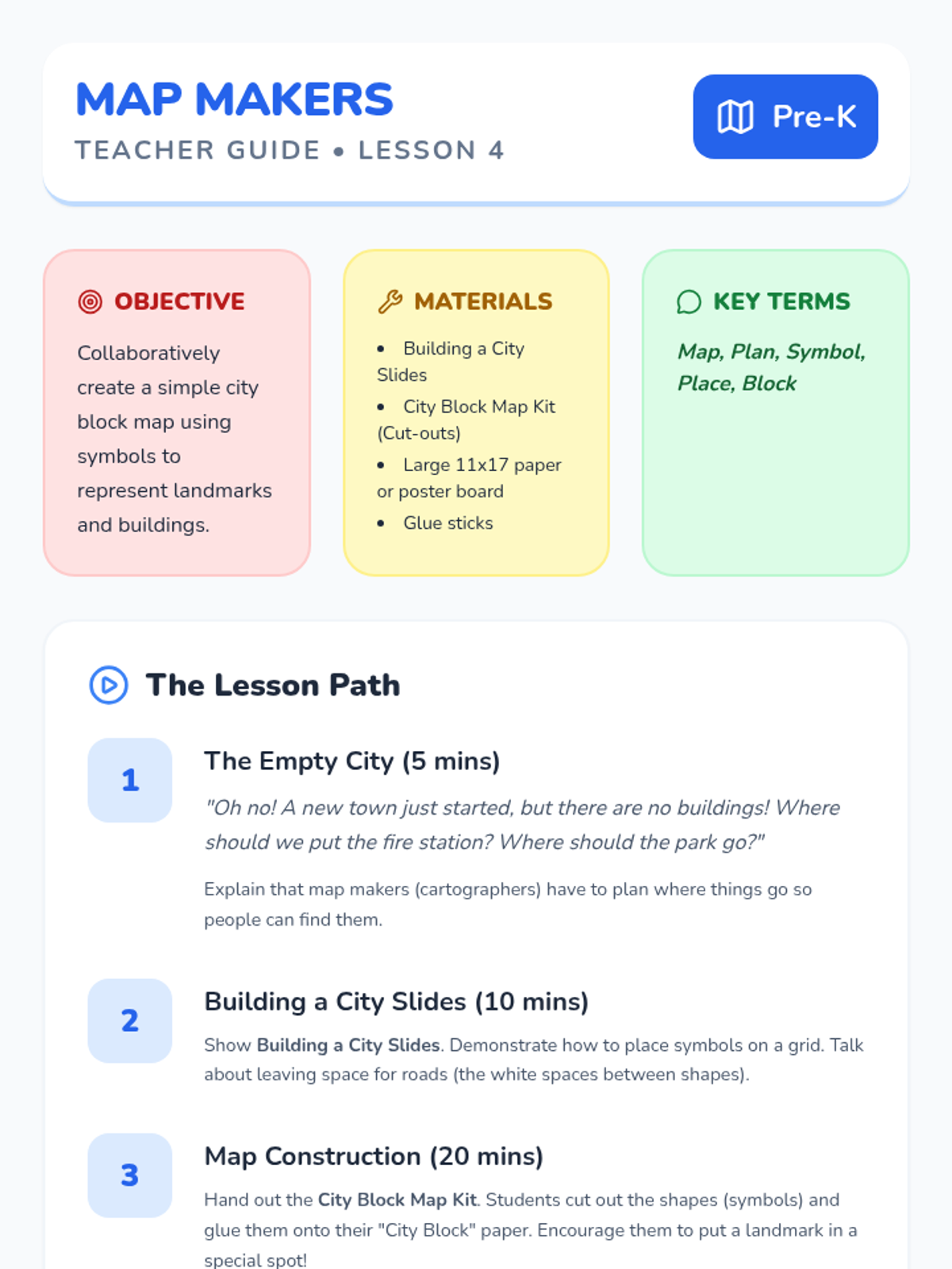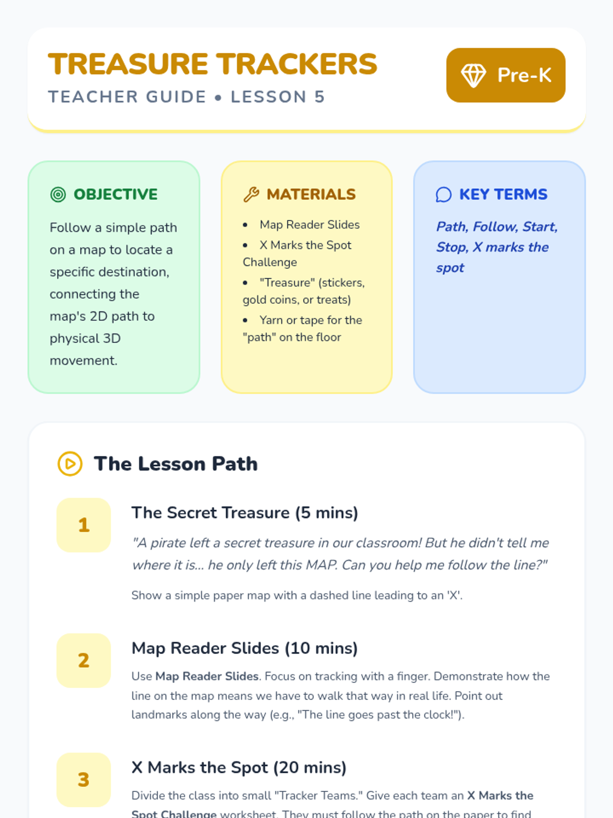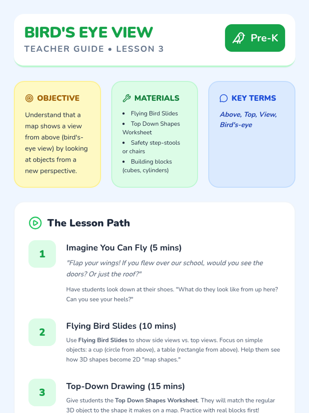 This Pre-K sequence introduces spatial awareness and basic mapping skills. Students learn to identify landmarks, use positional language, understand bird's-eye perspective, and create/follow simple maps of their environment.