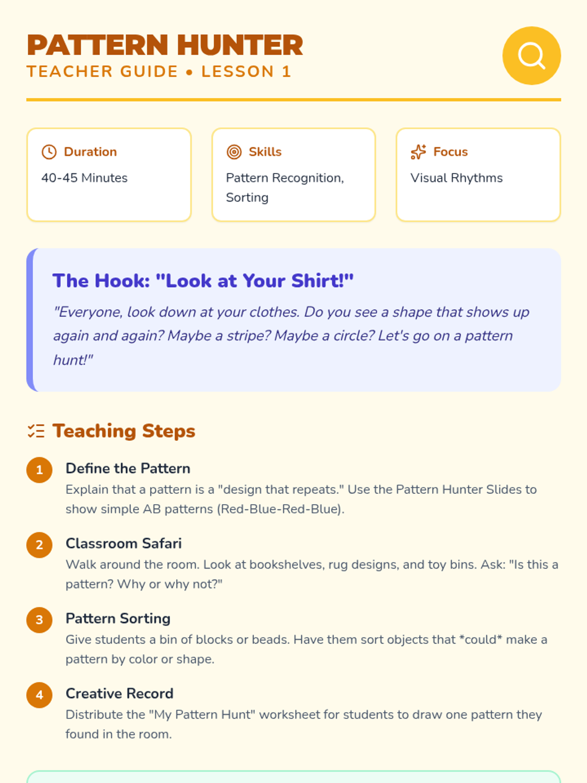 A Pre-K inquiry-based sequence where students explore how patterns and objects tell stories across cultures. Students investigate daily patterns, global textiles, pottery, and family artifacts to build cultural awareness and design skills.