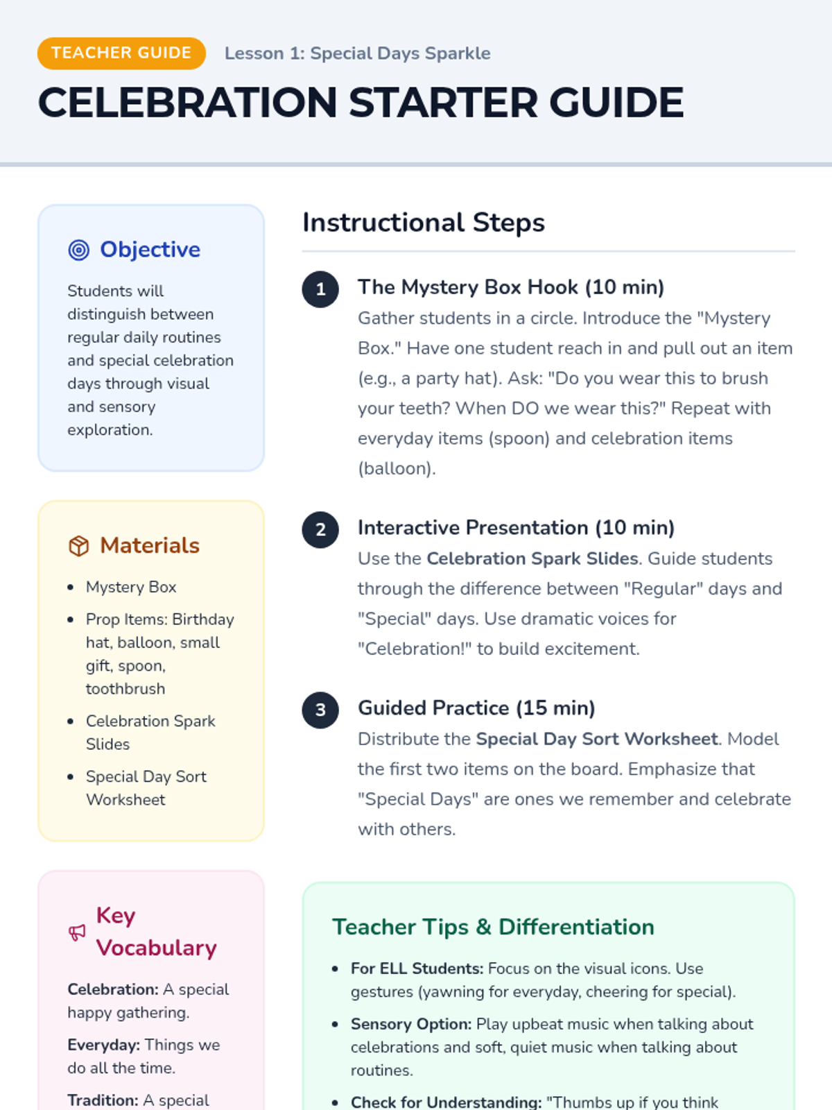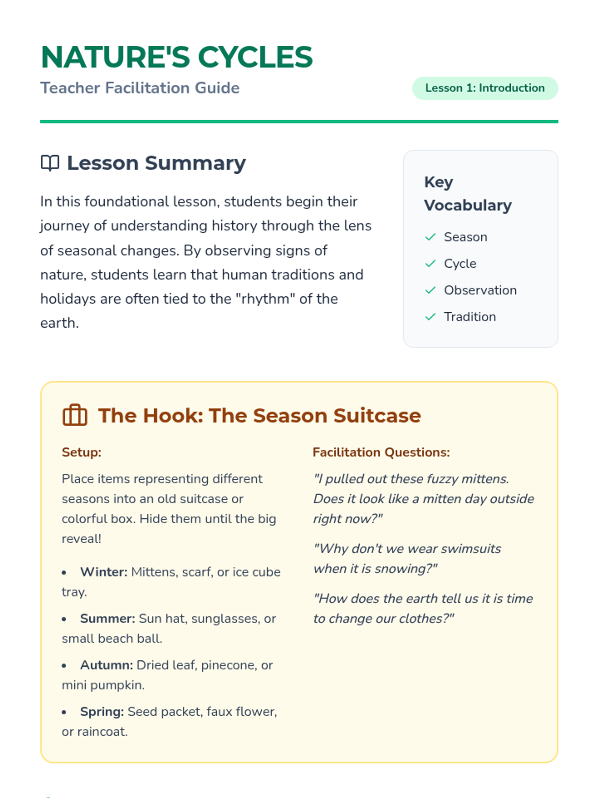 This sequence connects human celebrations to the natural world, helping Pre-K students understand the historical origins of seasonal festivals by tracking changes in weather and nature. Students explore harvest traditions, winter storytelling, and spring renewal to understand the rhythm of the year.