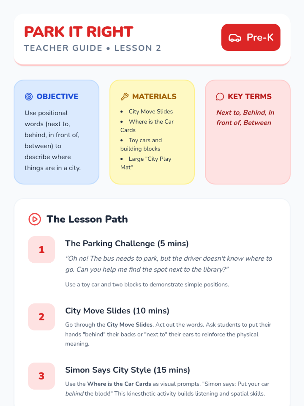 A Pre-K sequence introducing location words (on, under, next to, near, far) through classroom exploration, games, and modeling to build early geography skills.
