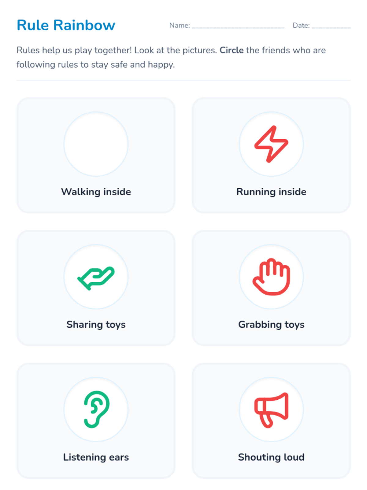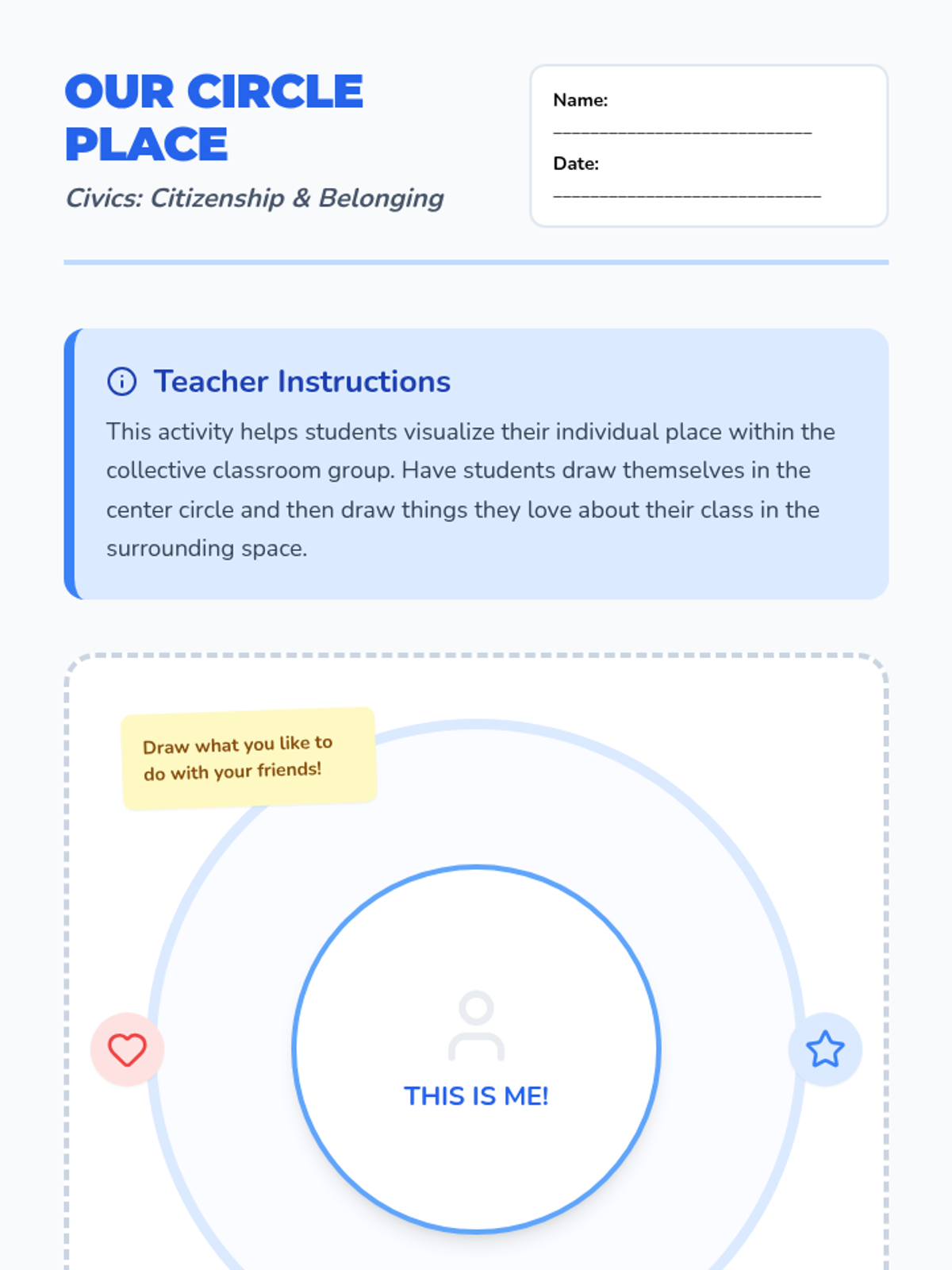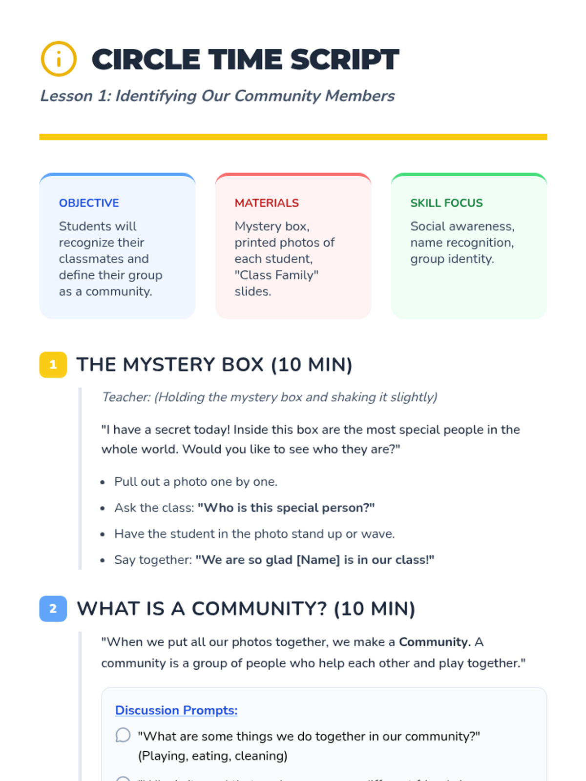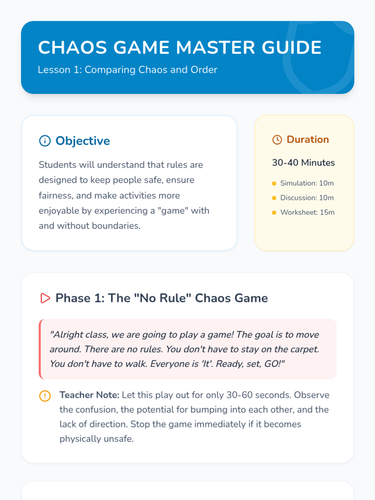 This Pre-K sequence introduces foundational civics through the lens of classroom rules, safety, sharing, and collective responsibility. Students move from experiencing the chaos of lawlessness to collaboratively drafting a 'Classroom Promise.'