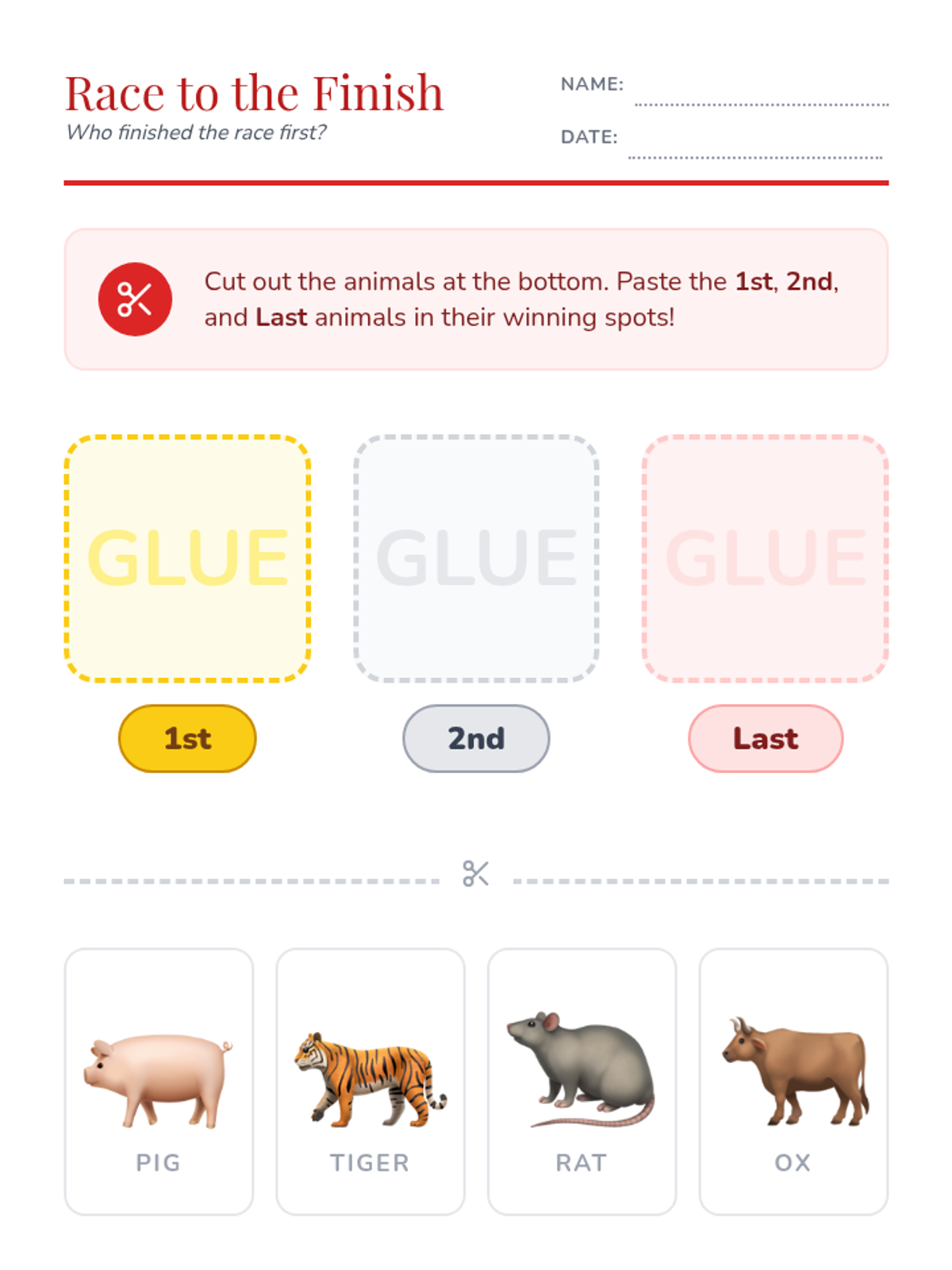 This Pre-K sequence explores the legends and movements of the Chinese Zodiac. Students learn sequencing through the story of the Great Race, compare animal traits, and connect folklore to their own identities through birth years and dramatic play.