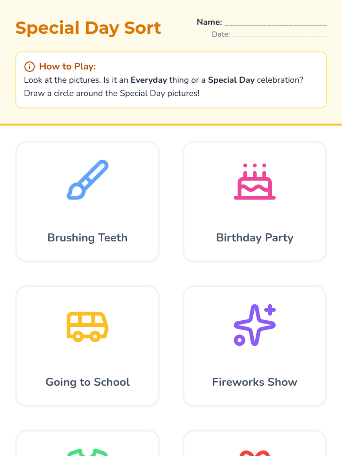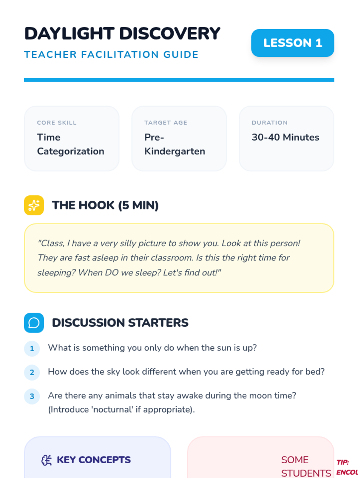 This foundational Pre-K sequence introduces the concept of chronological order through daily routines, transition words, and personal growth. Students progress from simple day/night categorization to creating their own visual timelines.