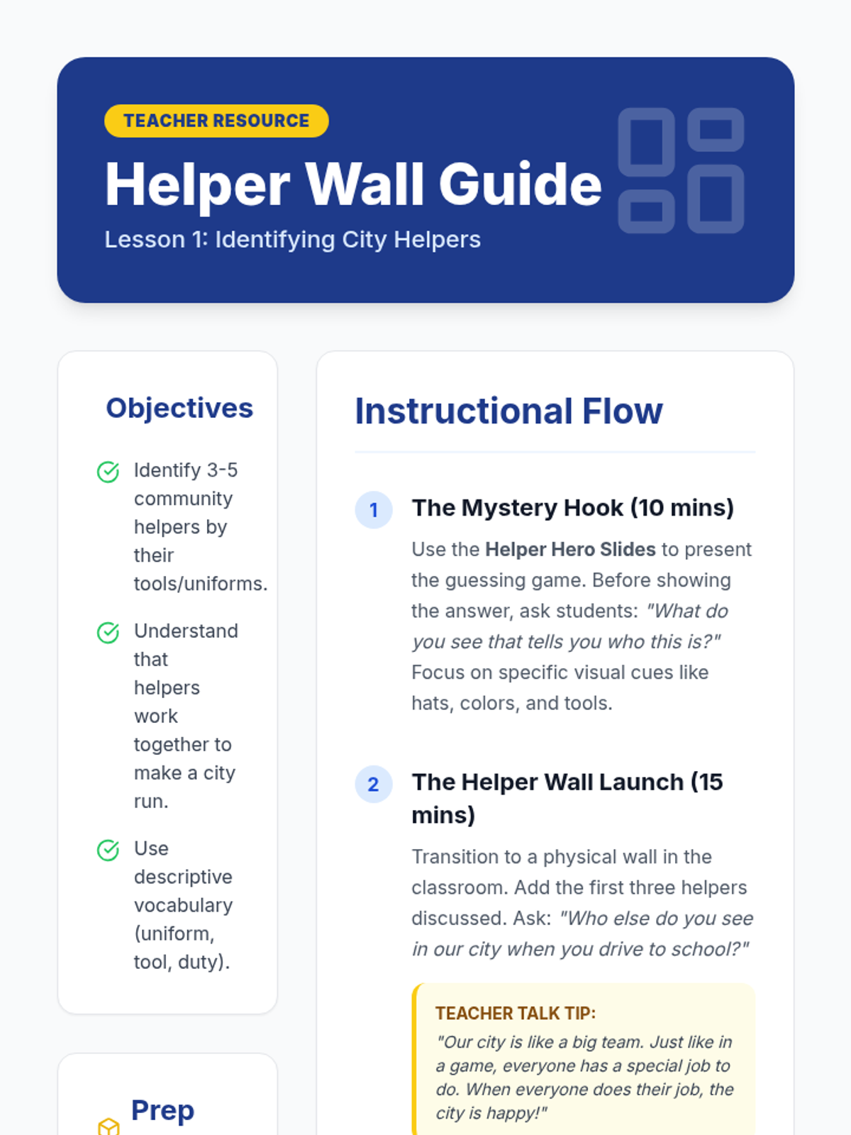 A Pre-K ELA sequence focused on reading comprehension through informational texts about community helpers. Students explore the roles, tools, and processes of firefighters, doctors, mail carriers, and builders through interactive read-alongs and role-play.