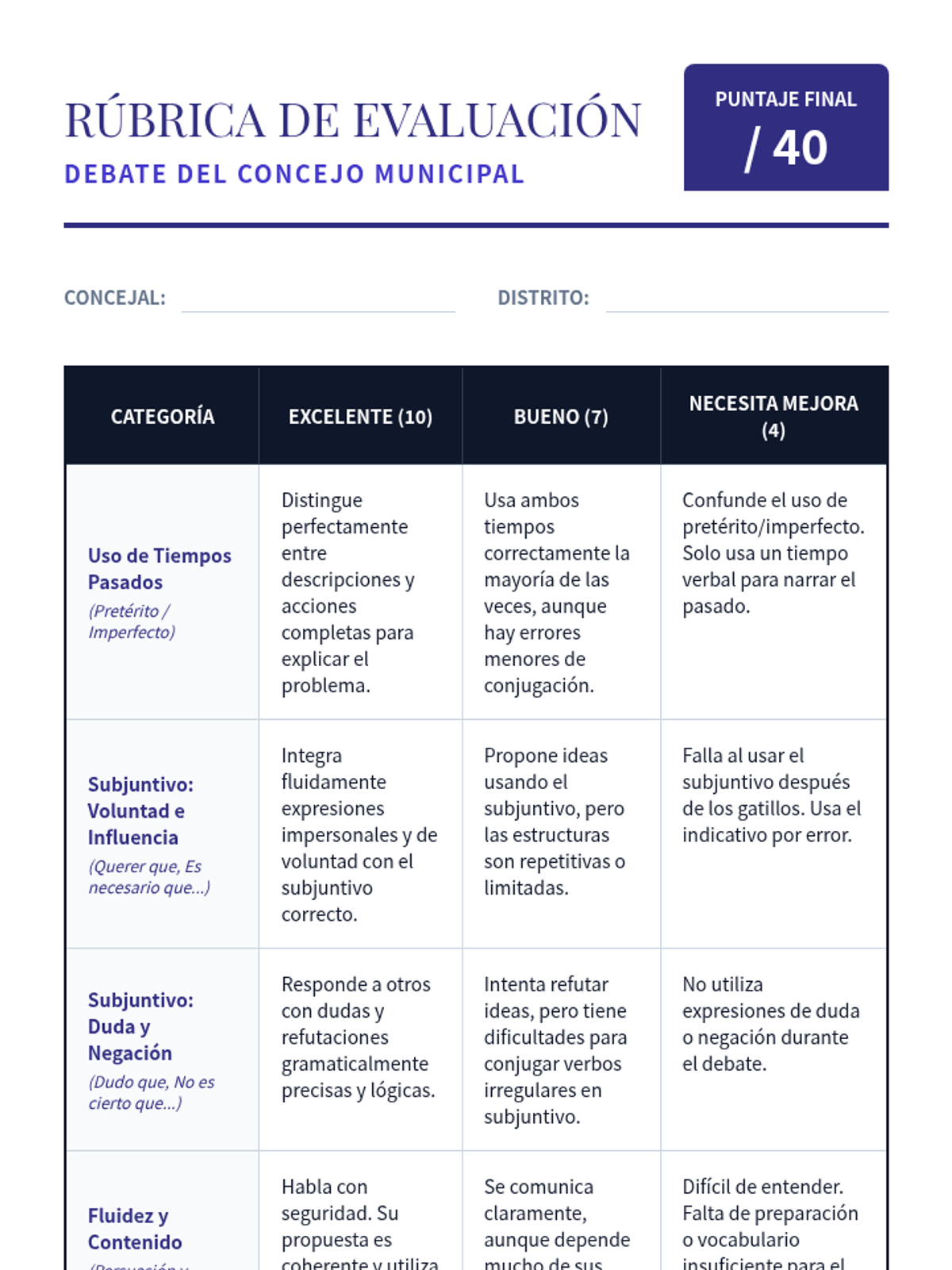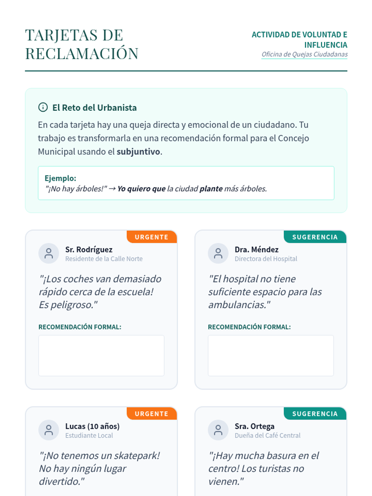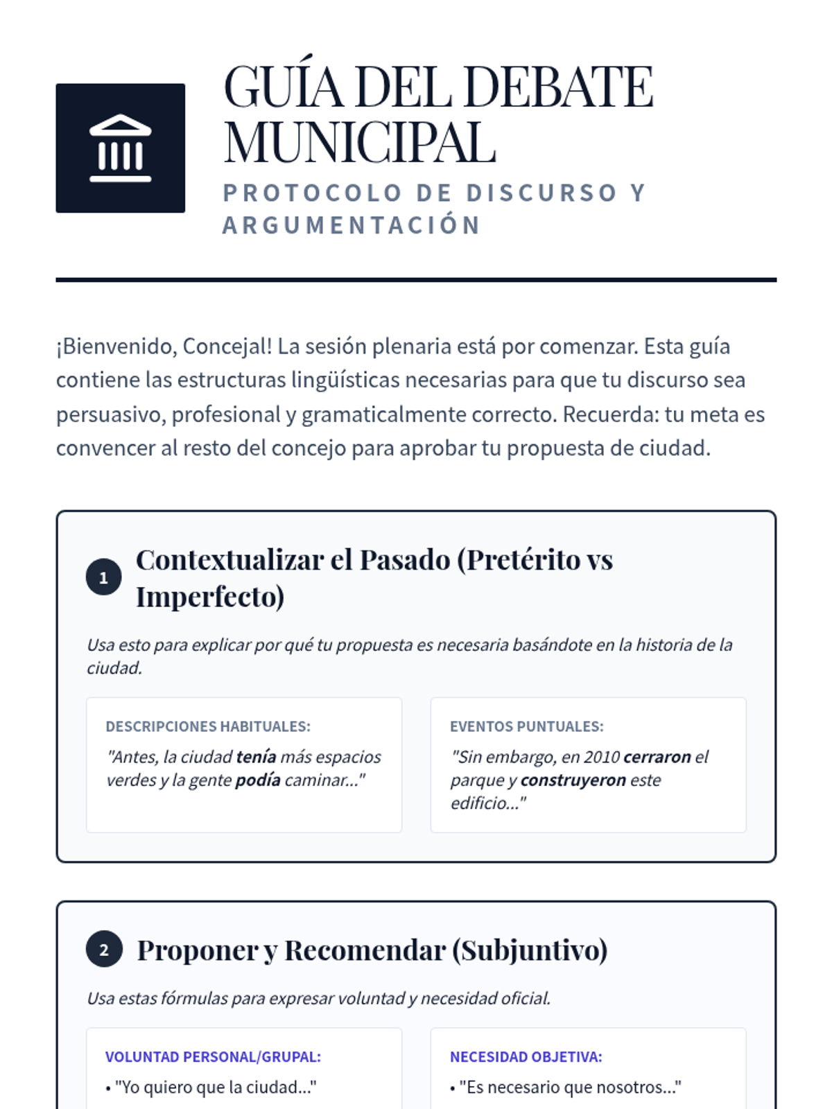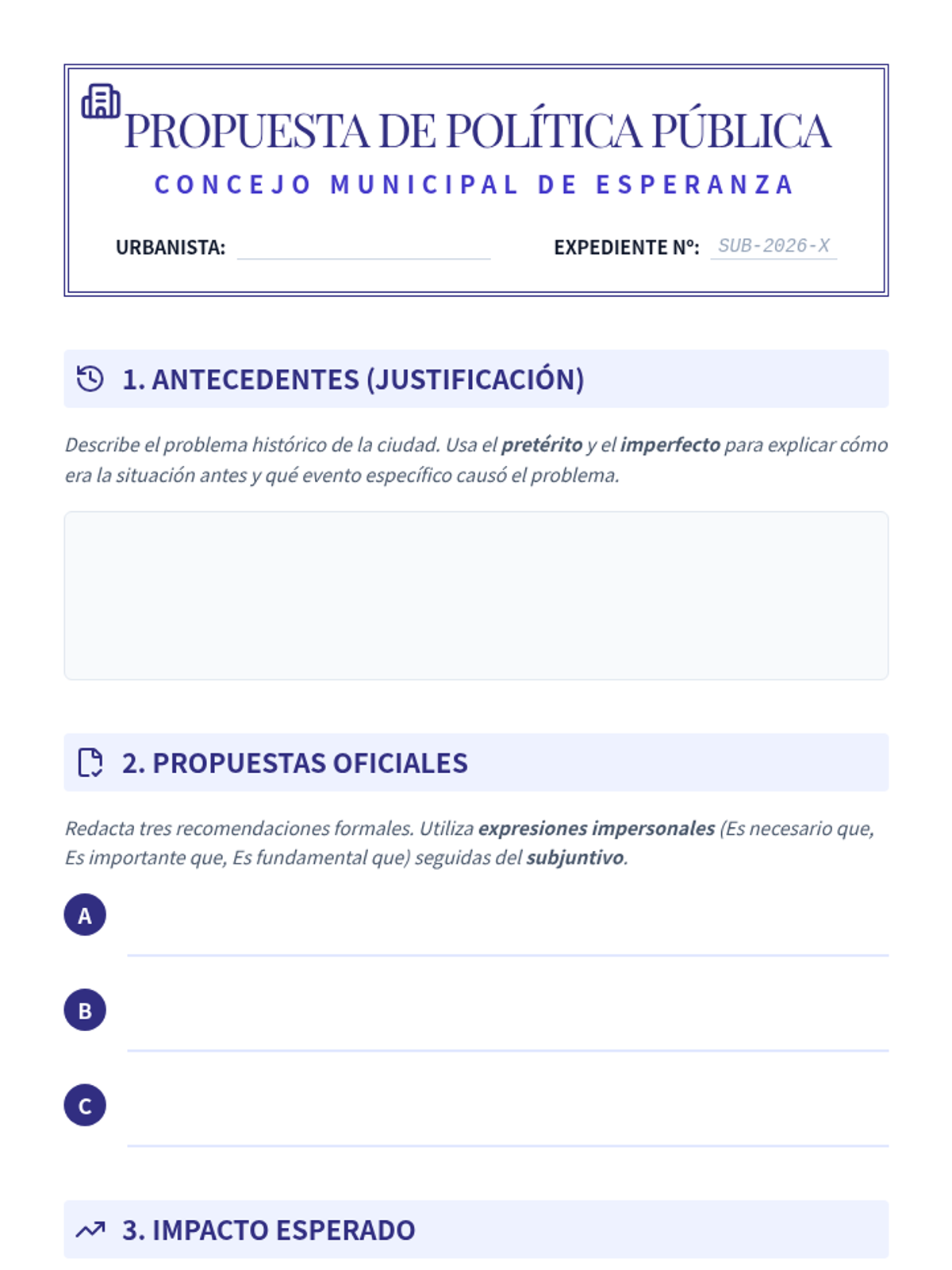 An intermediate Spanish grammar sequence for 8th graders where students master the subjunctive mood through a city planning simulation. They narrate a fictional city's history, propose improvements using volition and impersonal expressions, and debate policy using doubt and denial.
