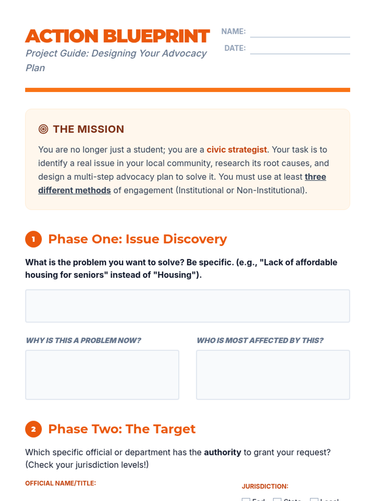 A comprehensive 9th-grade civics sequence exploring non-electoral political participation. Students learn to navigate government structures, evaluate grassroots and digital activism, and design their own community-based civic action plans.
