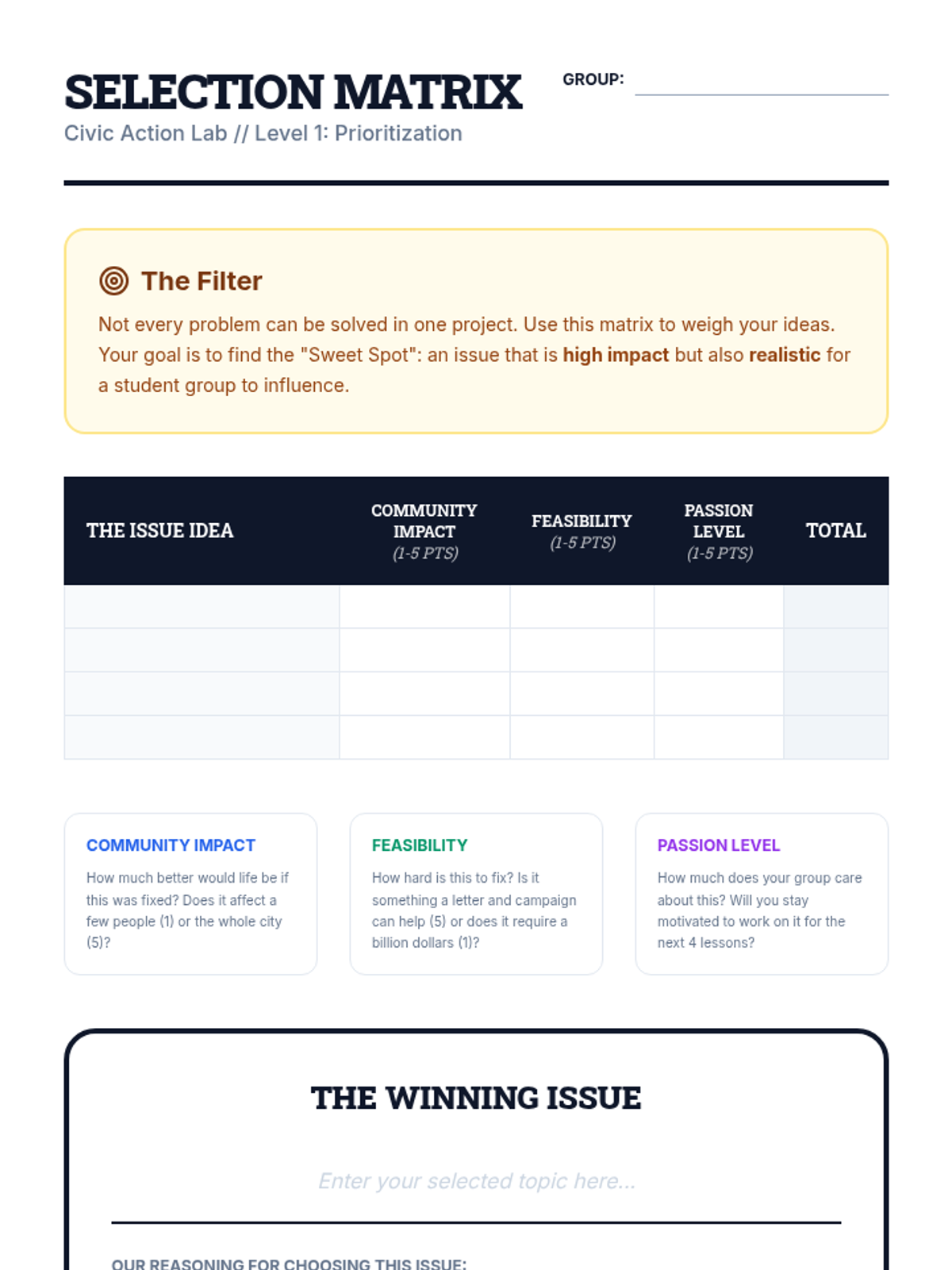 A project-based civics unit where 6th-grade students transition from identifying community problems to proposing actionable solutions through local government channels and advocacy campaigns. Students develop skills in research, stakeholder mapping, persuasive writing, and media literacy to influence positive change.