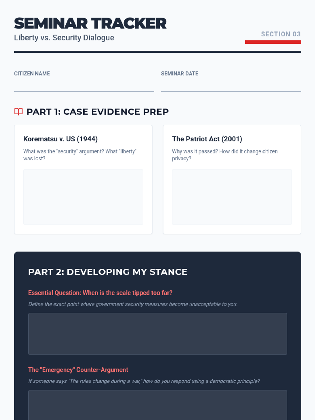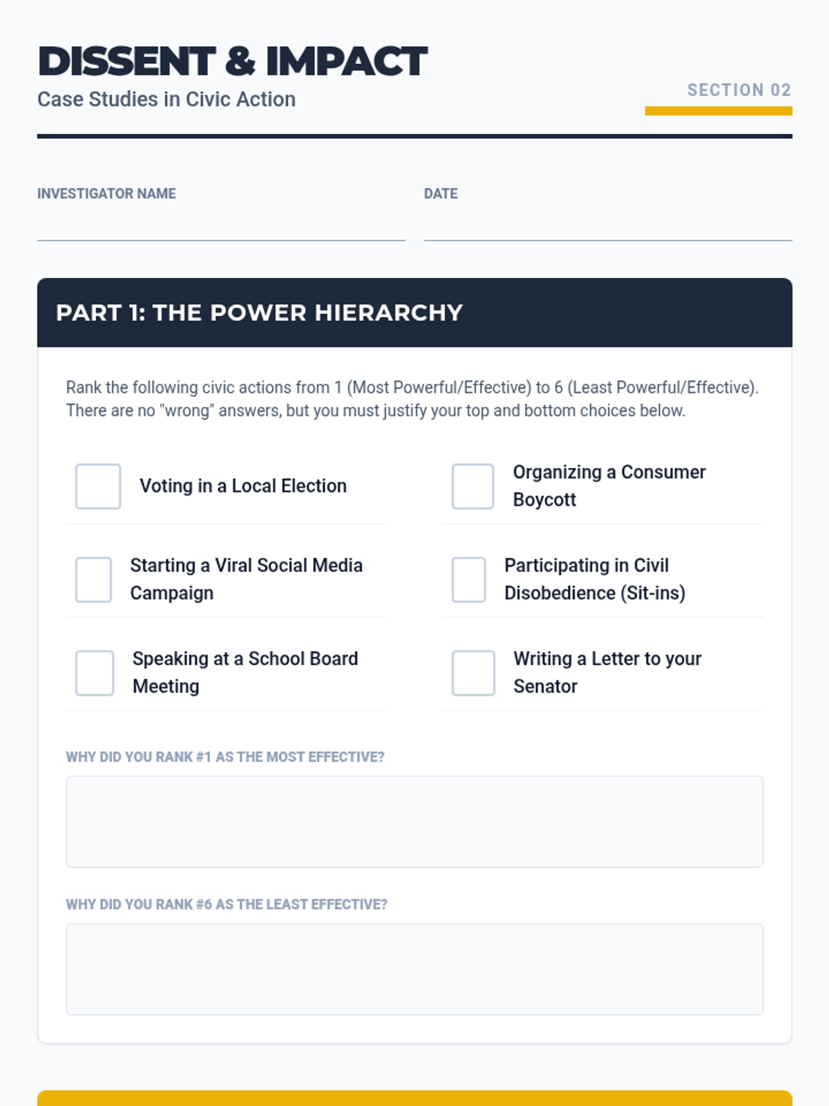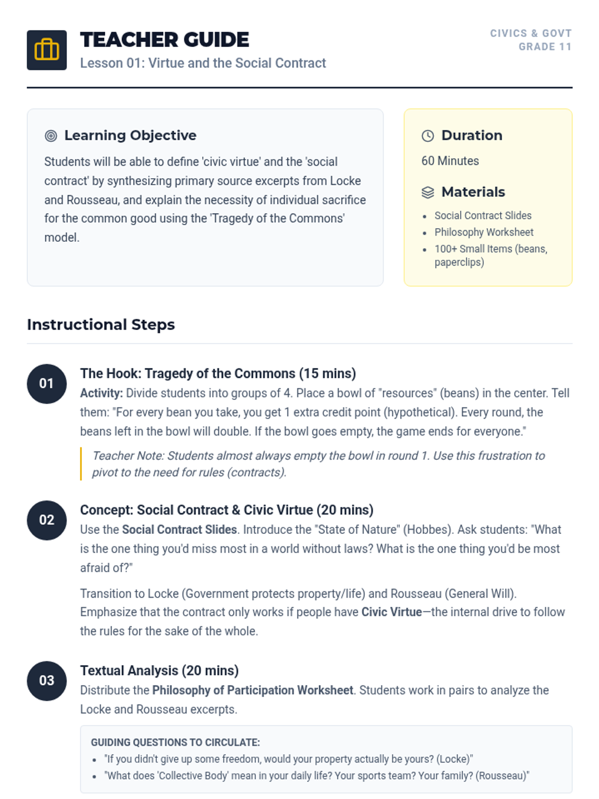 This sequence explores the transition from legal citizenship to active civic engagement. Students investigate the philosophical roots of civic virtue, analyze methods of social change, debate the balance between liberty and security, and develop a practical civic action project to address community issues.