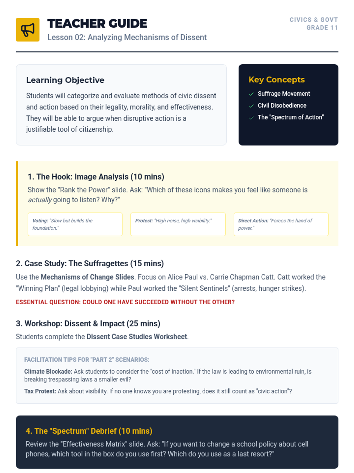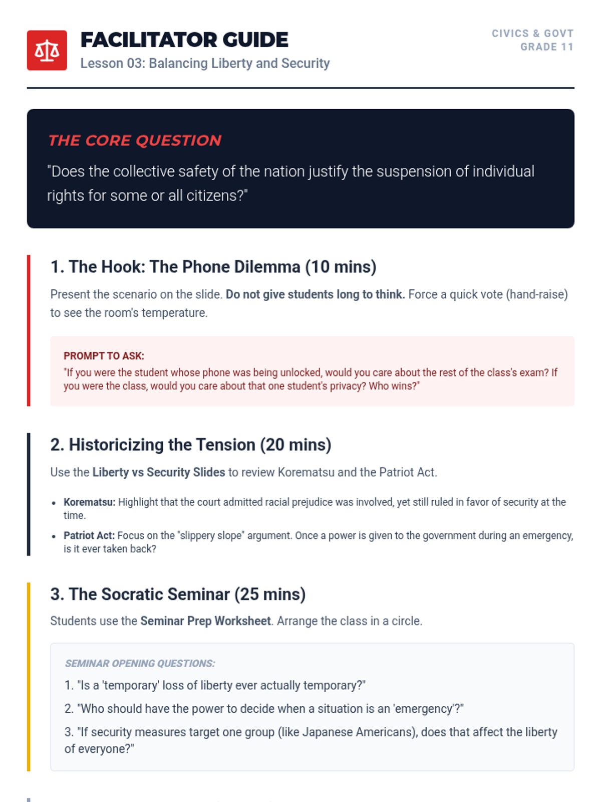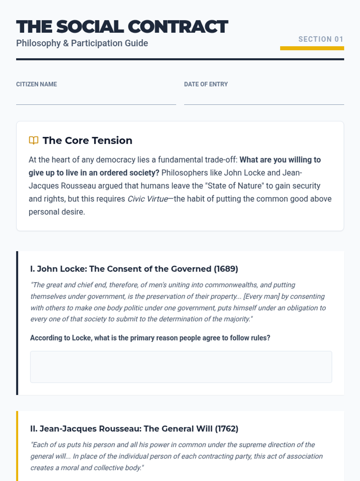 This sequence explores the transition from legal citizenship to active civic engagement. Students investigate the philosophical roots of civic virtue, analyze methods of social change, debate the balance between liberty and security, and develop a practical civic action project to address community issues.