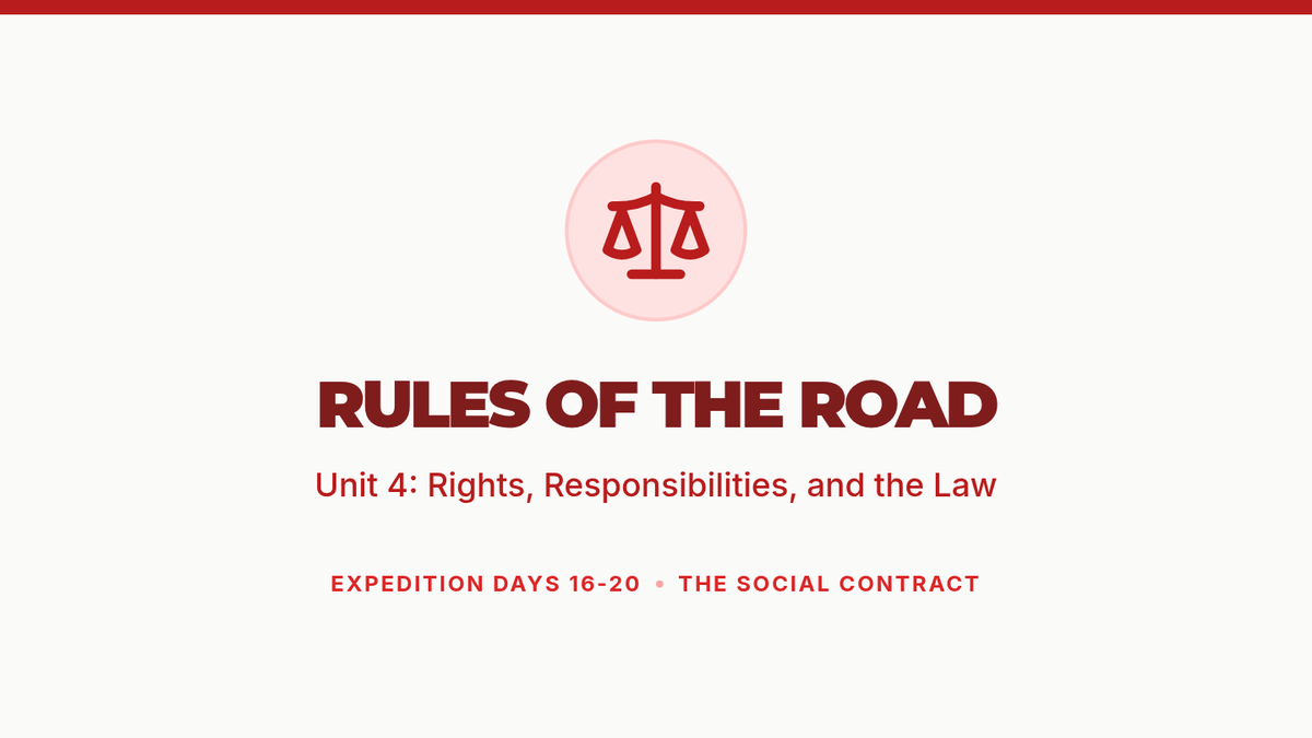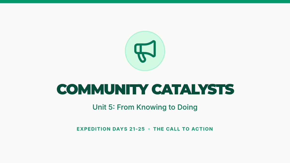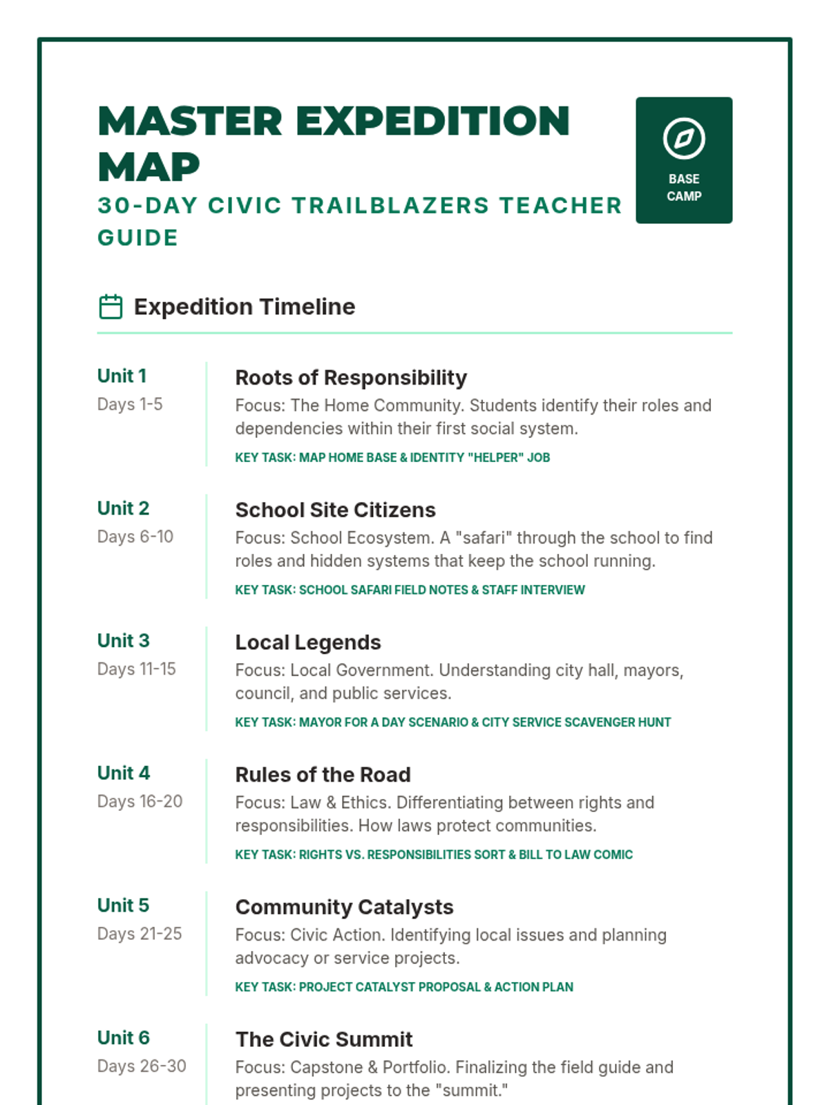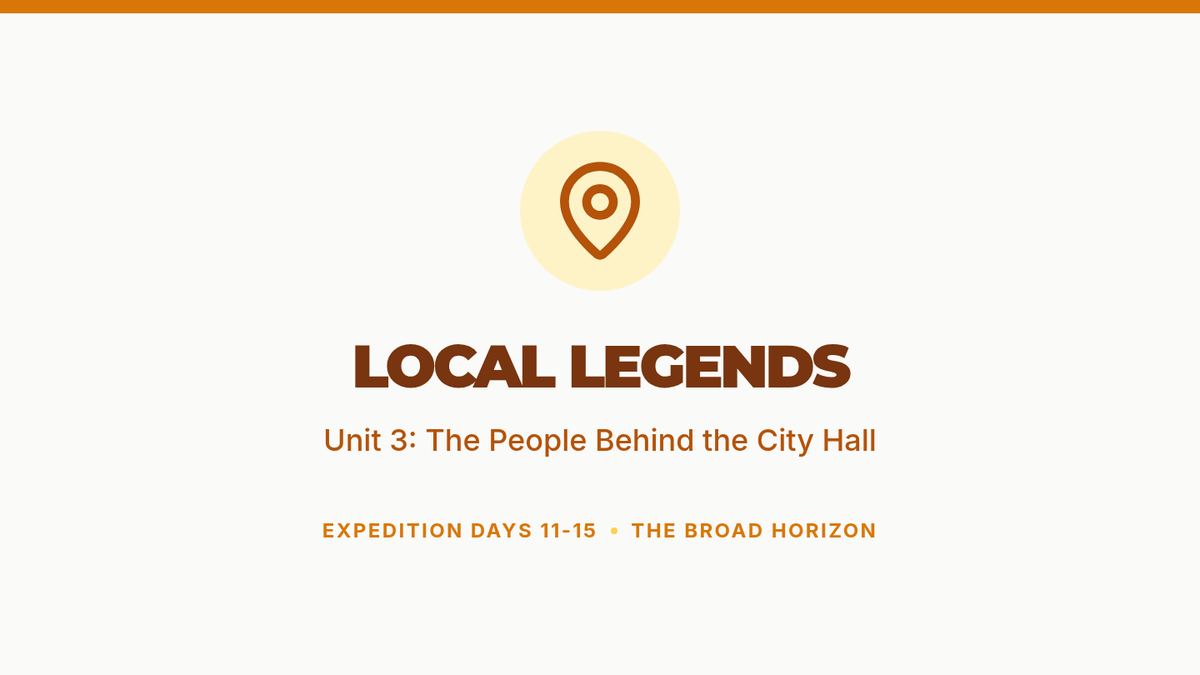 A 30-day 5th-grade course exploring civic roles across family, school, and local communities. Students develop a 'Civic Portfolio' while learning about governance, responsibility, and community action through an expedition-themed curriculum.
