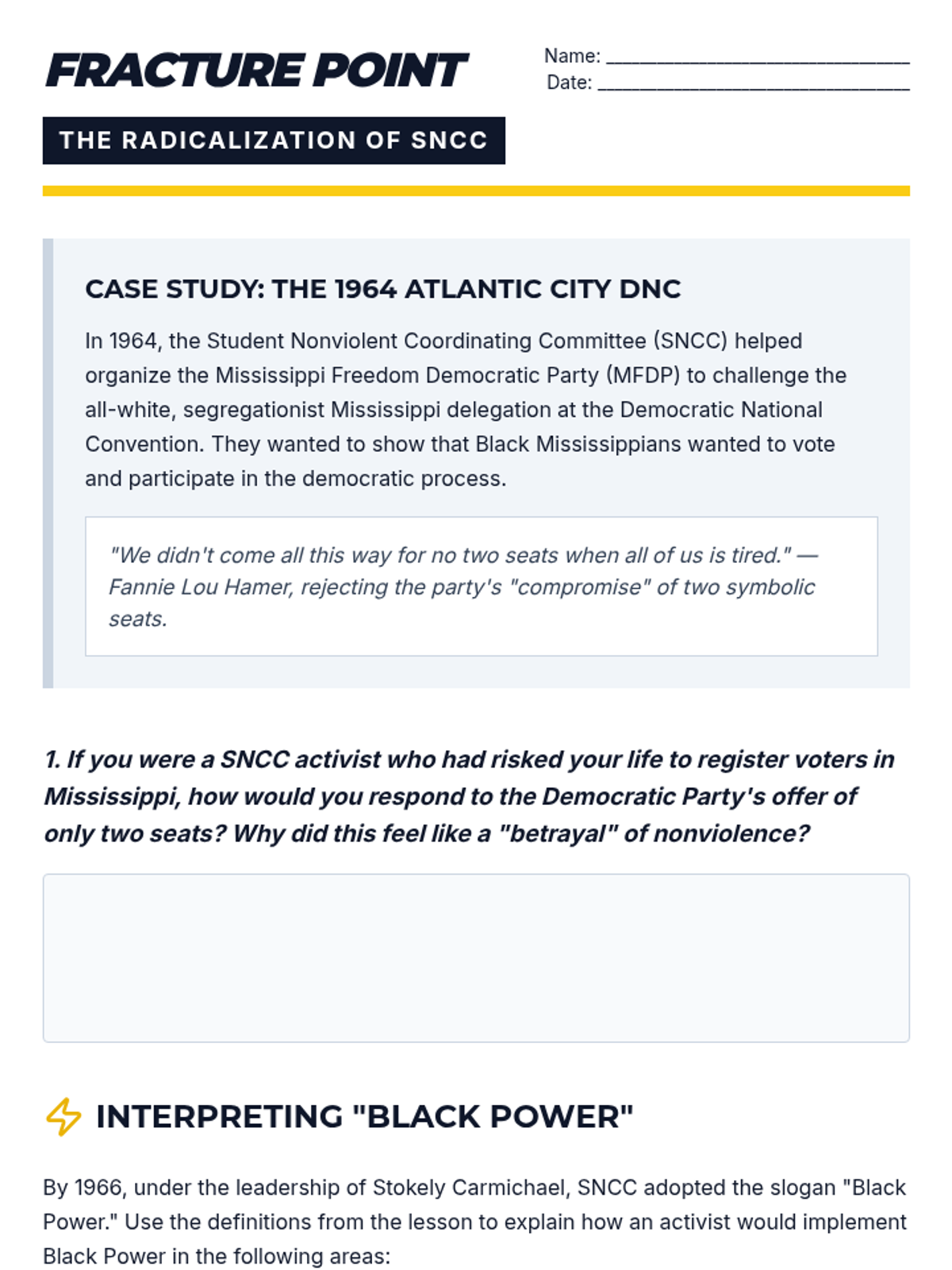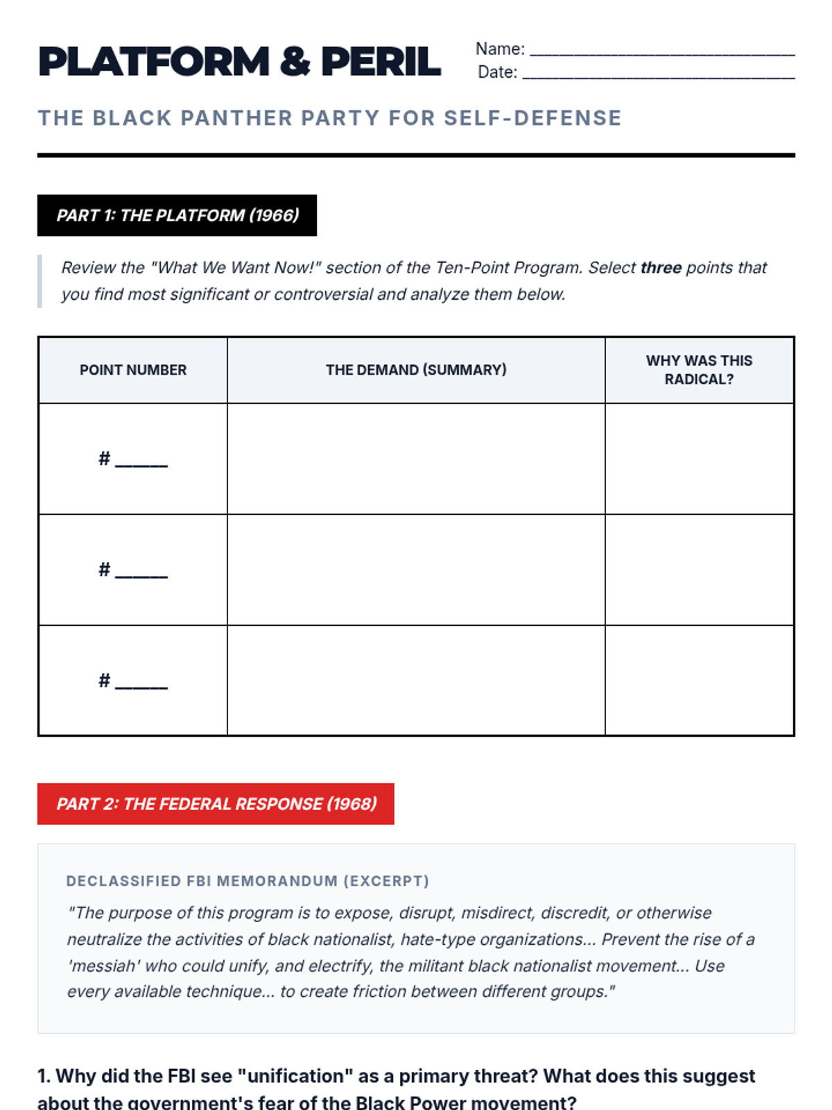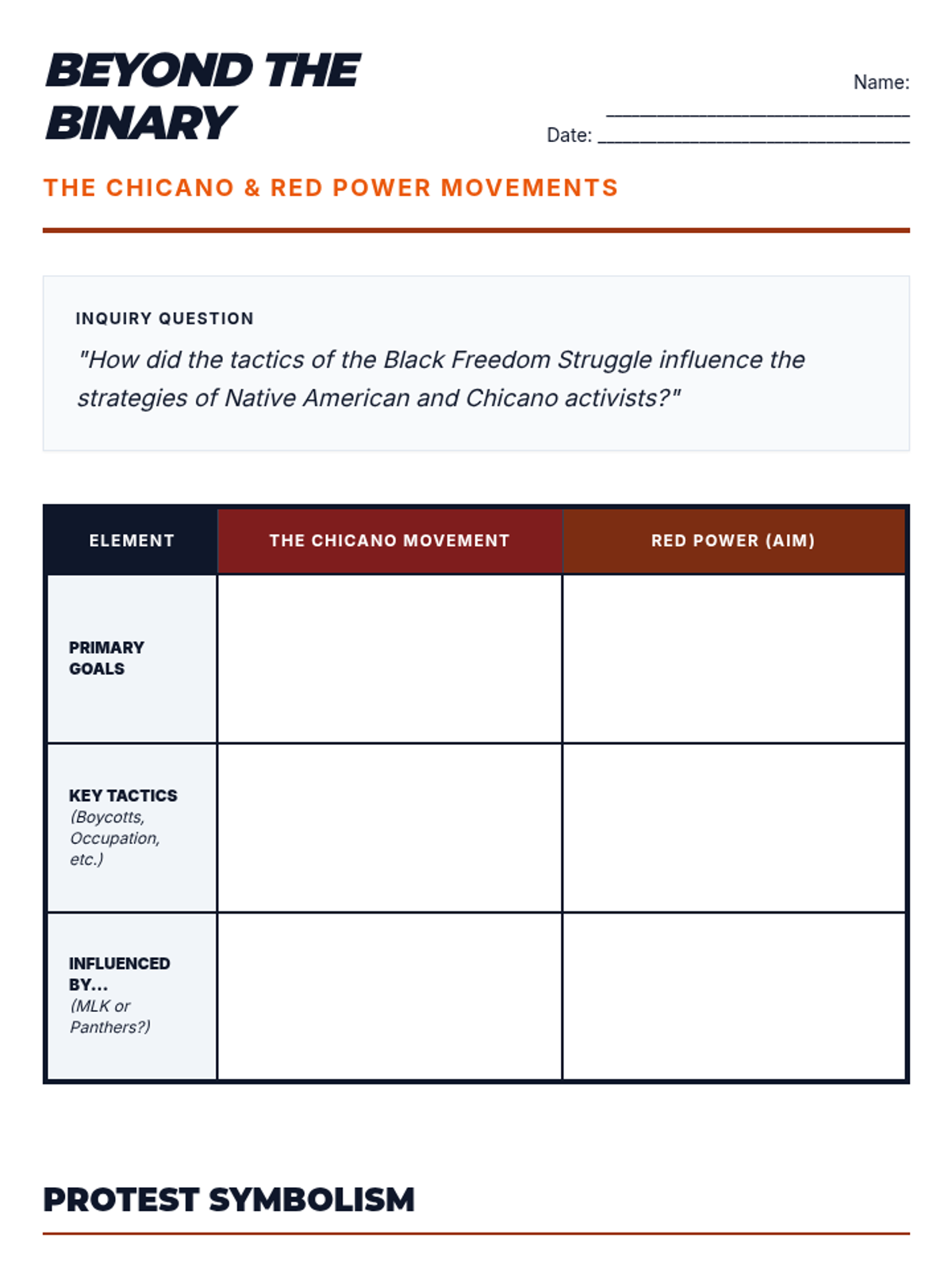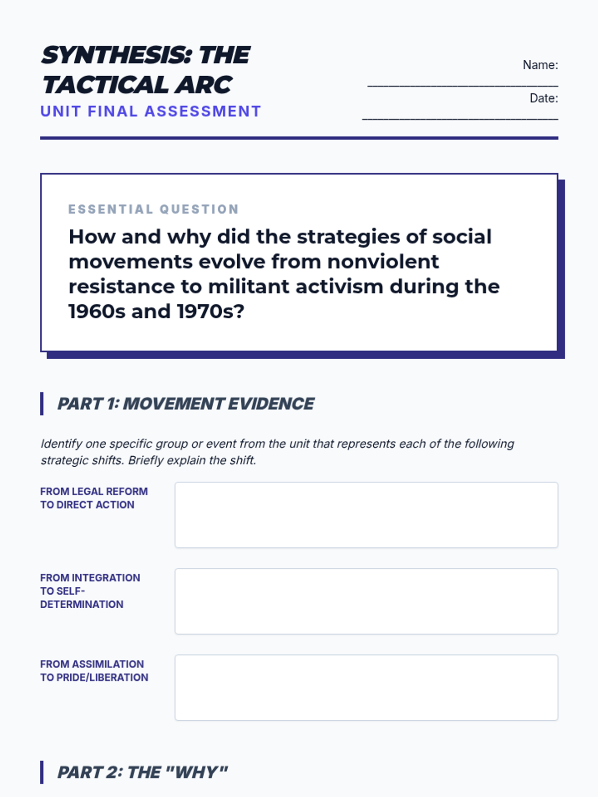 This sequence examines the strategic evolution of the Civil Rights Movement during the 1960s and 1970s, moving beyond the narrative of nonviolent resistance to explore the rise of Black Power and parallel movements. Students analyze primary sources from various groups including the Black Panthers, AIM, UFW, and Gay Liberation to understand shifts in tactics and goals.