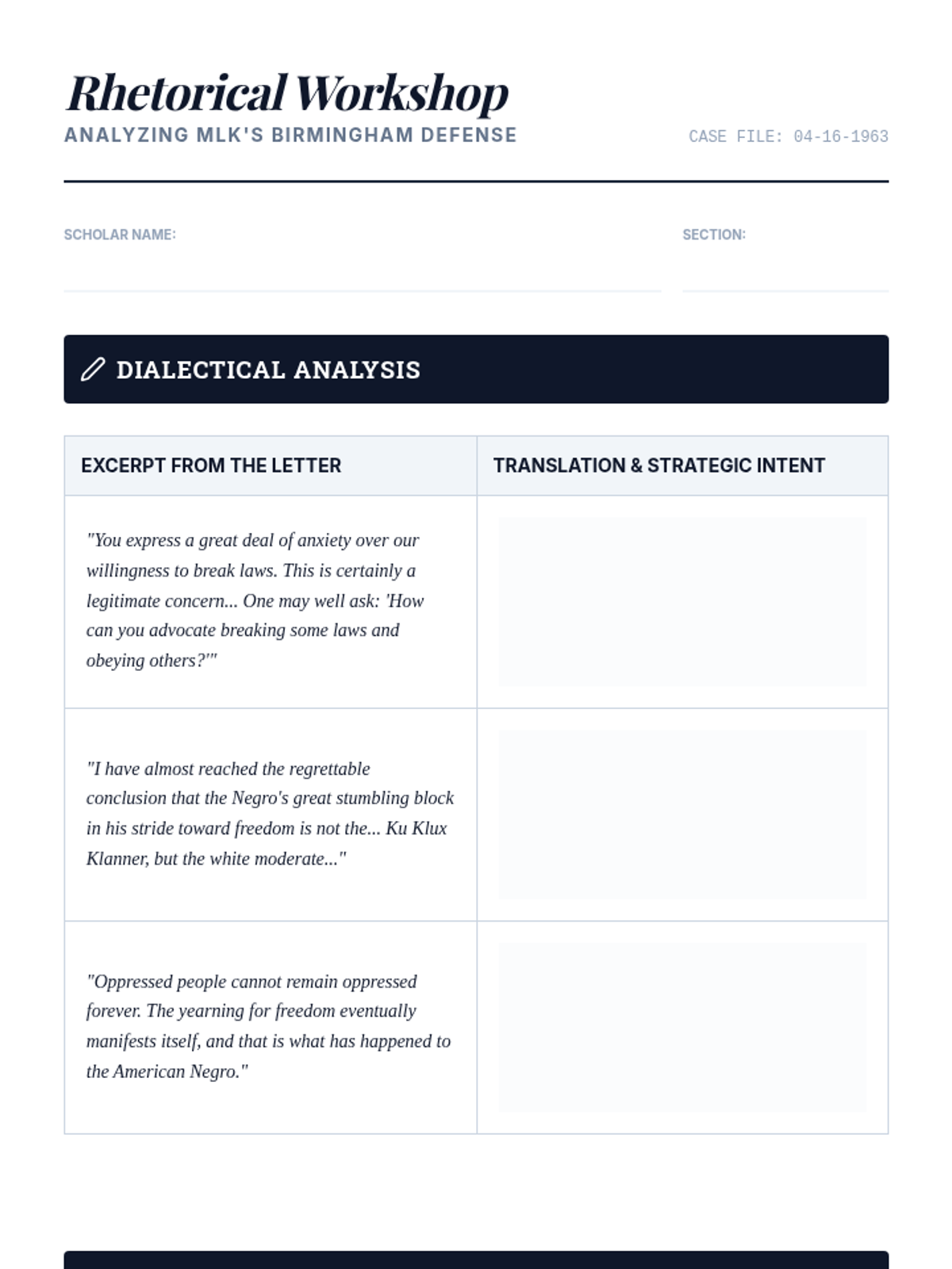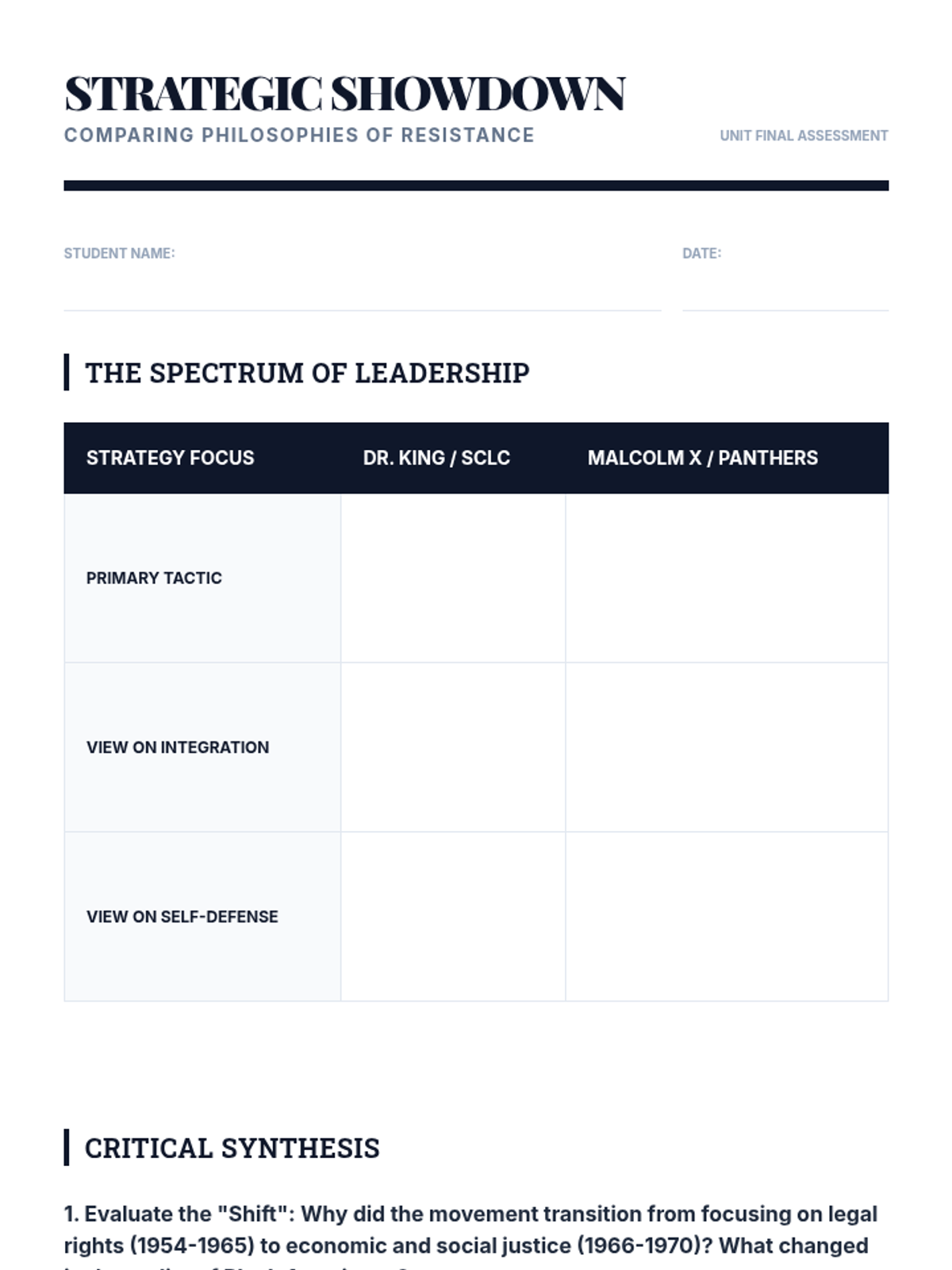 A comprehensive inquiry-based sequence for 10th-grade students examining the strategic evolution of the Civil Rights Movement, from legal challenges to direct action and legislative victories. Students analyze primary sources to evaluate how different strategies of resistance influenced the movement's outcomes.
