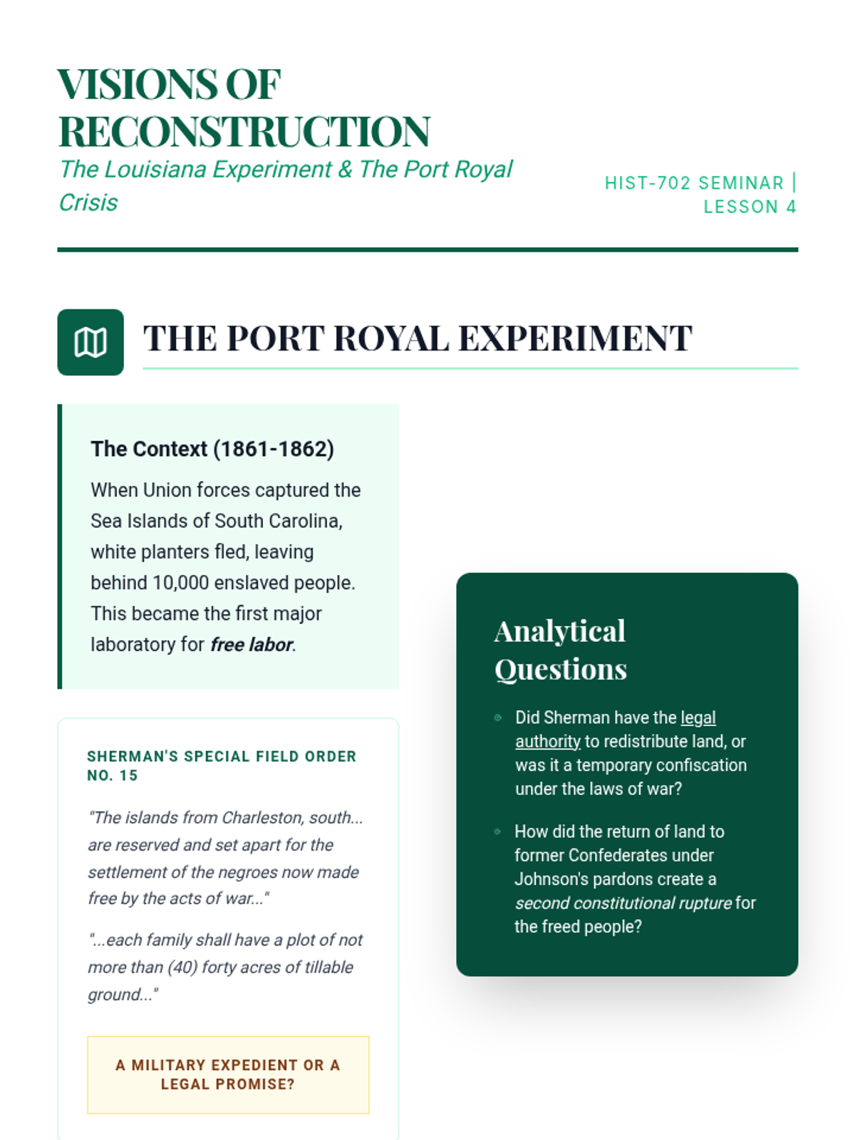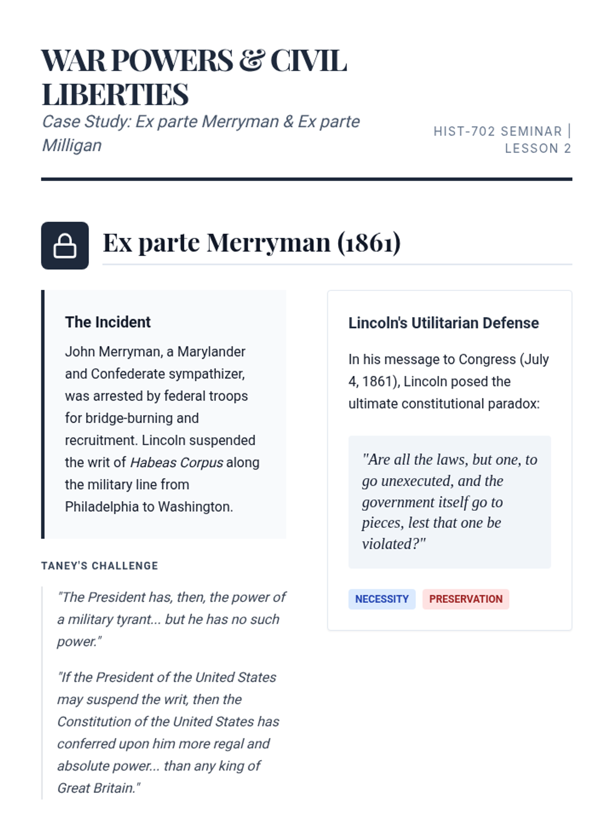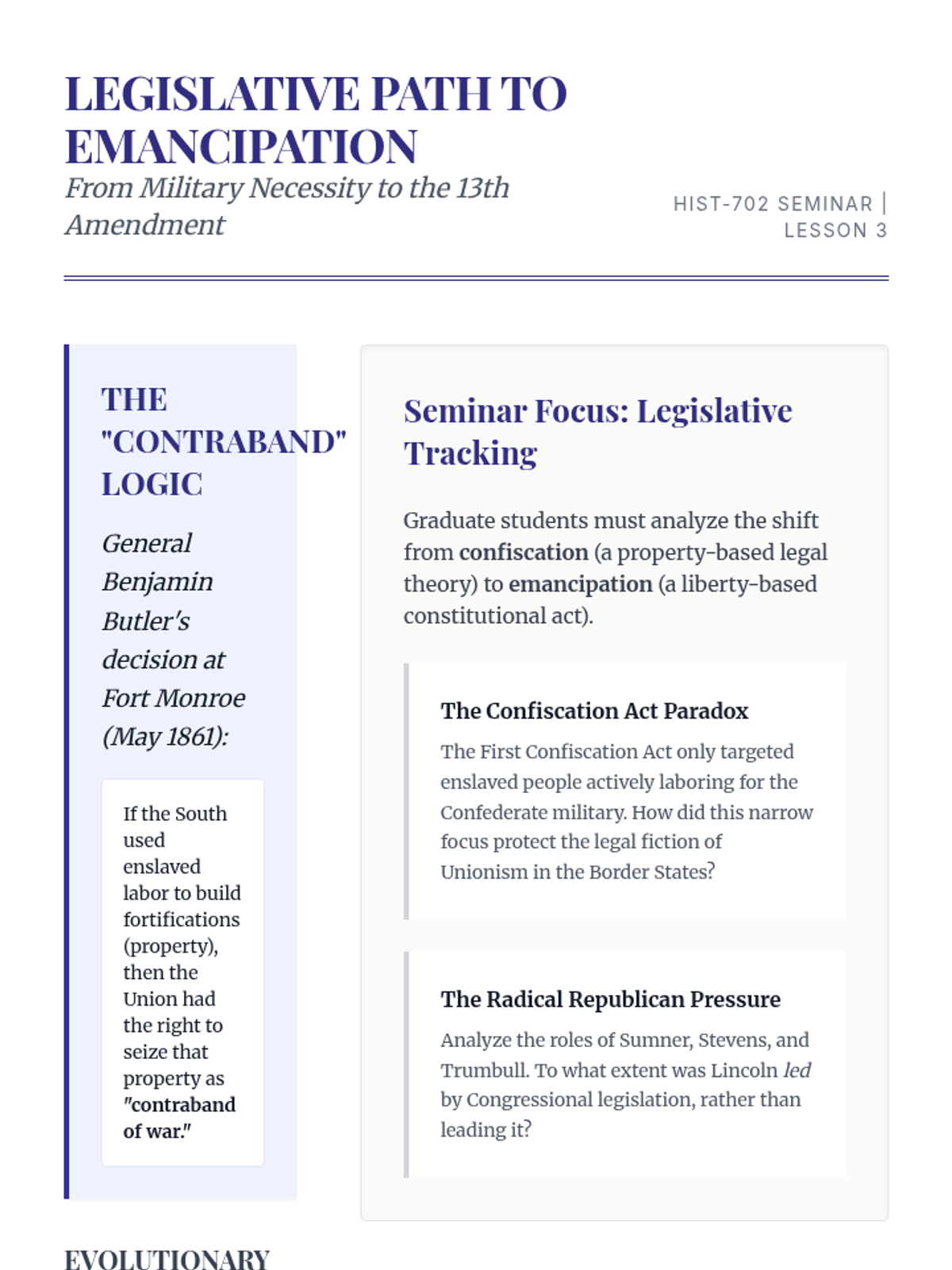 An advanced seminar sequence for graduate students analyzing the American Civil War as a crisis of federalism and a catalytic event for constitutional transformation. Students deconstruct legal arguments for secession, executive war powers, the legislative path to emancipation, and shifting historiographical interpretations of the era's impact on American democracy.