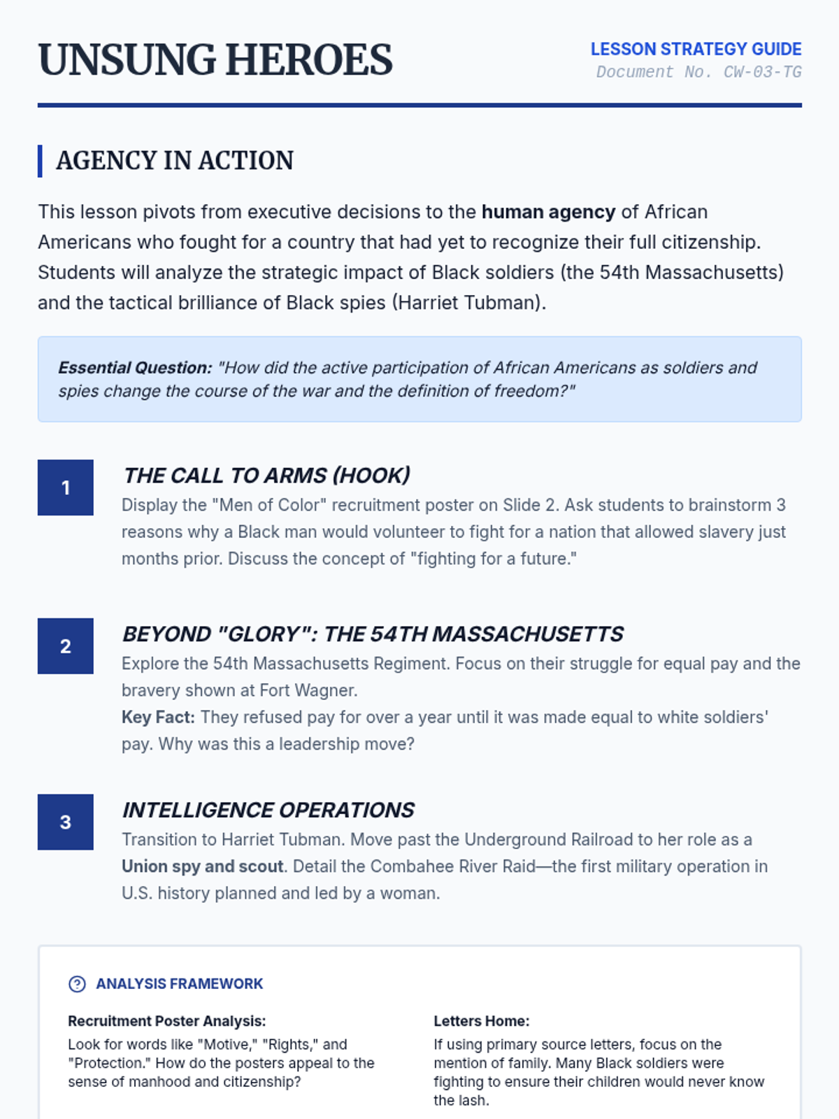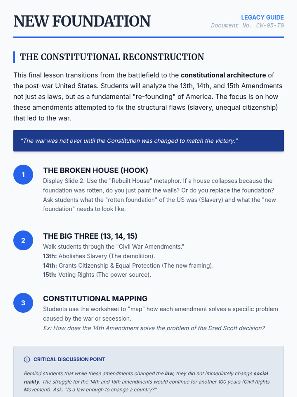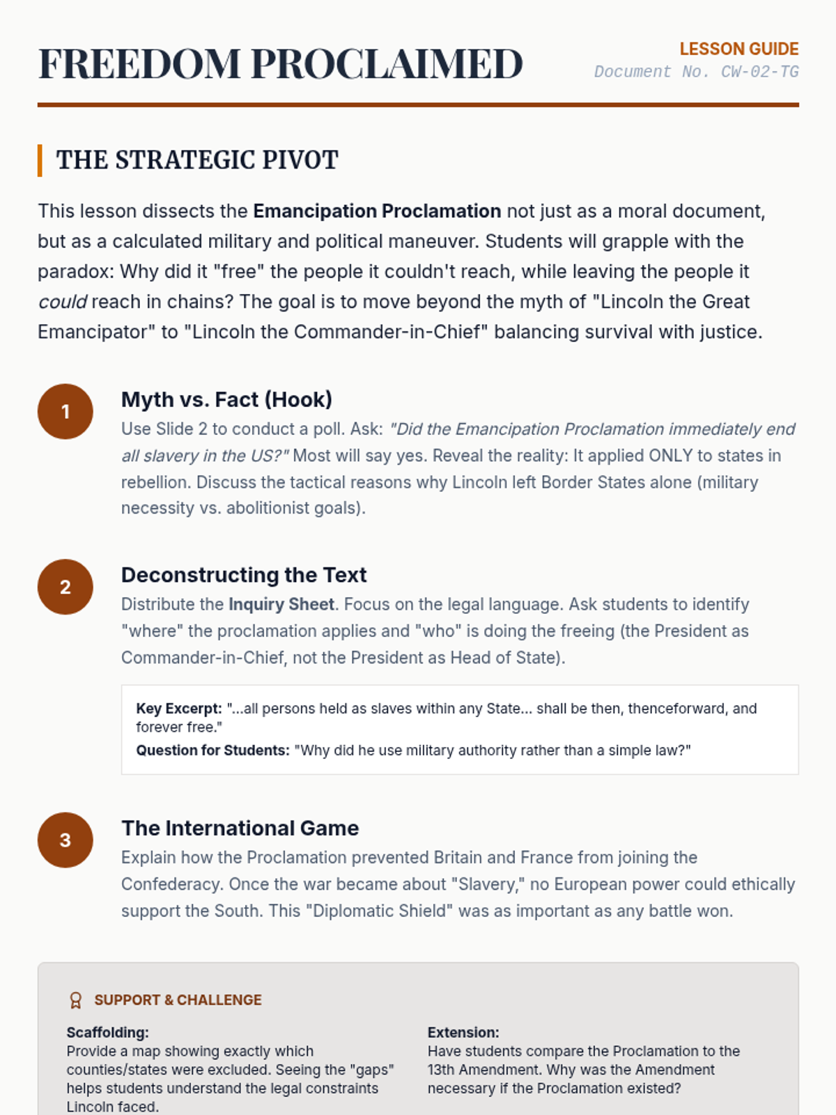 This 8th-grade history sequence explores the political leadership and social transformations of the U.S. Civil War. Students evaluate the leadership of Lincoln and Davis, analyze the shift from preserving the Union to abolishing slavery, and examine the contributions of African American soldiers and the impact of the Reconstruction Amendments.