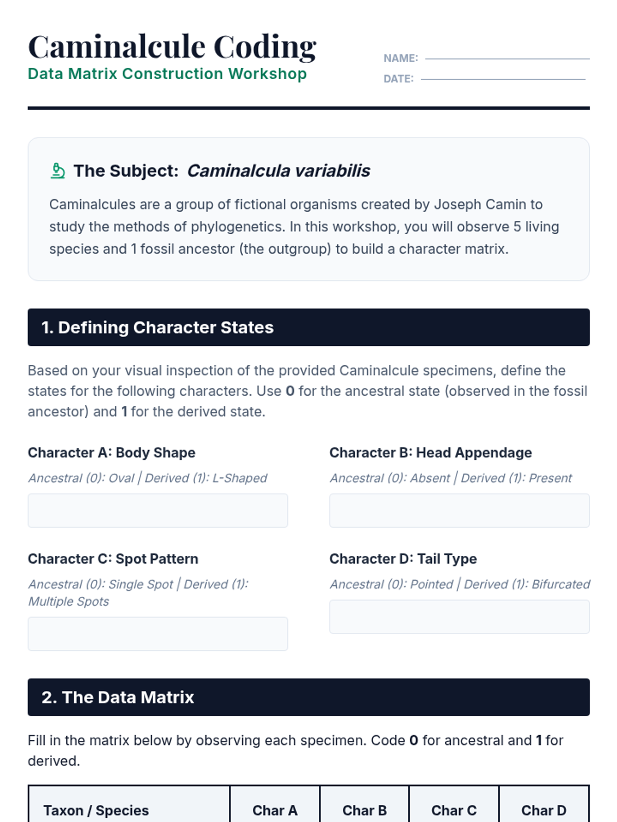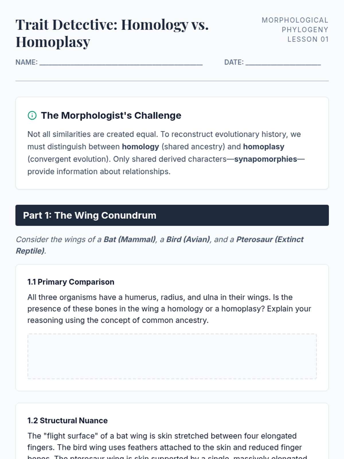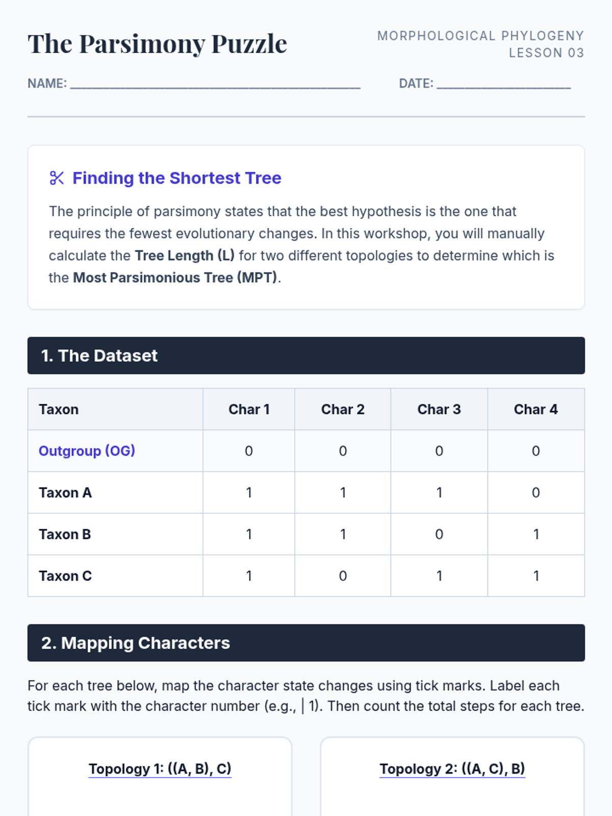 A comprehensive workshop-style sequence for undergraduate students focusing on the logic and methodology of building phylogenetic trees using morphological data, emphasizing parsimony, homology, and statistical evaluation.