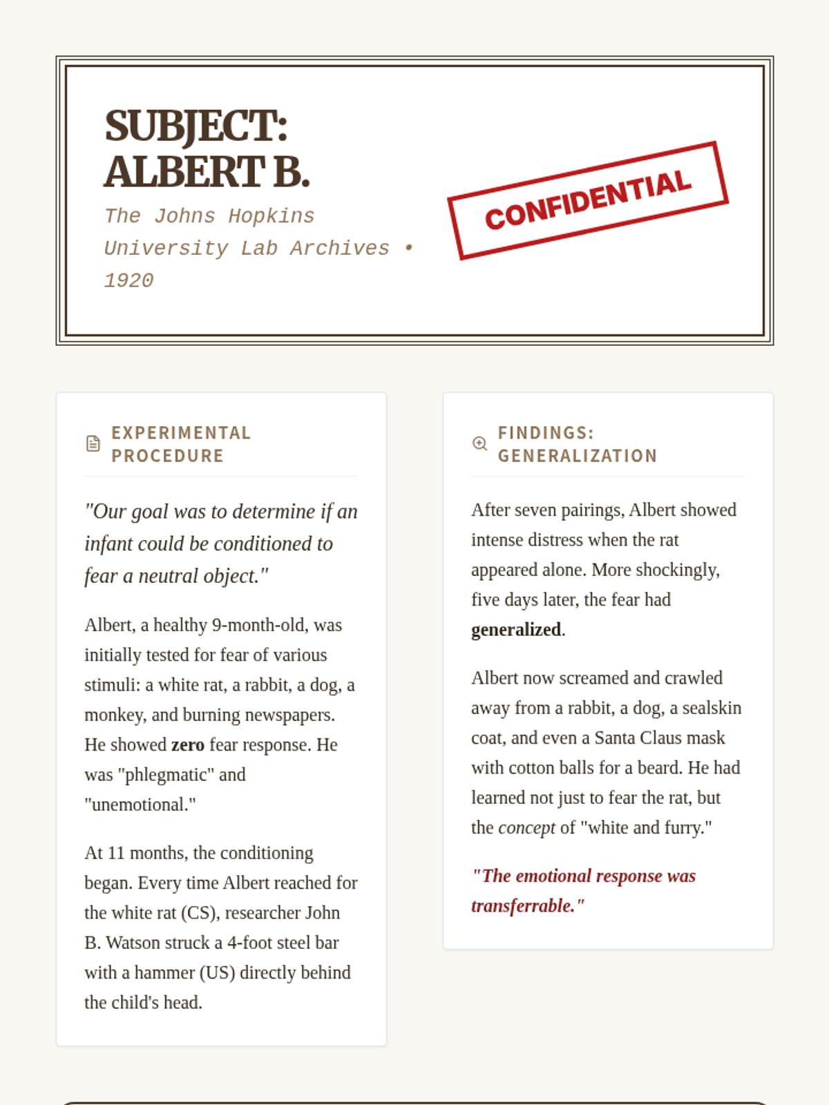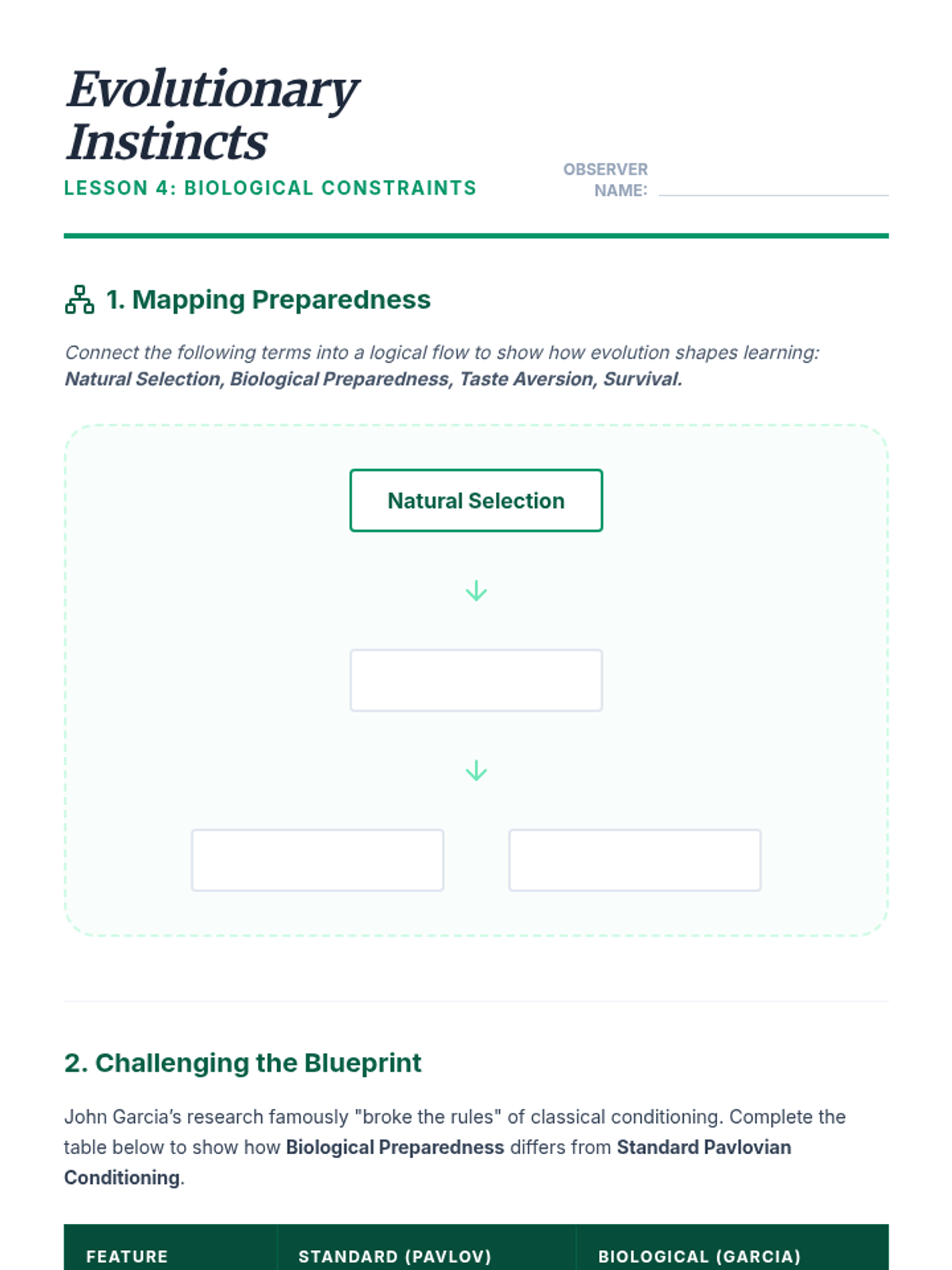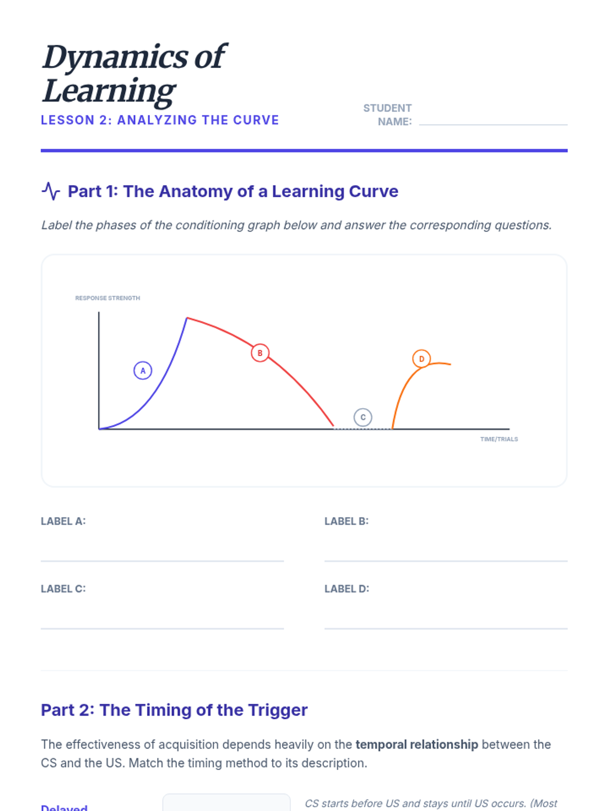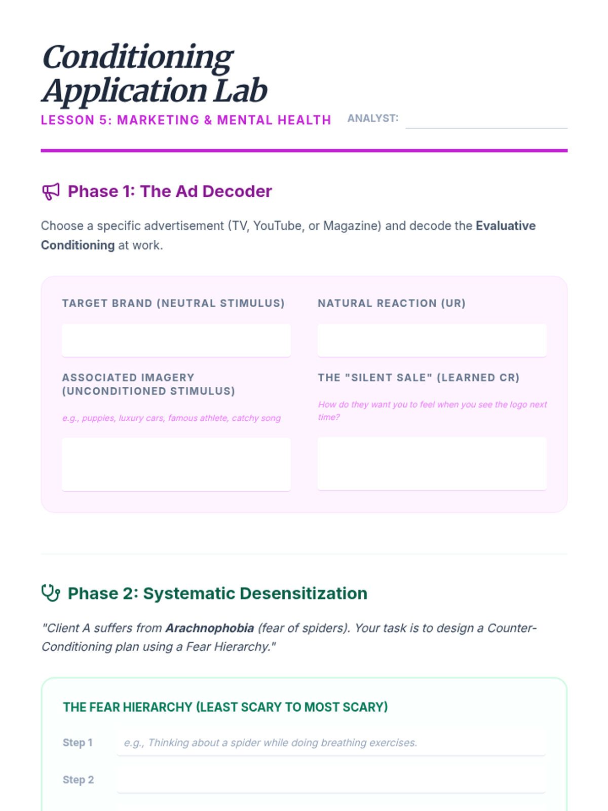 This 5-lesson sequence explores the mechanics, dynamics, and ethical implications of classical conditioning. Students move from basic Pavlovian diagrams to complex human applications in therapy and marketing, emphasizing the biological and evolutionary constraints on learning.