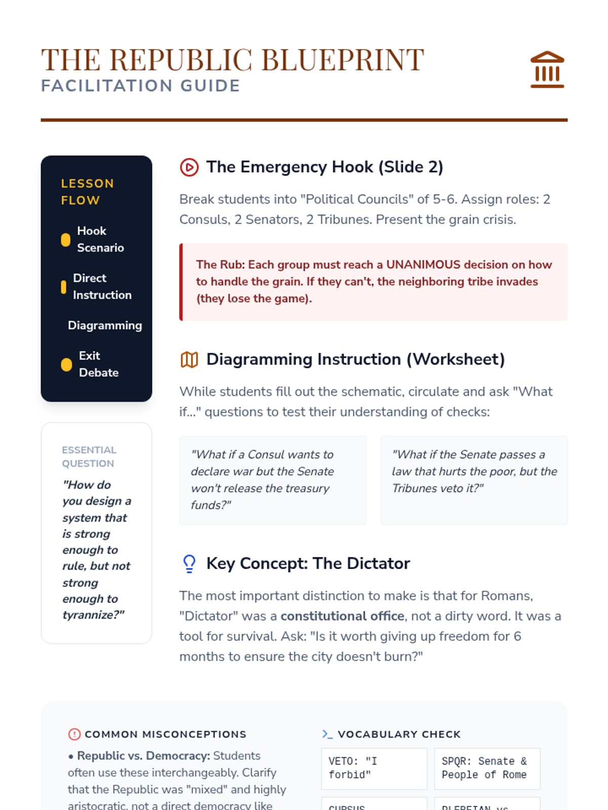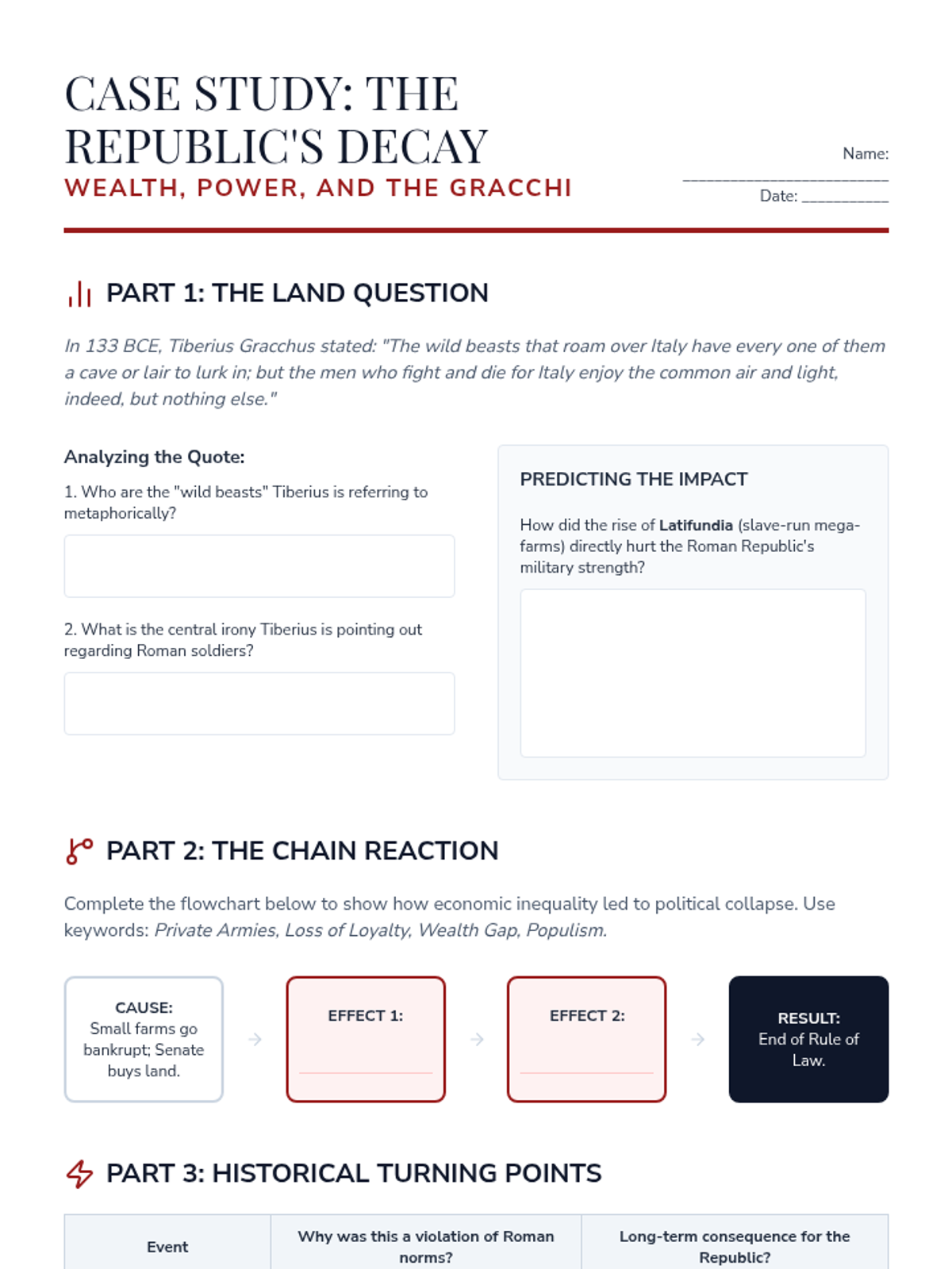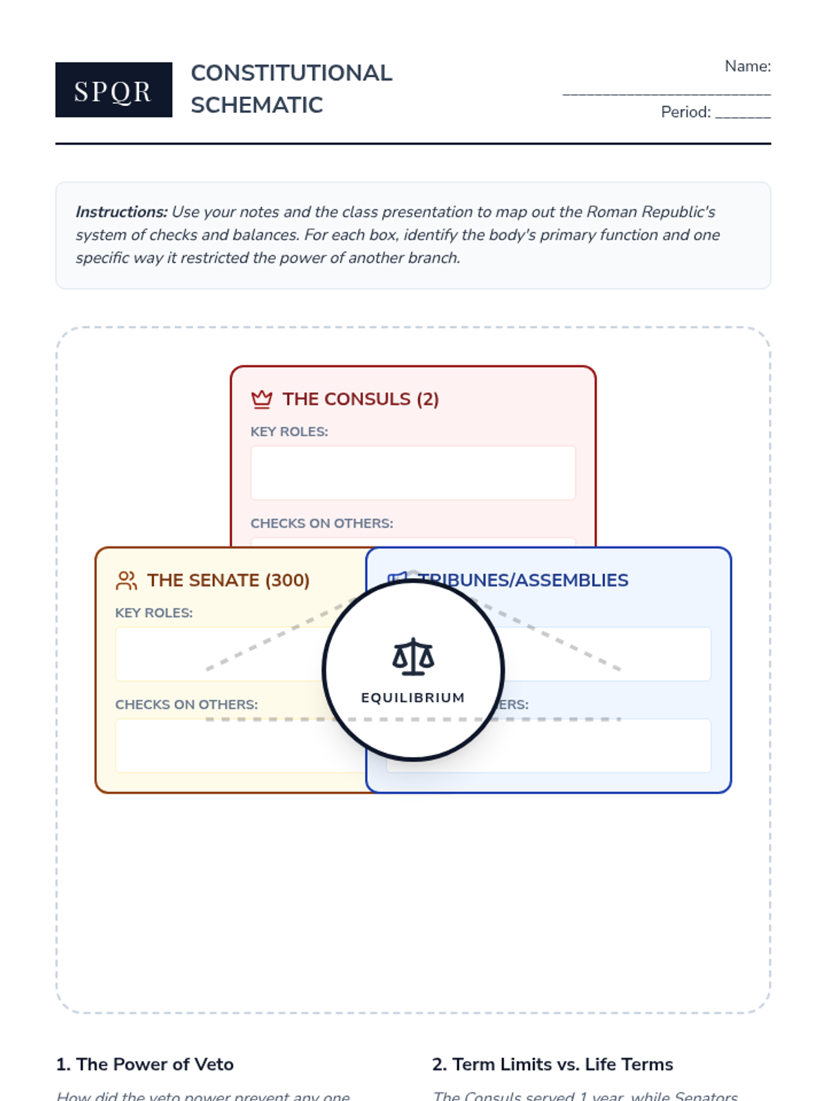 This sequence explores the evolution of political systems in the classical Mediterranean, comparing the direct democracy of Athens, the militaristic oligarchy of Sparta, and the sophisticated checks and balances of the Roman Republic. Students analyze the factors that lead to the collapse of republics and the rise of autocracy, evaluating the trade-offs between liberty and order.