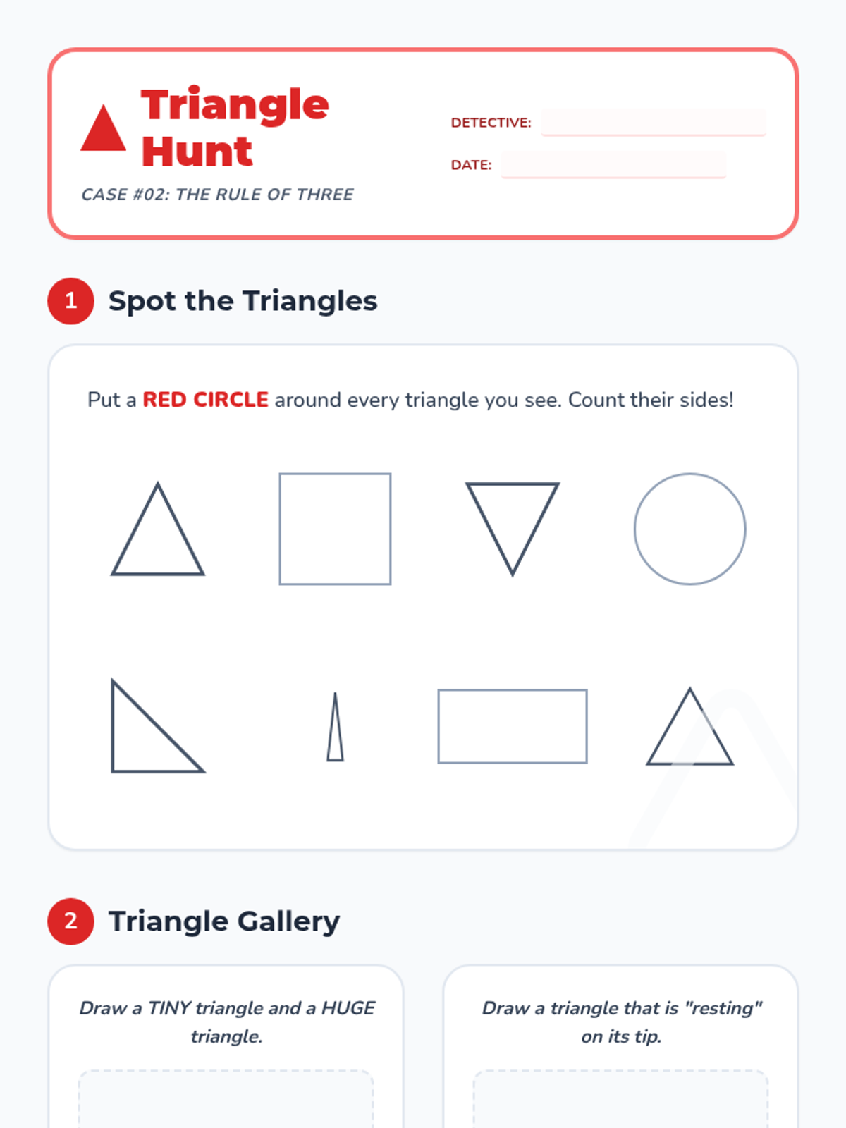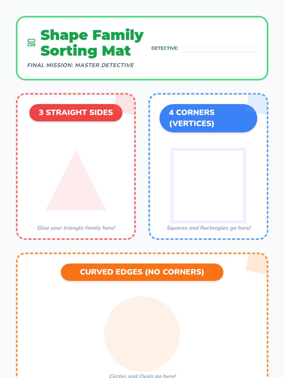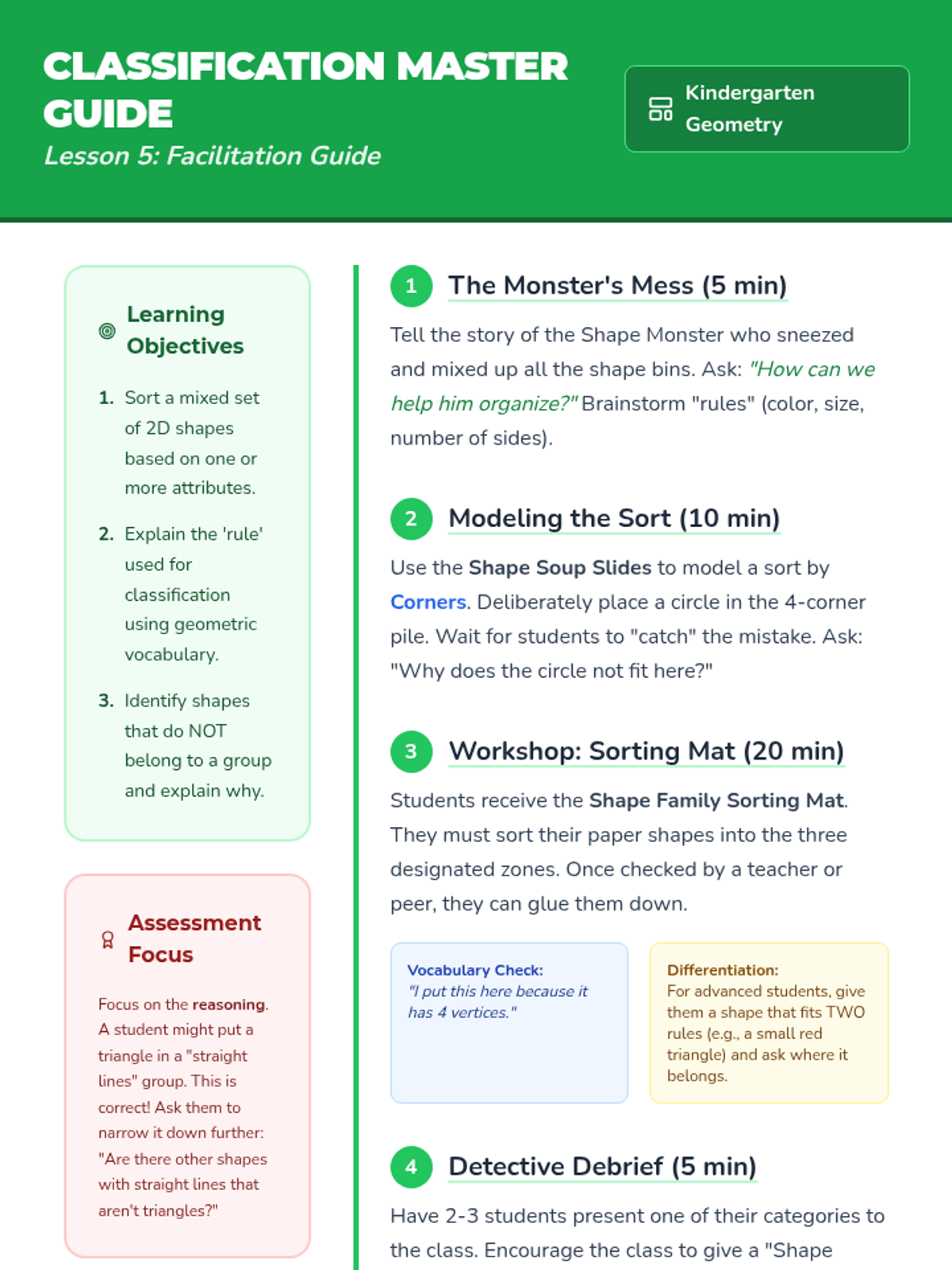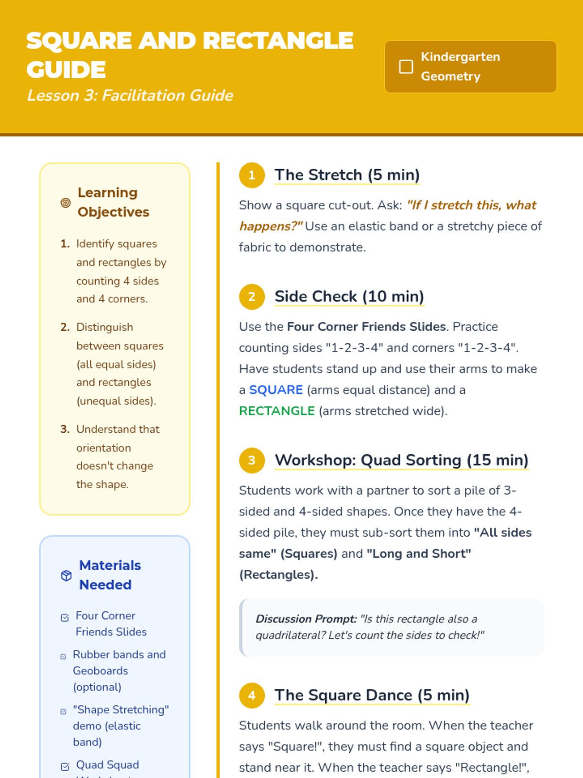 A Kindergarten geometry sequence where students learn to observe, describe, and classify 2D figures by counting sides and vertices, distinguishing between curves and straight lines.