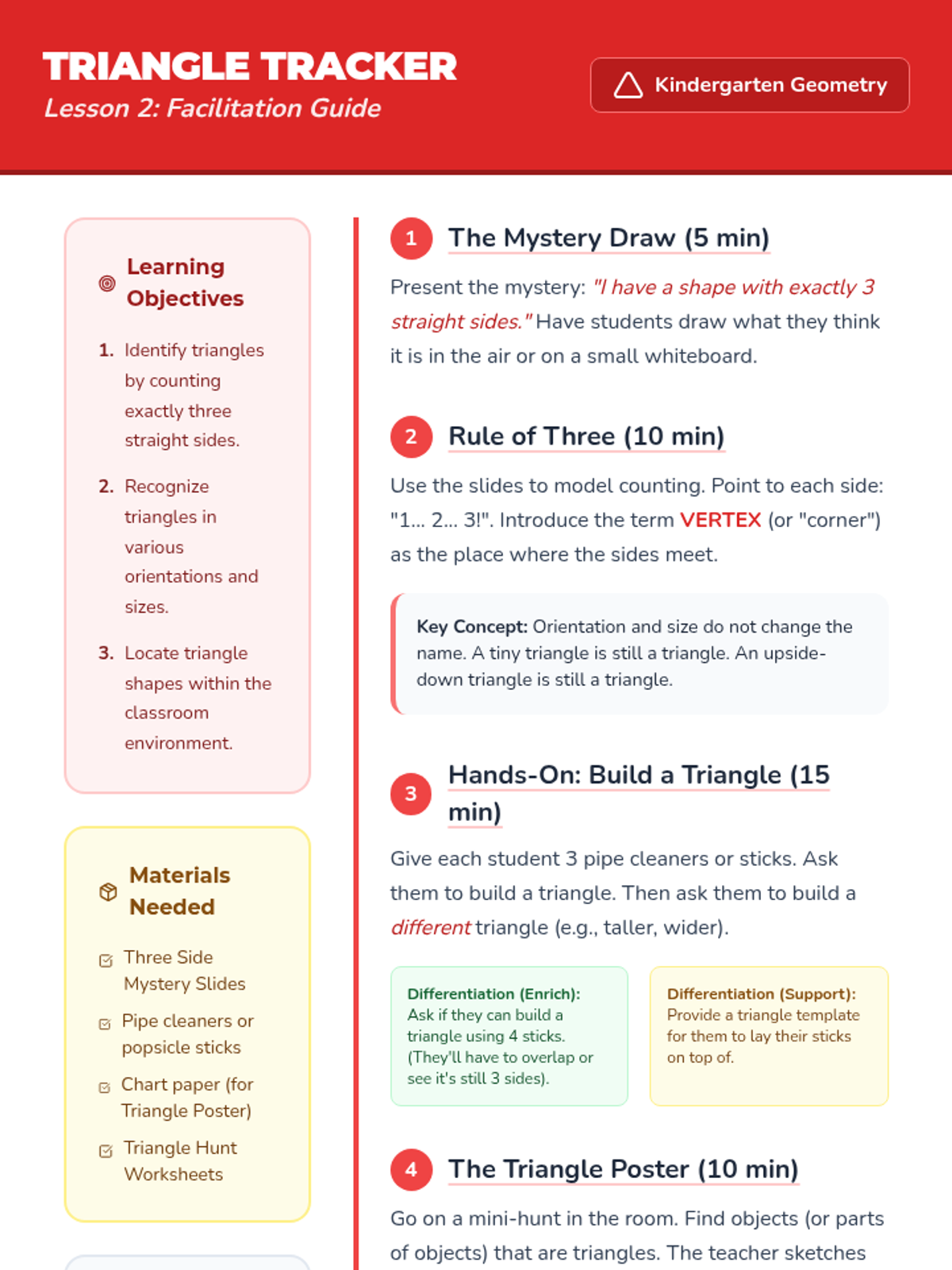 A targeted Tier 2 intervention sequence focused on helping Kindergarten students master the composition of geometric shapes using tangrams and guided discovery.