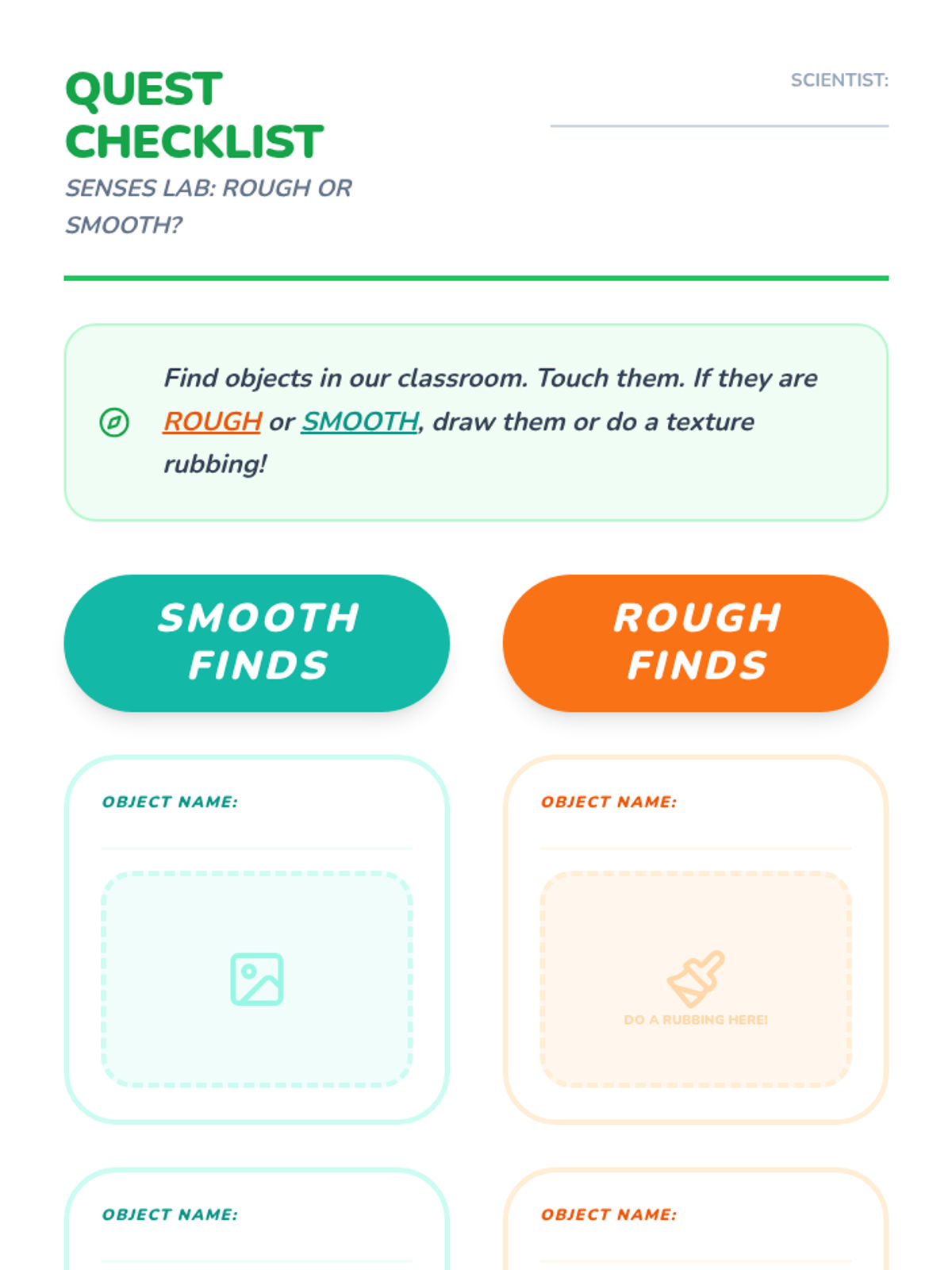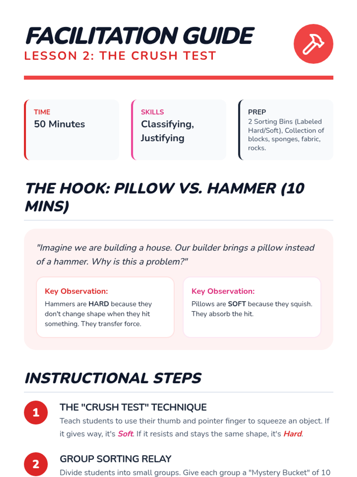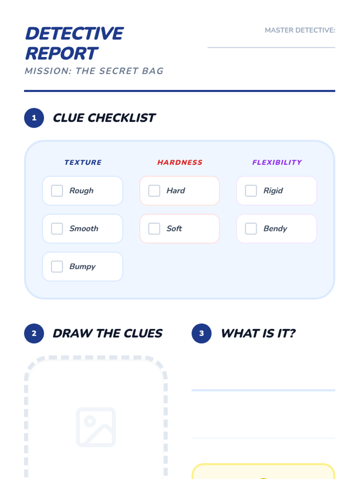 A Kindergarten science sequence exploring the tactile properties of materials (texture, hardness, flexibility) through sensory observation, classification, and inquiry-based challenges.