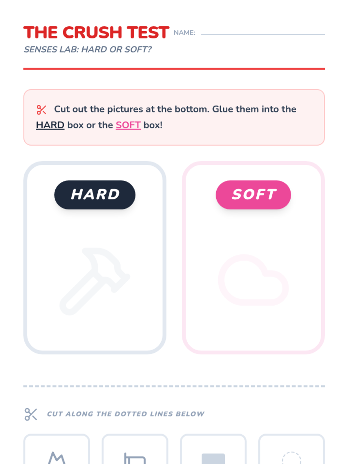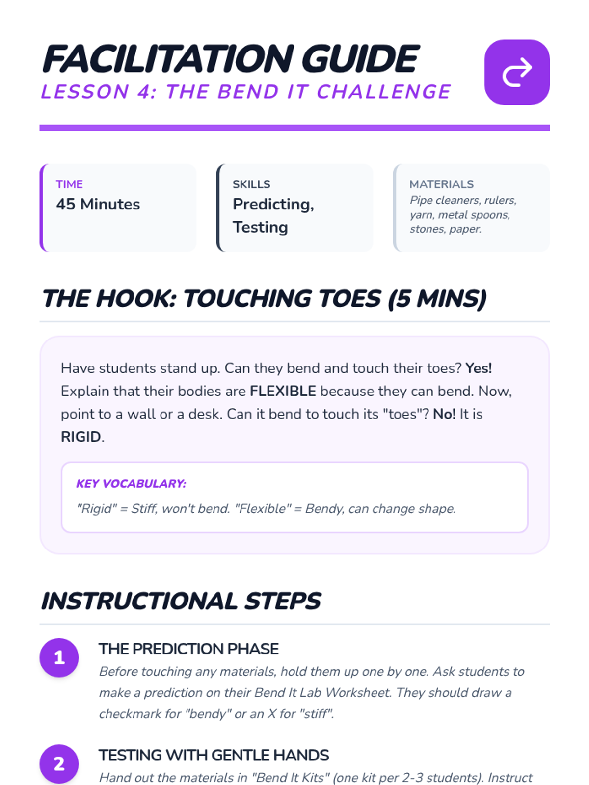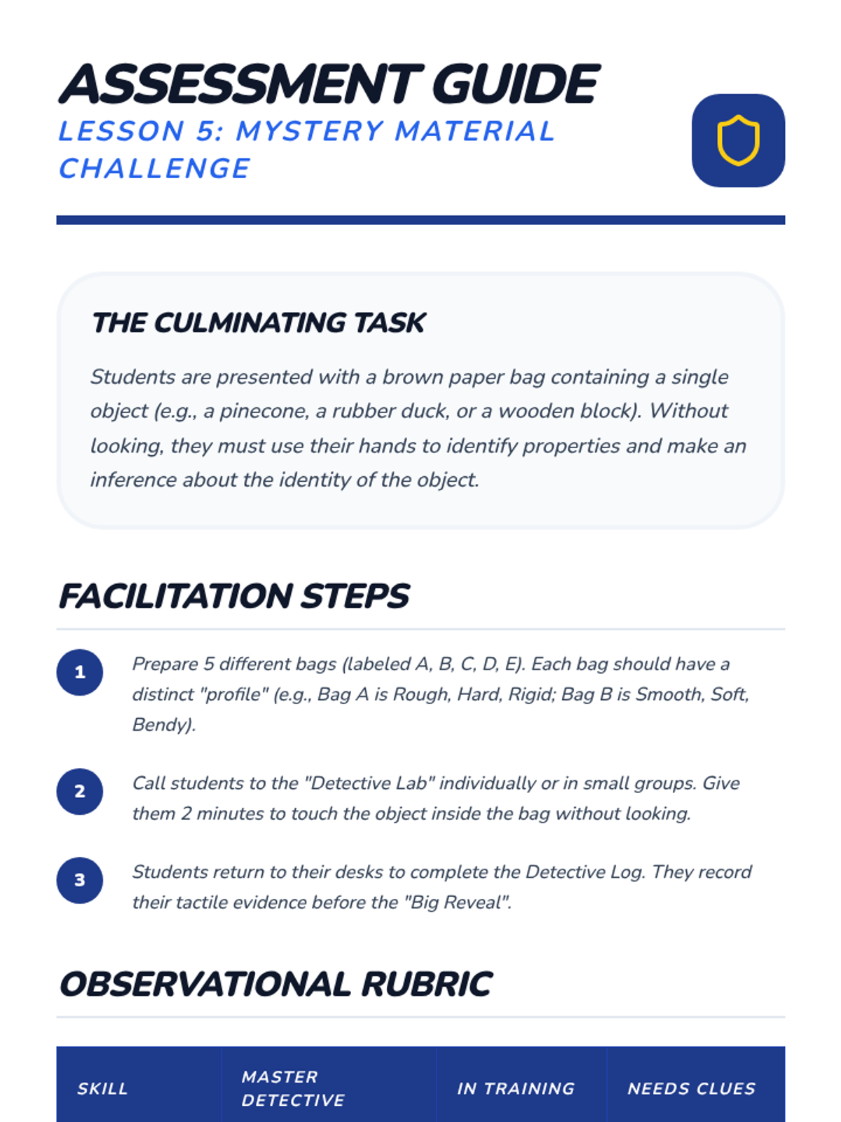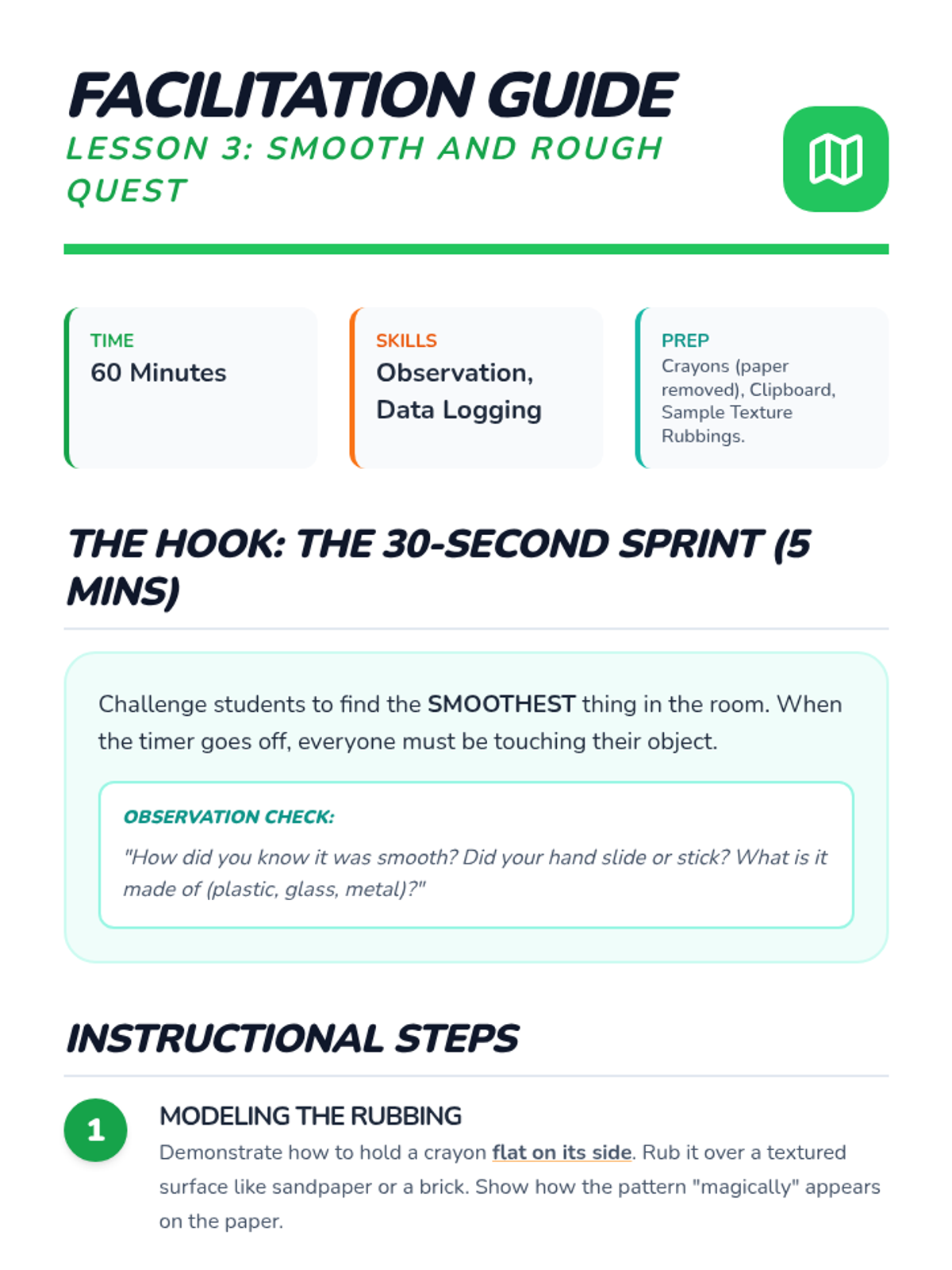 A Kindergarten science sequence exploring the tactile properties of materials (texture, hardness, flexibility) through sensory observation, classification, and inquiry-based challenges.