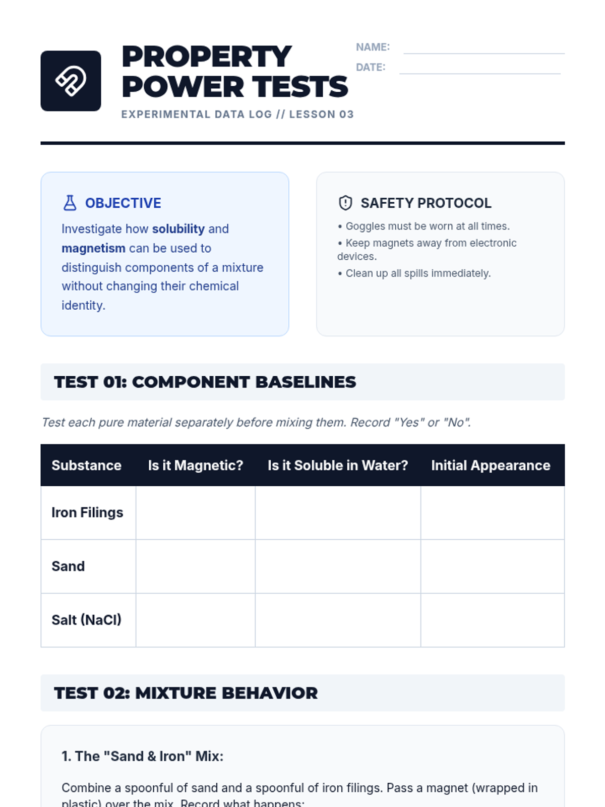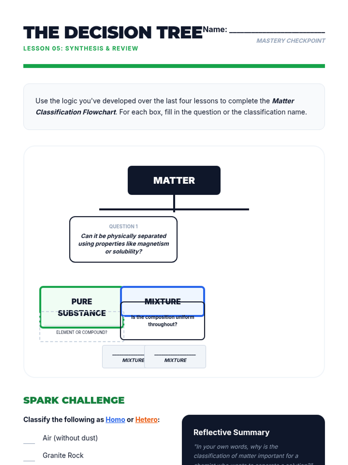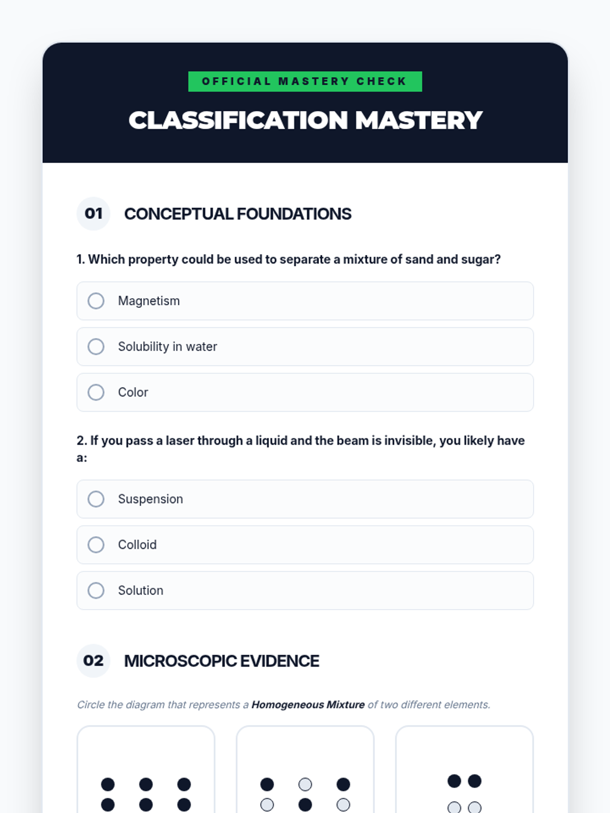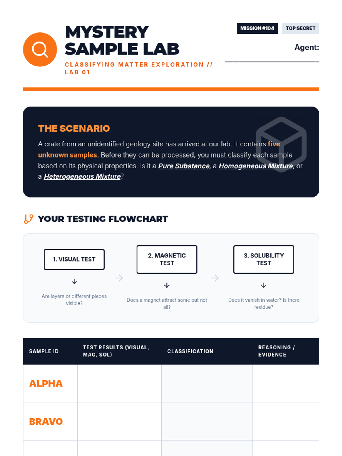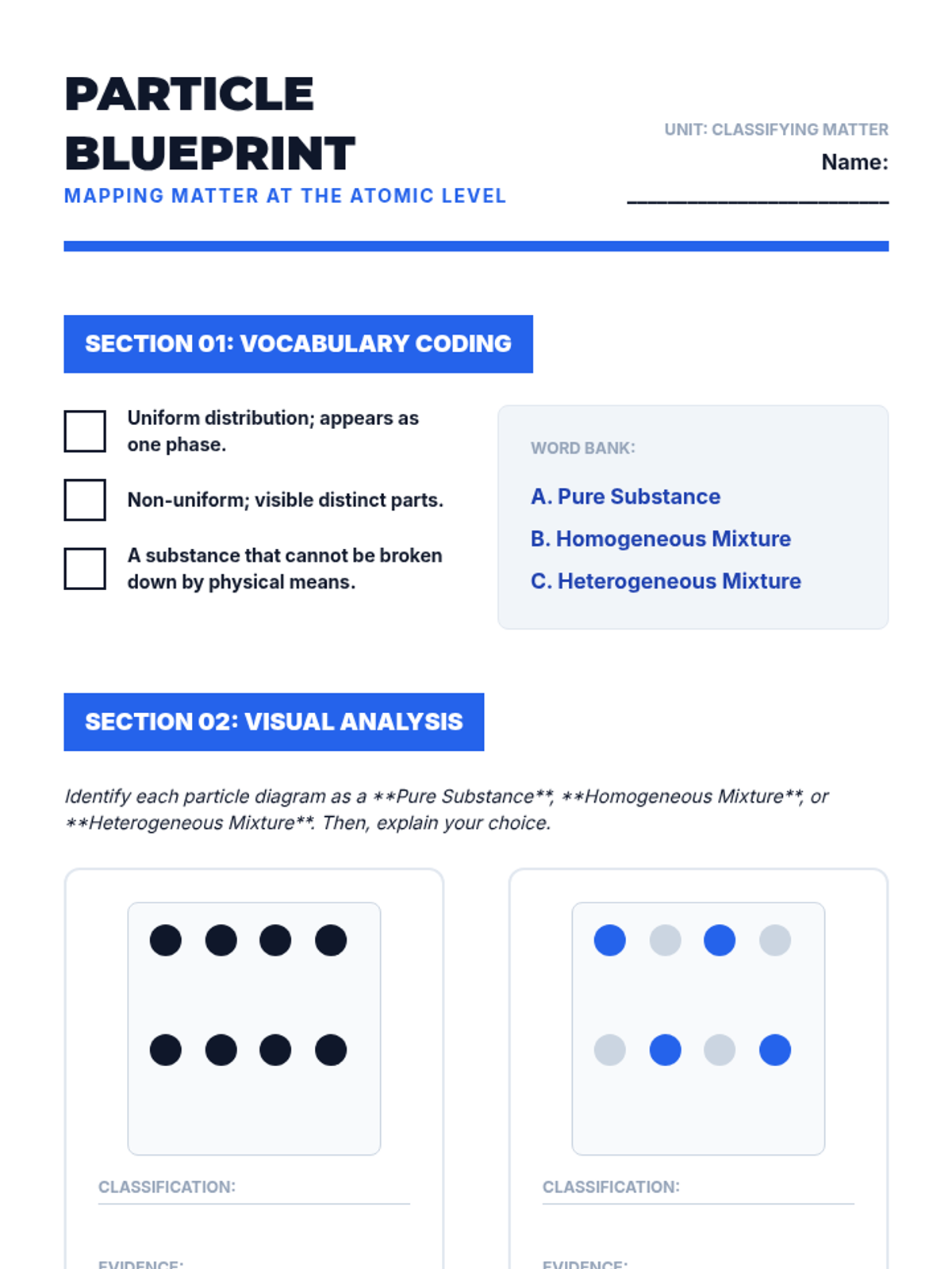 This 9th-grade physics and chemistry sequence explores the classification of matter through physical properties. Students progress from macroscopic observations to microscopic particle diagrams, conducting labs to distinguish between pure substances, homogeneous mixtures, and heterogeneous mixtures using evidence-based reasoning.