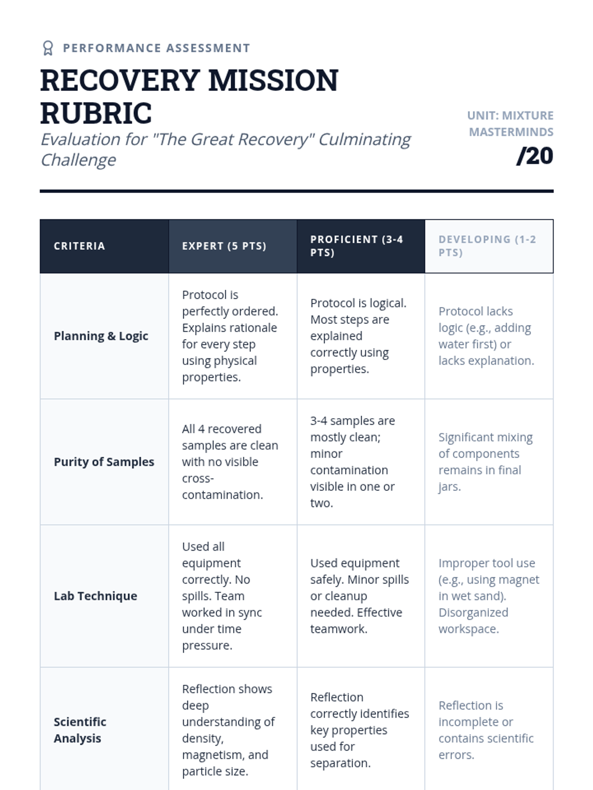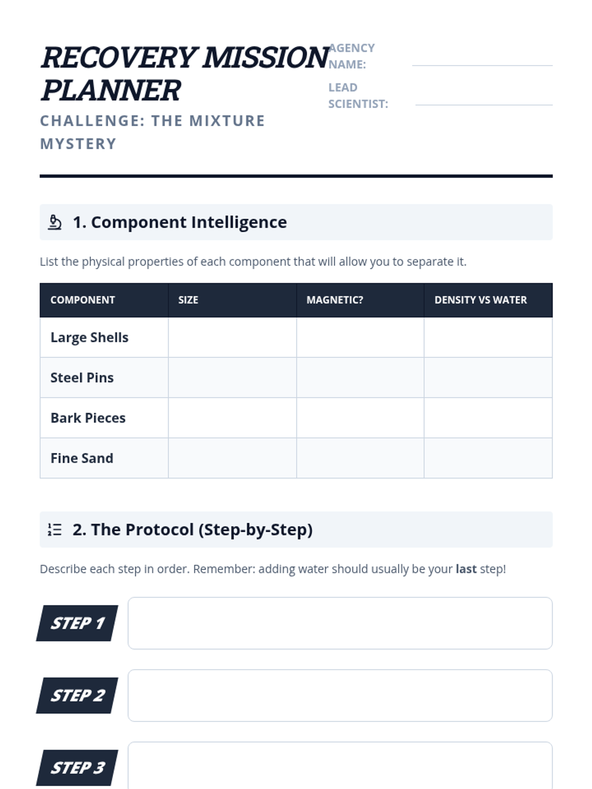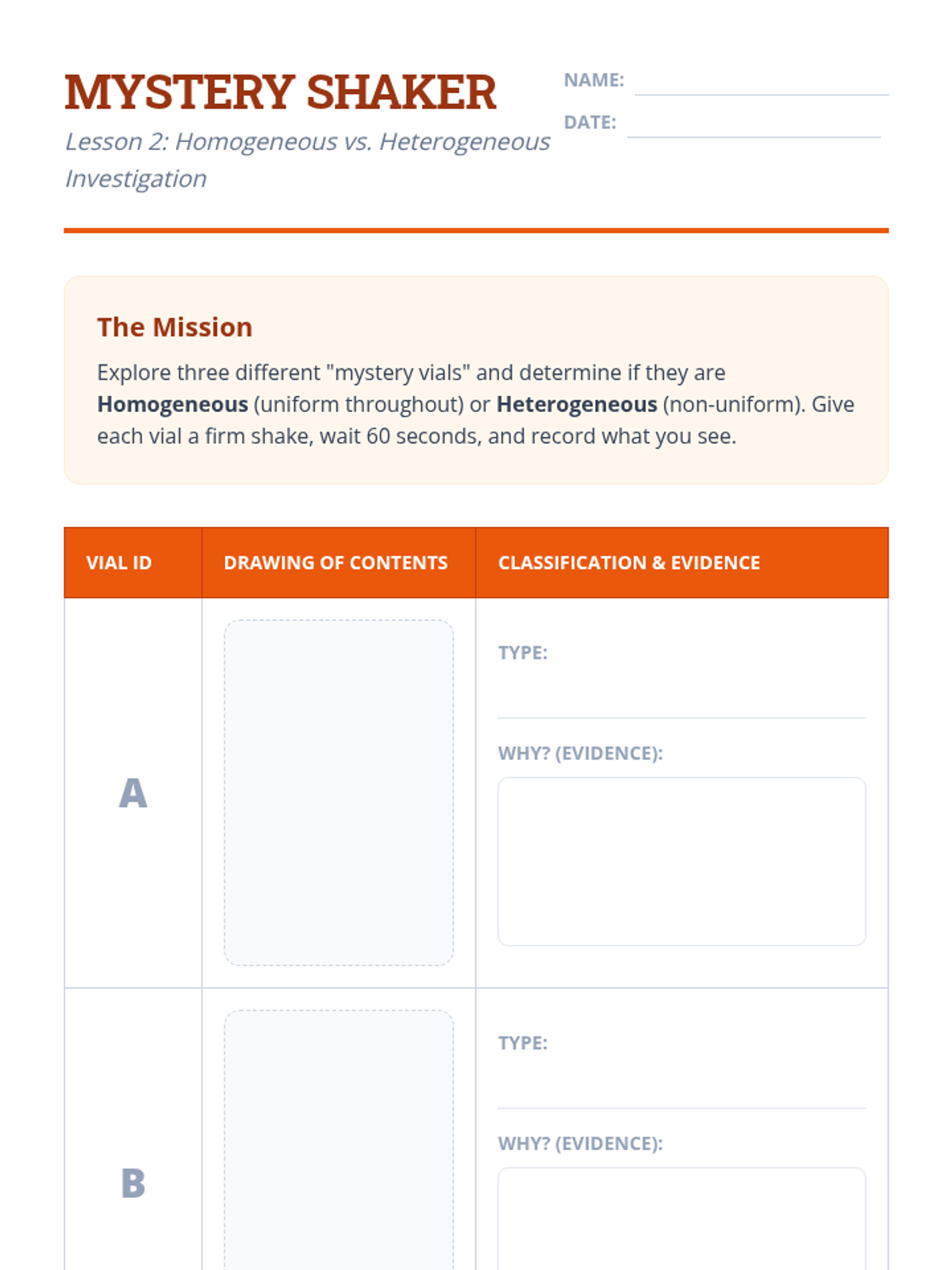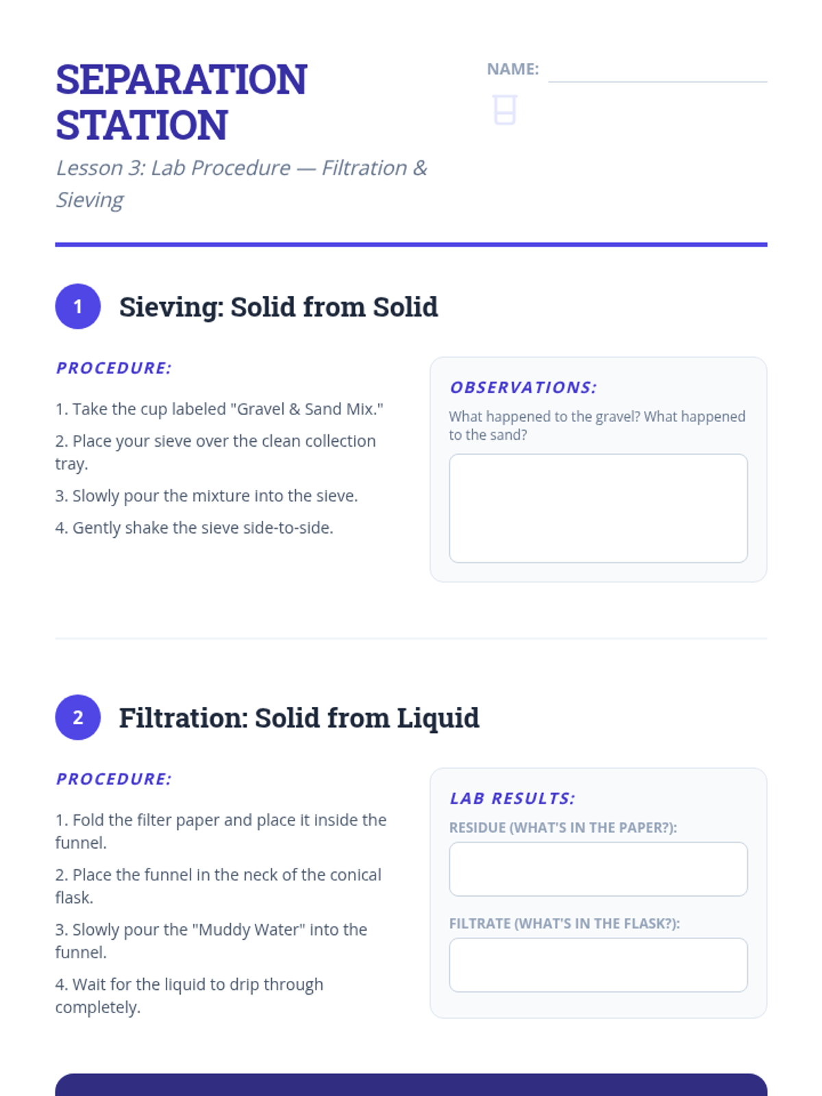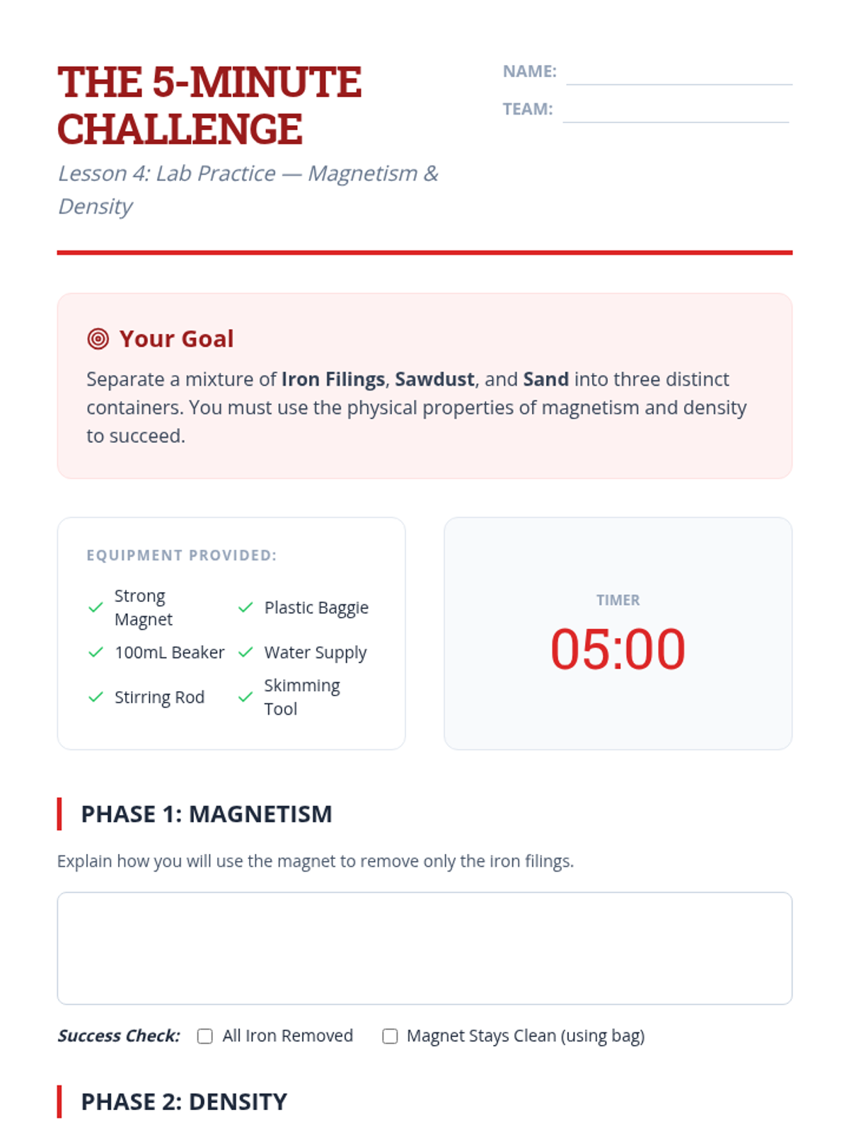 An inquiry-based exploration of the classification of matter and the physical separation of mixtures, designed for 7th-grade students. This sequence progresses from conceptual classification to hands-on mechanical separation techniques.