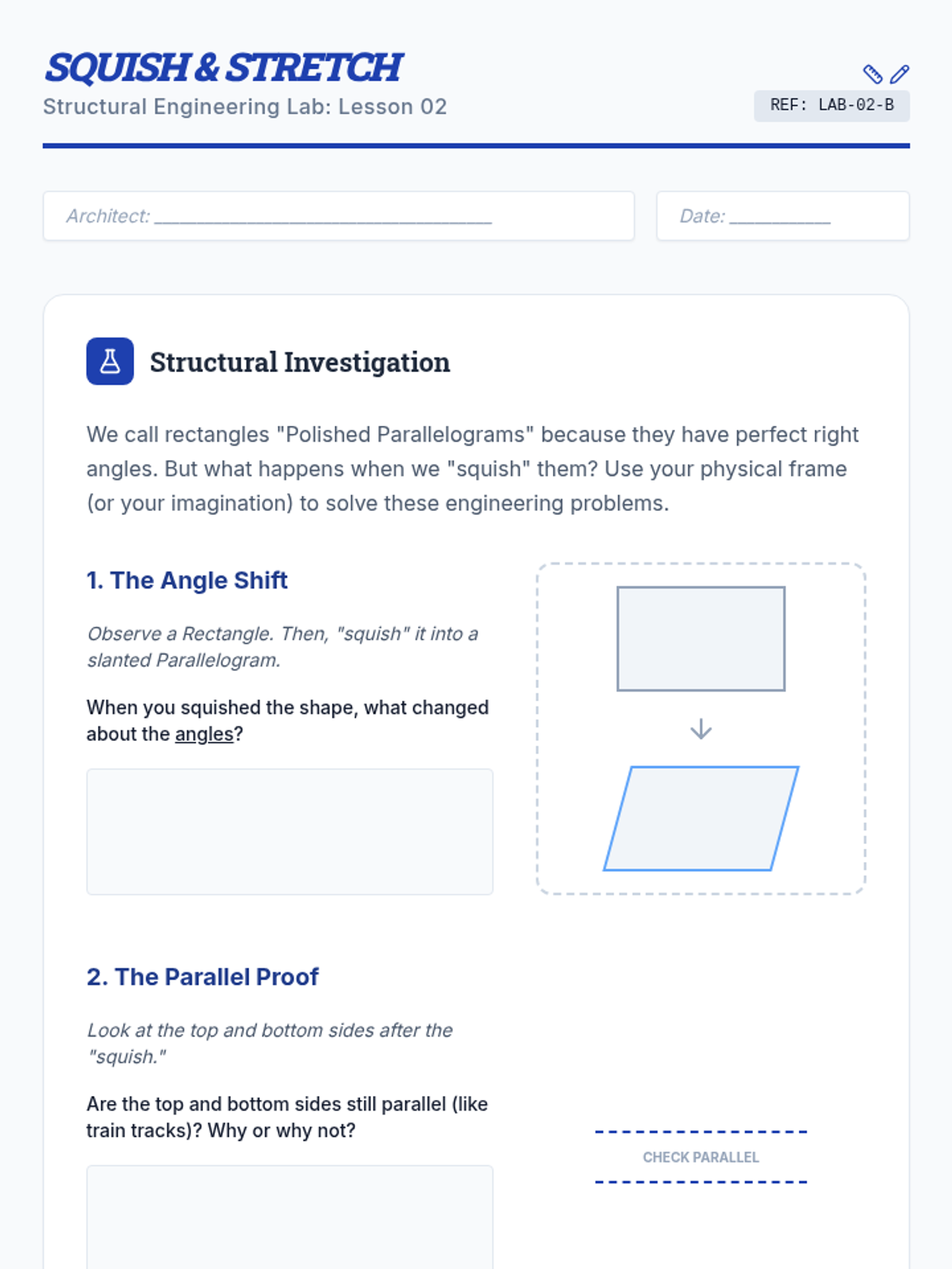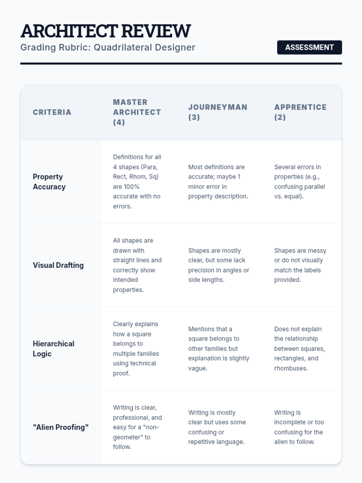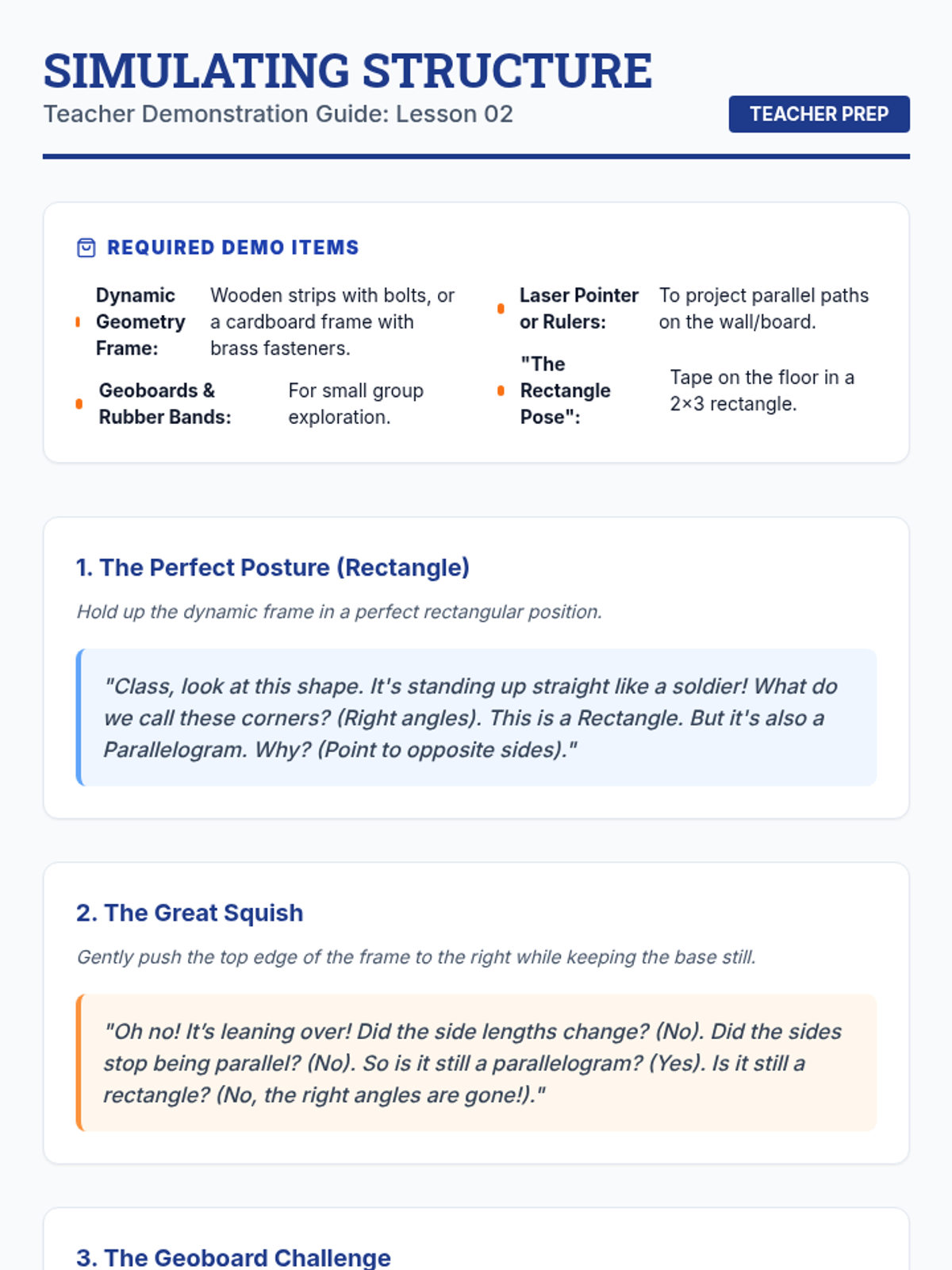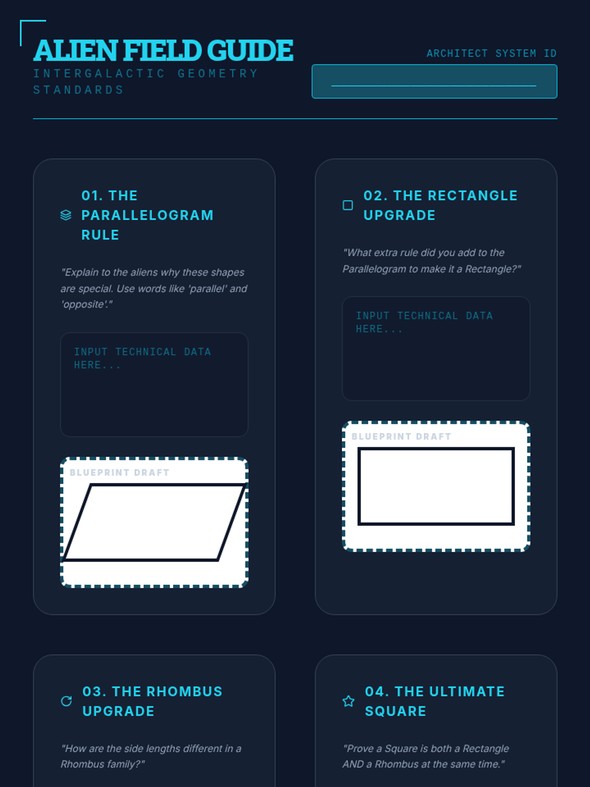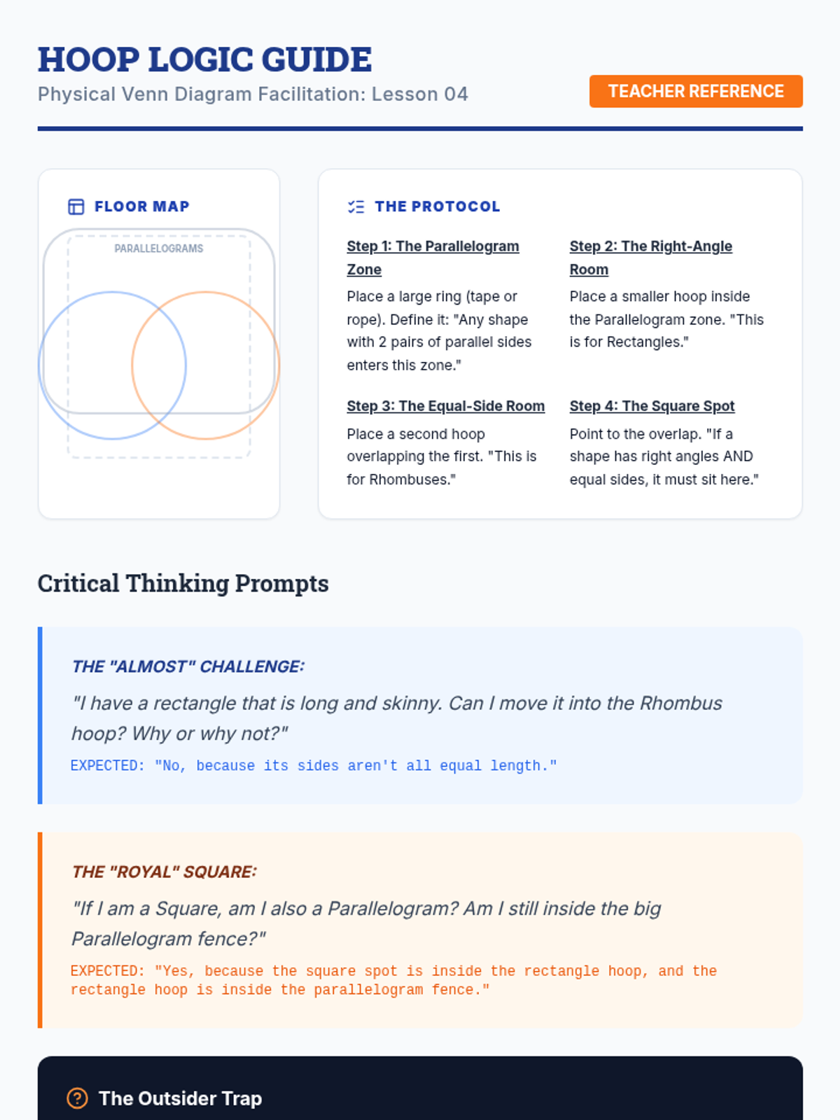This sequence guides third graders through the hierarchical classification of quadrilaterals. Students move from basic sorting to understanding complex relationships, such as why a square is both a rectangle and a rhombus, using hands-on sorting, Venn diagrams, and a final design project.