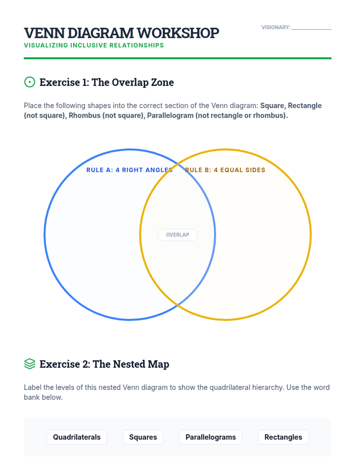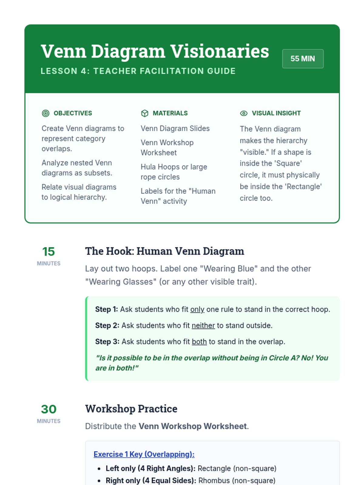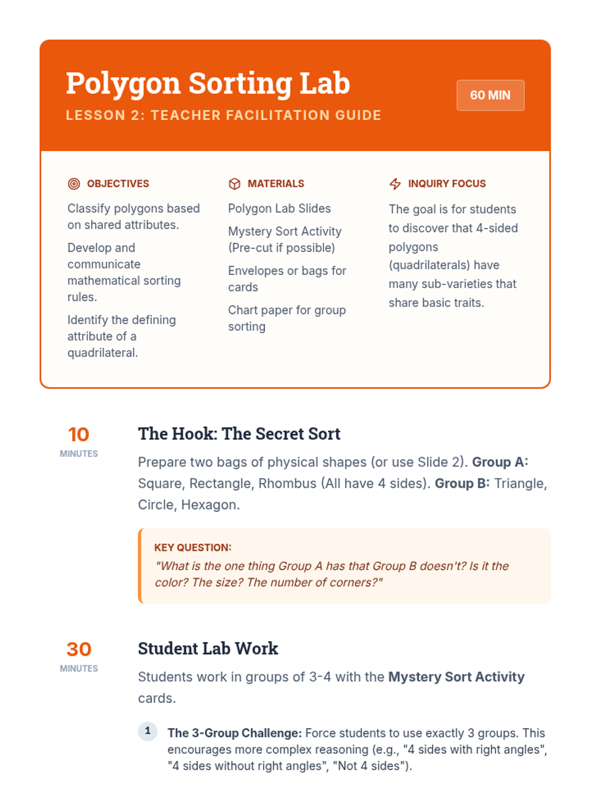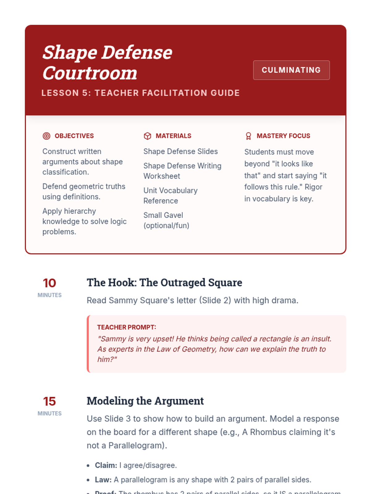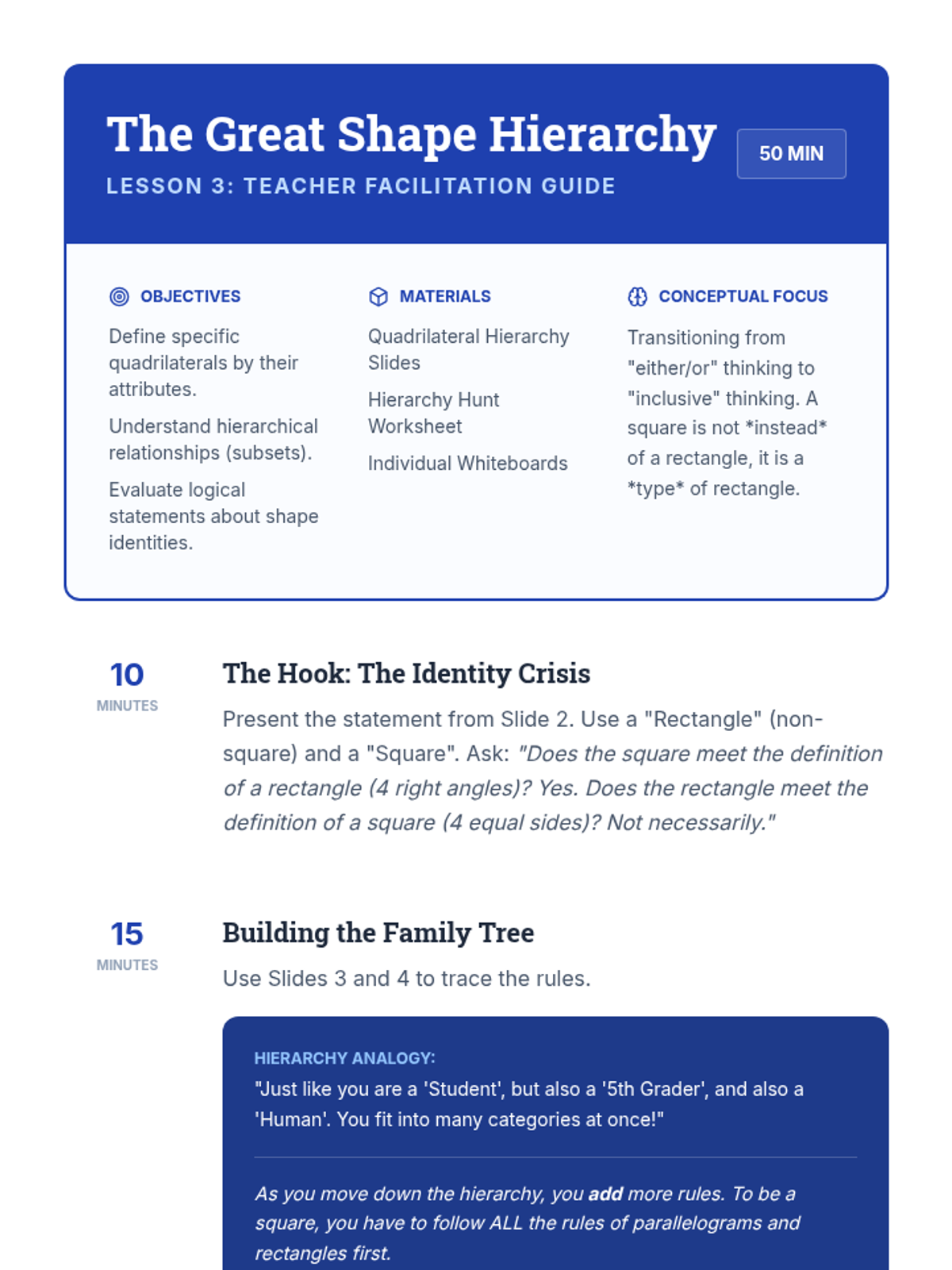 A Tier 2 intervention unit focused on the hierarchical classification of two-dimensional figures, helping students understand that subcategories inherit the attributes of their parent categories.