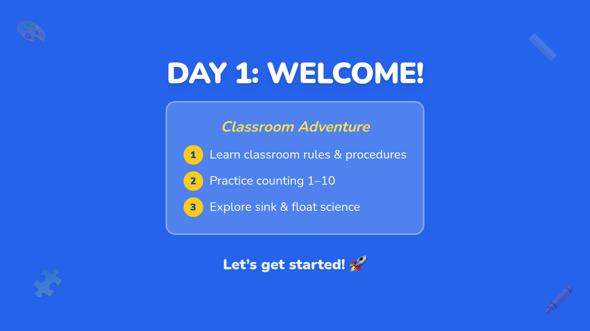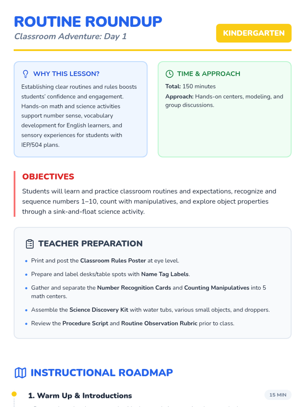 A two-session back-to-school unit for kindergarten covering math, science, and classroom procedures. Students learn routines and expectations while engaging in hands-on math centers, a science exploration, and fun classroom games.
