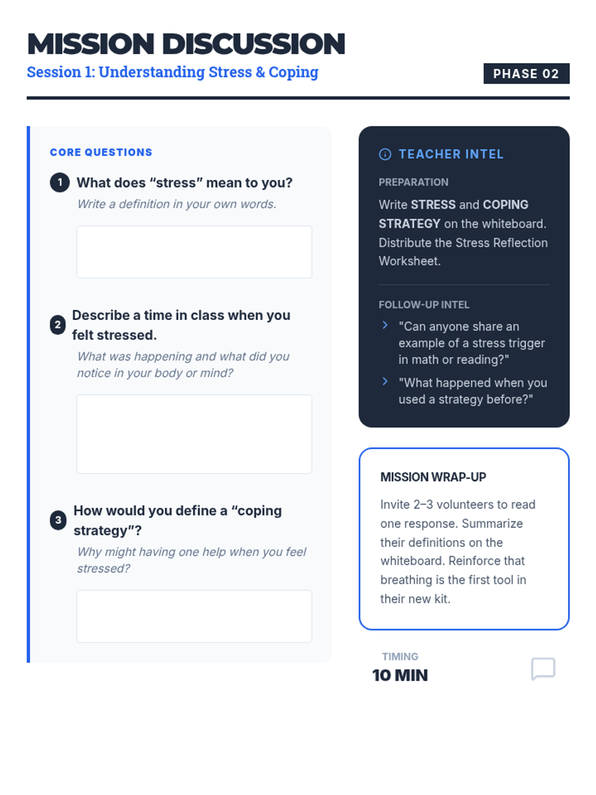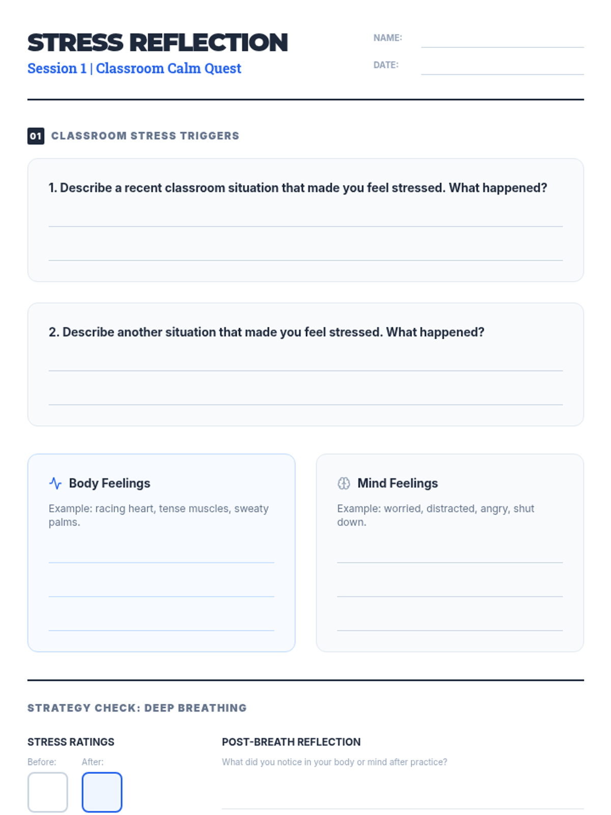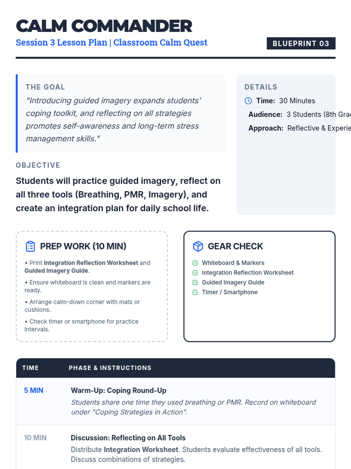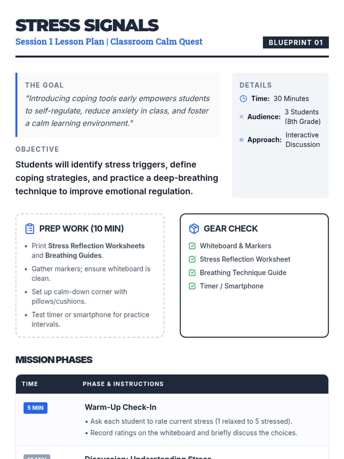 A three-session series for eighth-grade boys to master coping strategies like deep breathing, PMR, and guided imagery to manage classroom stress.