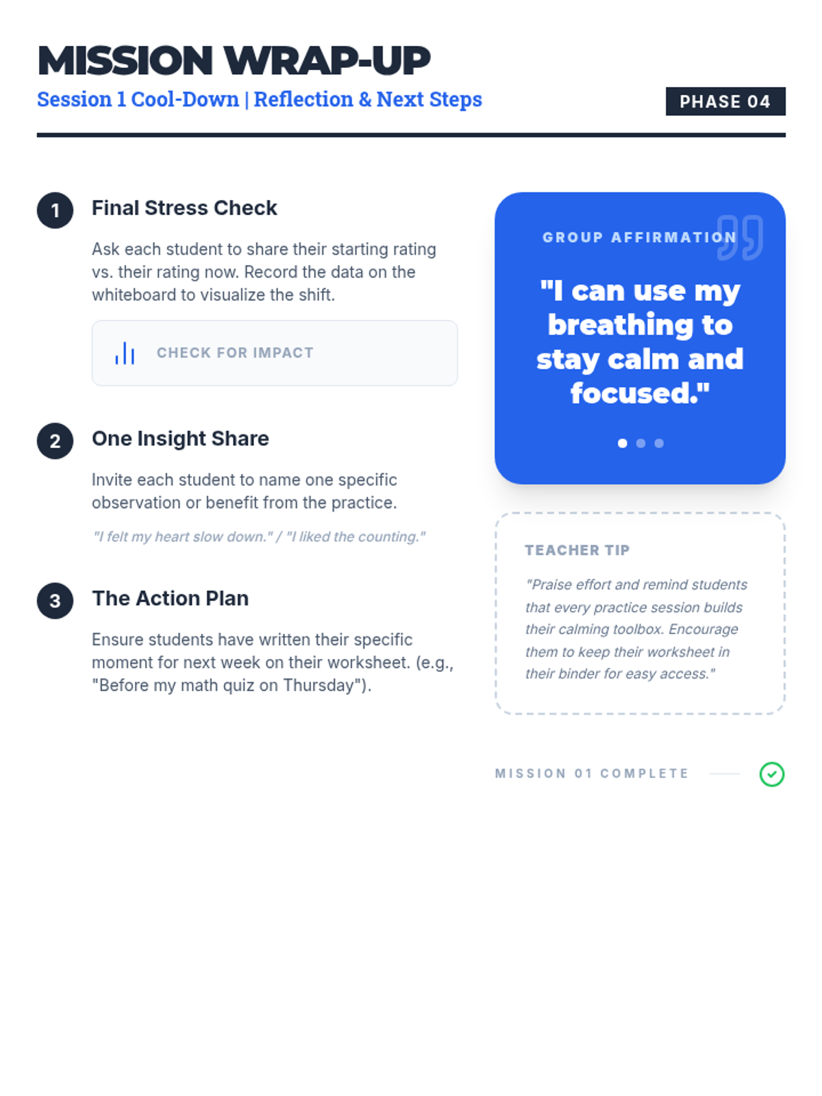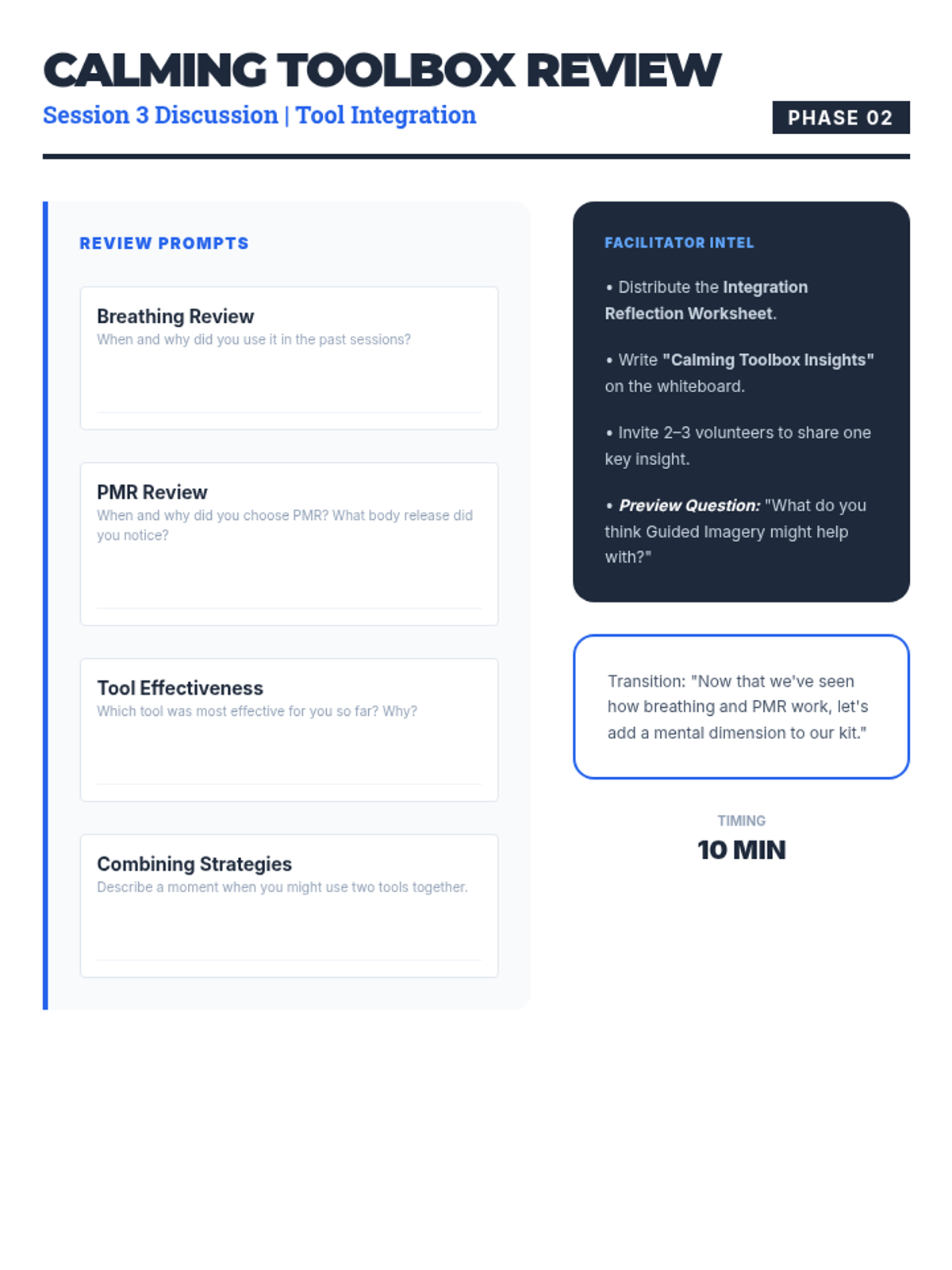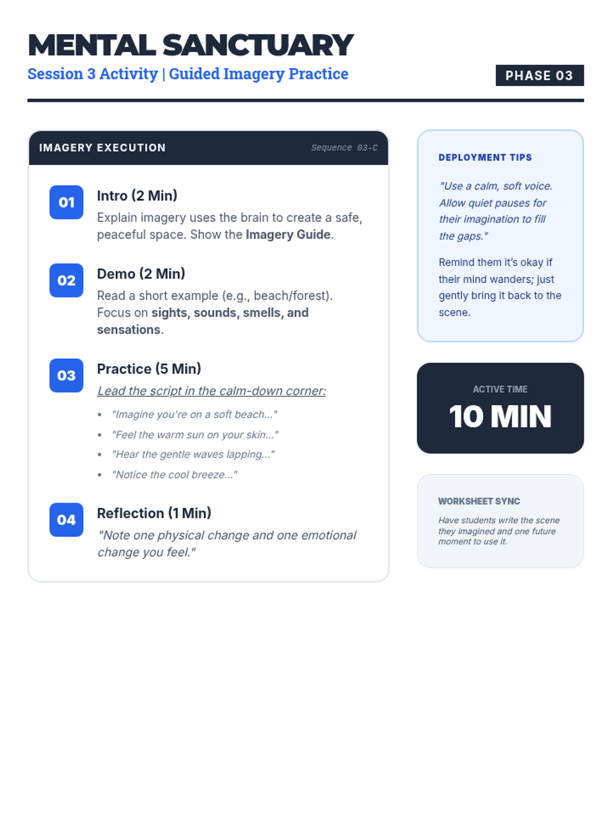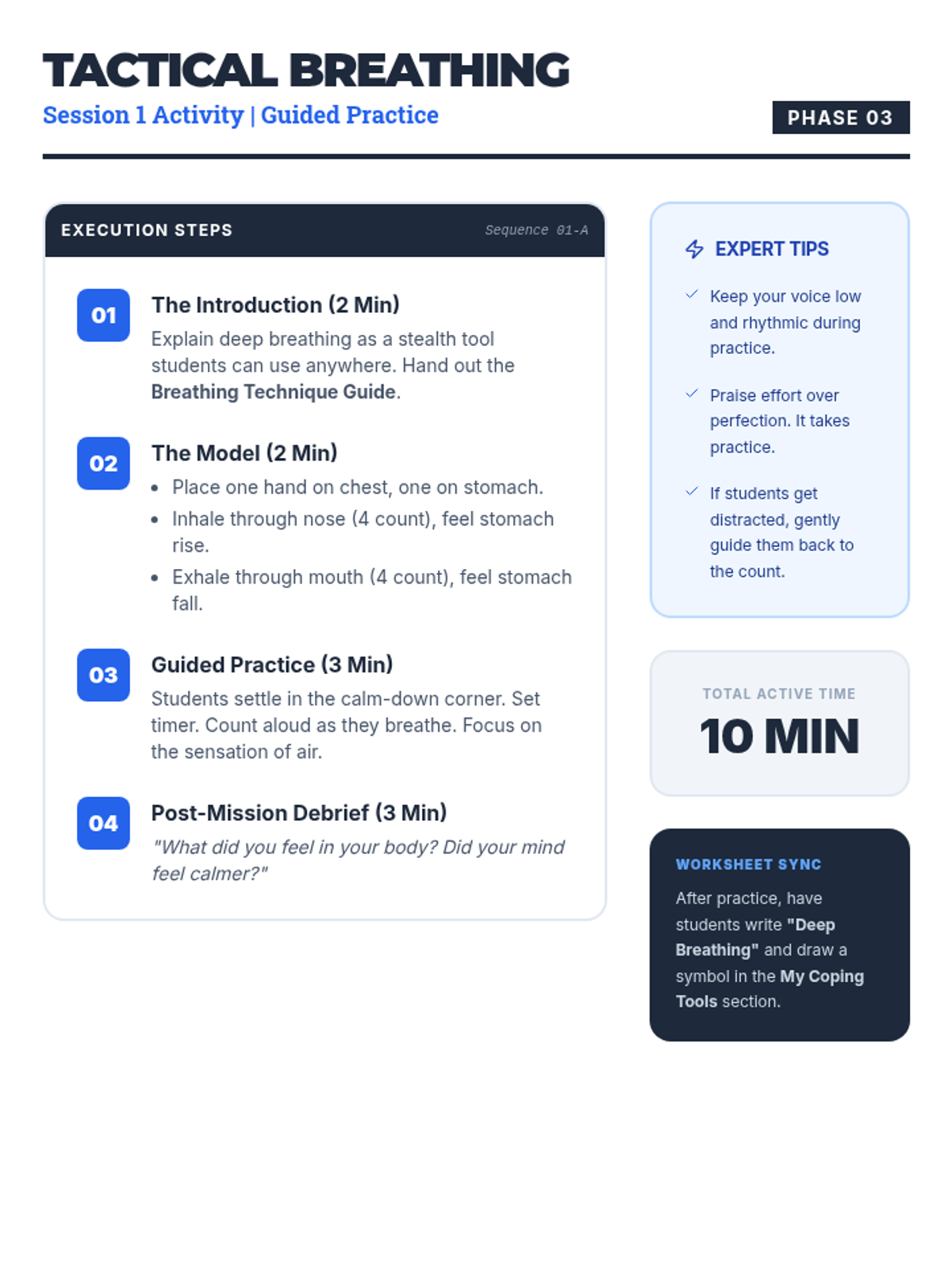 A three-session series for eighth-grade boys to master coping strategies like deep breathing, PMR, and guided imagery to manage classroom stress.