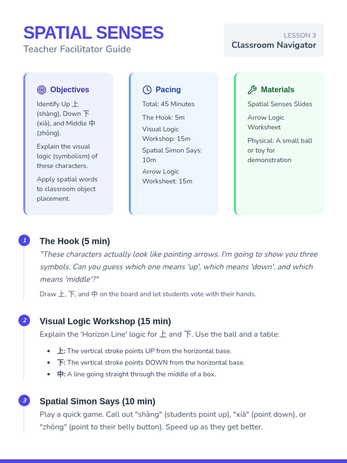 A beginner Mandarin Chinese sequence for 4th graders focusing on connecting written characters to physical actions and body parts through Total Physical Response (TPR). Students will progress from individual nouns and verbs to constructing simple Subject-Verb sentences.
