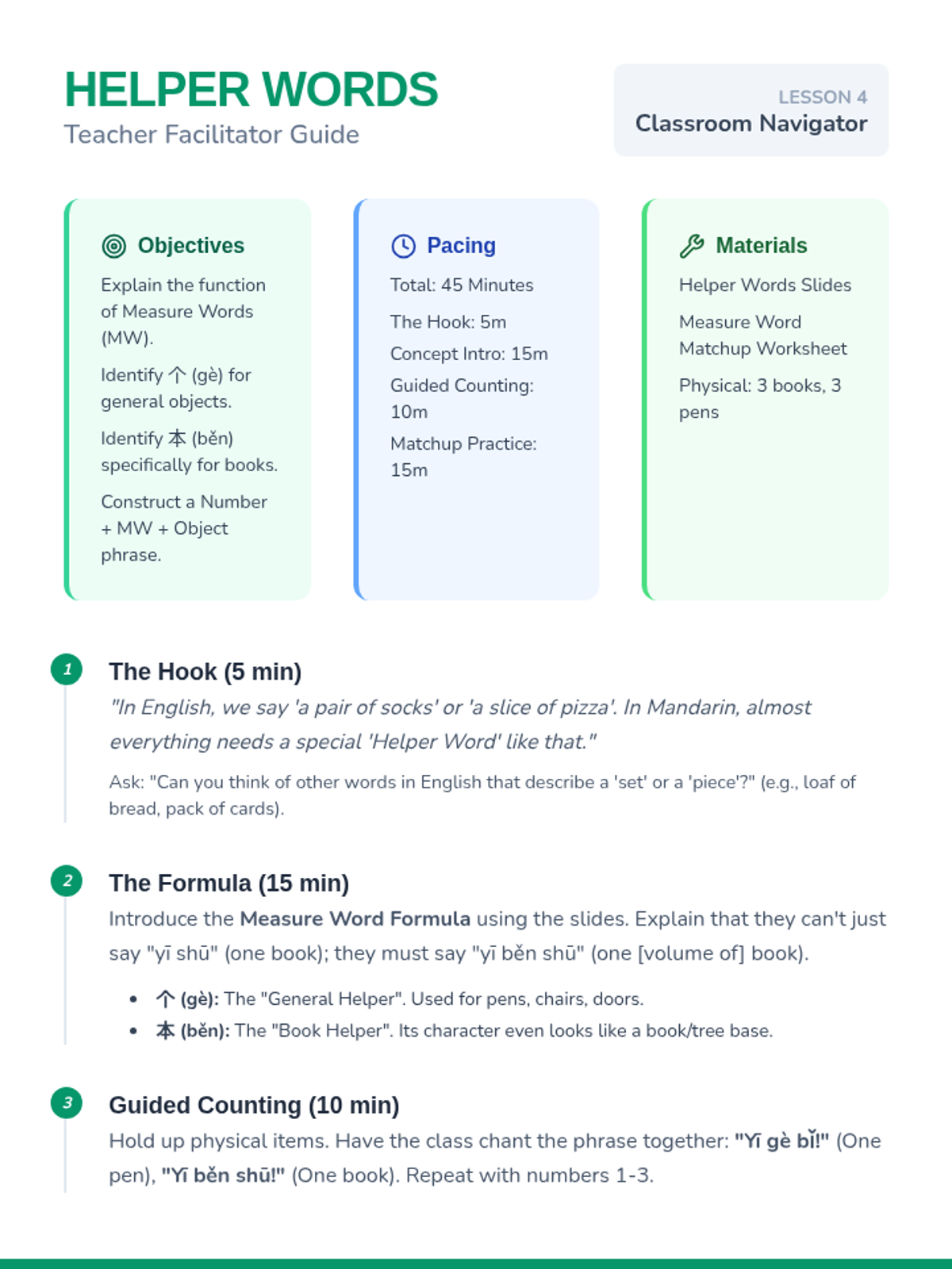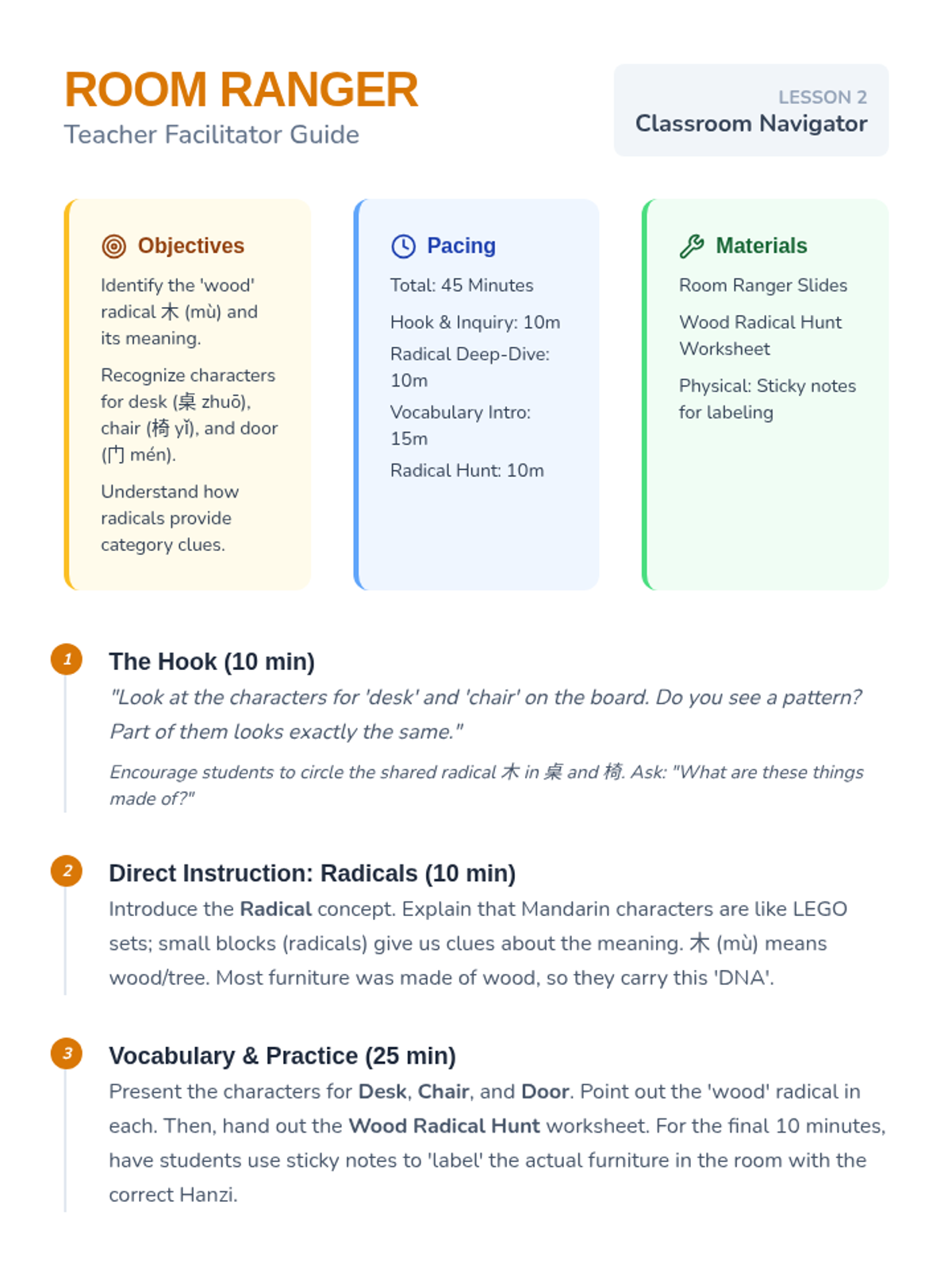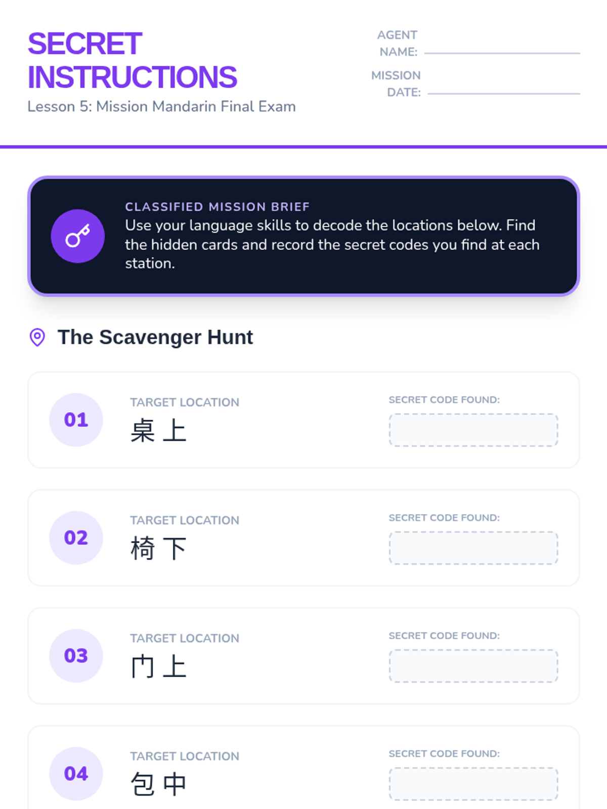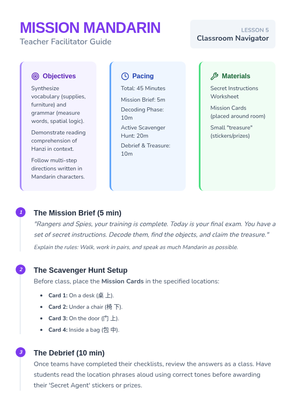 A 5-lesson sequence for 4th grade students to learn Mandarin Chinese characters related to classroom objects, furniture, spatial locations, and the concept of measure words, culminating in a classroom scavenger hunt.