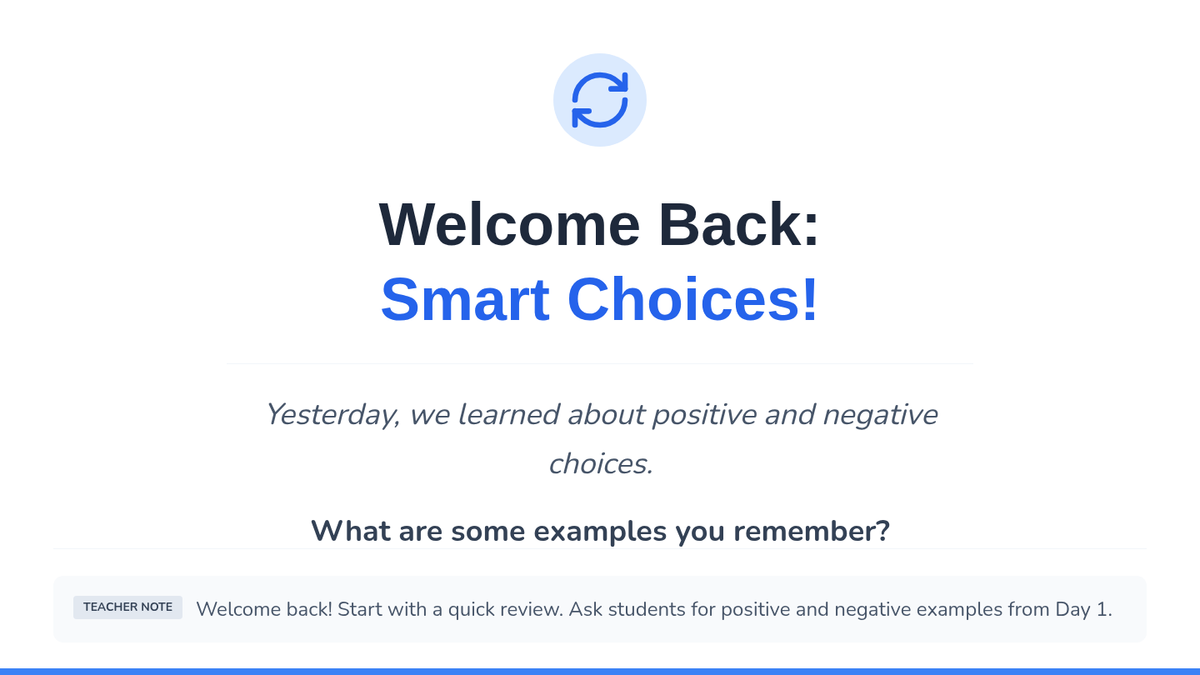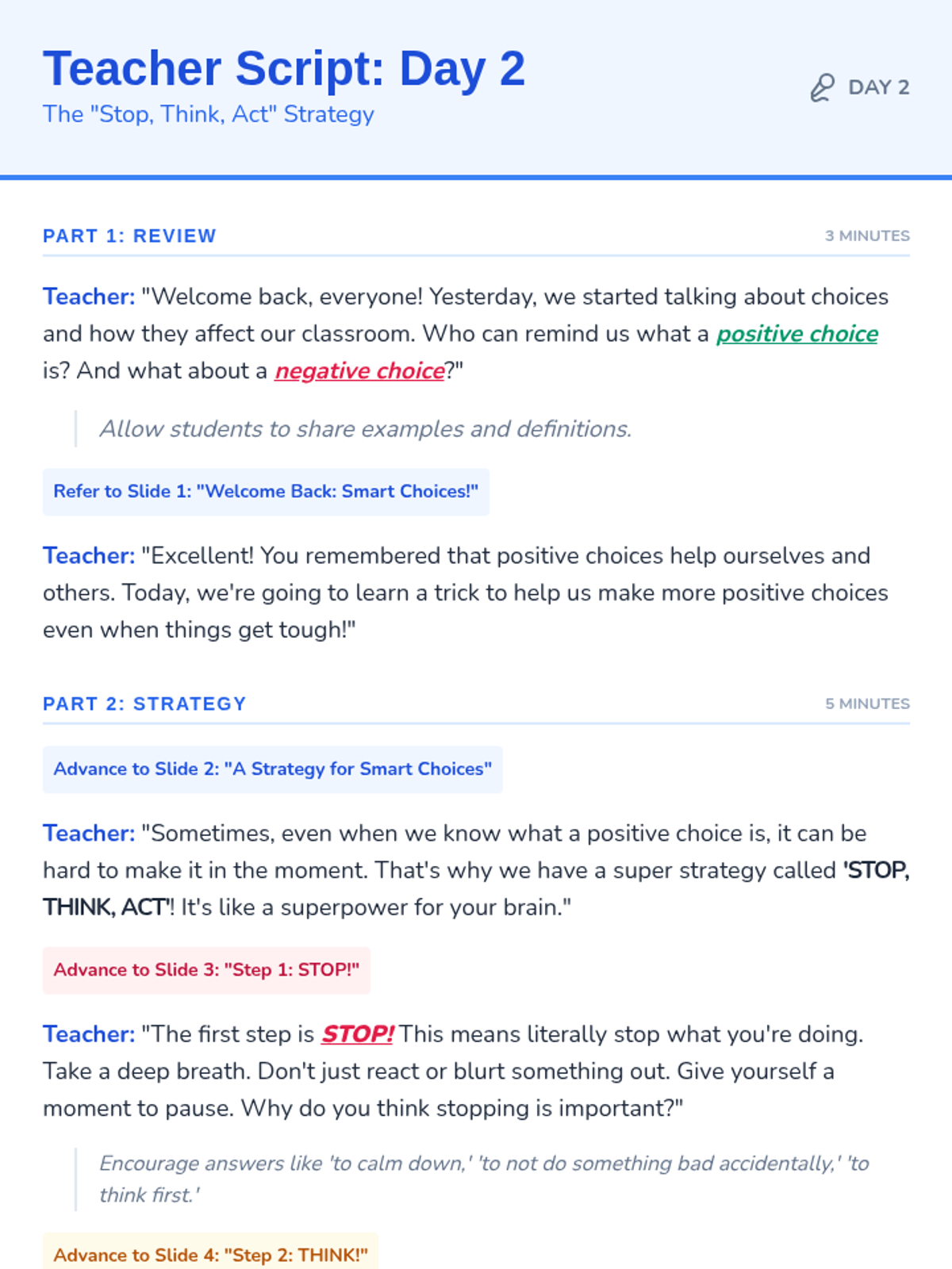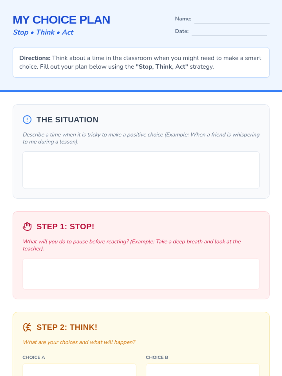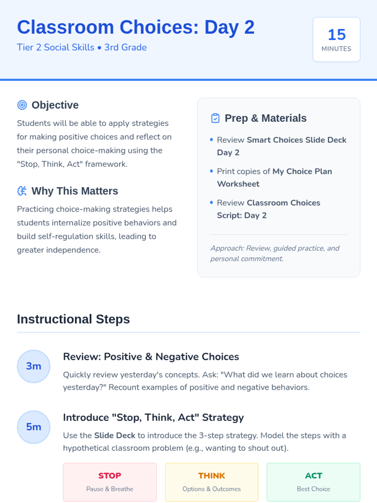 A two-day social skills lesson sequence for 3rd-grade Tier 2 groups, focusing on identifying positive and negative classroom choices and applying the 'Stop, Think, Act' strategy.