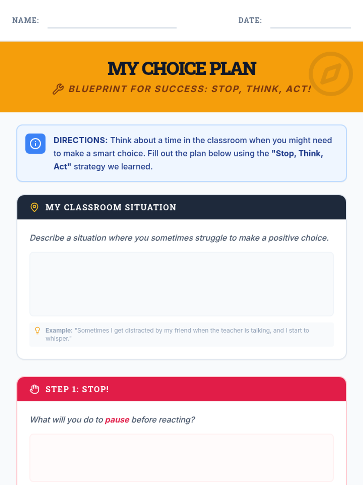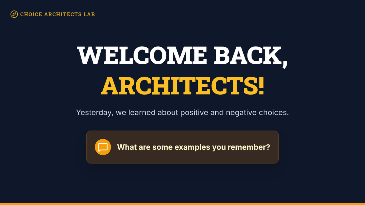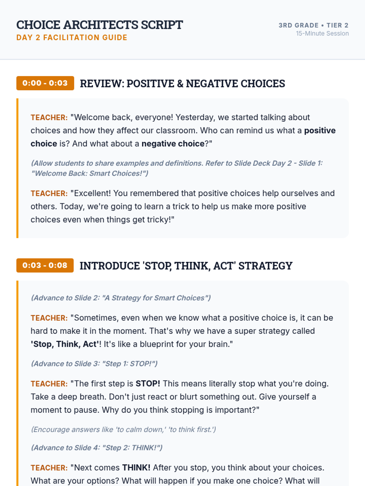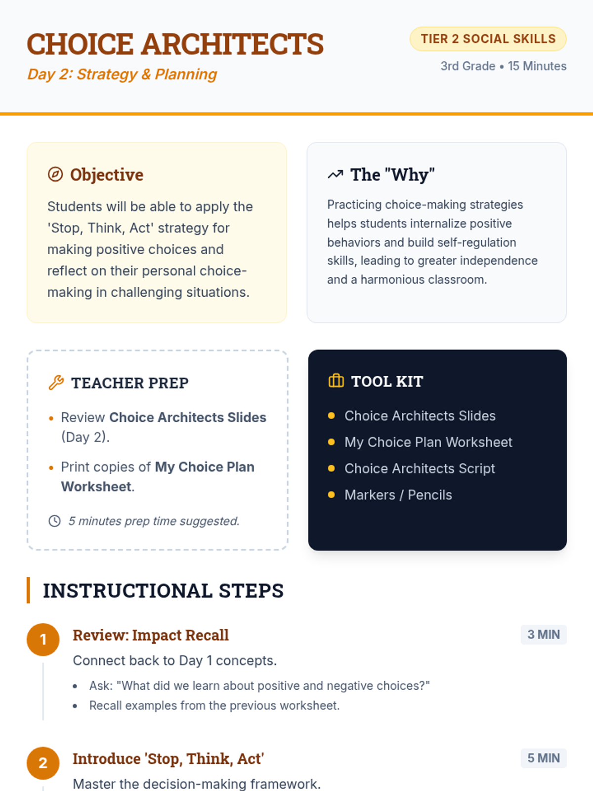 A two-day social skills sequence for 3rd-grade students in a Tier 2 group, focusing on identifying positive classroom choices and developing strategies like 'Stop, Think, Act' to implement them. Students transition from being 'Choice Detectives' identifying outcomes to 'Choice Architects' building their own action plans.