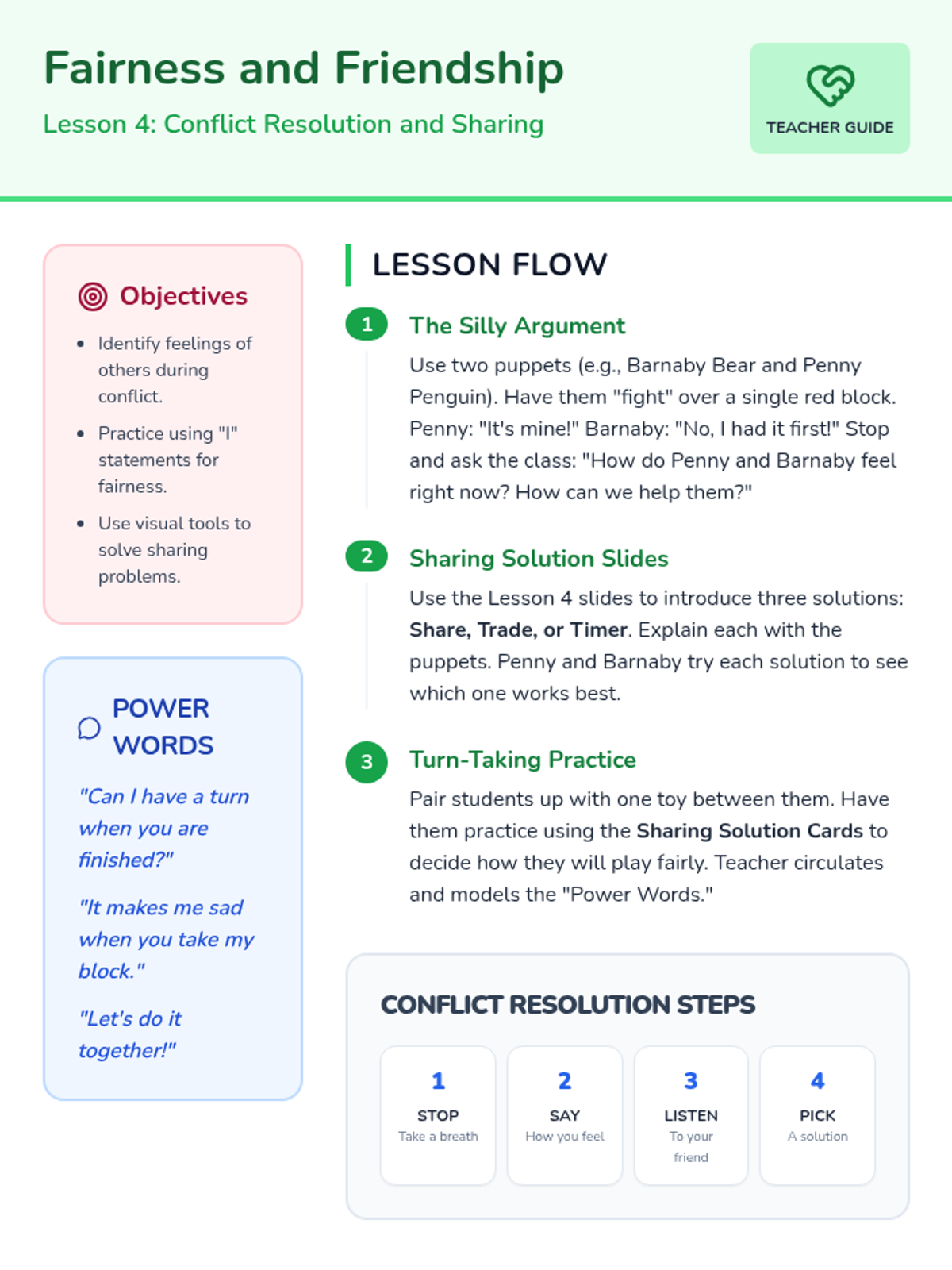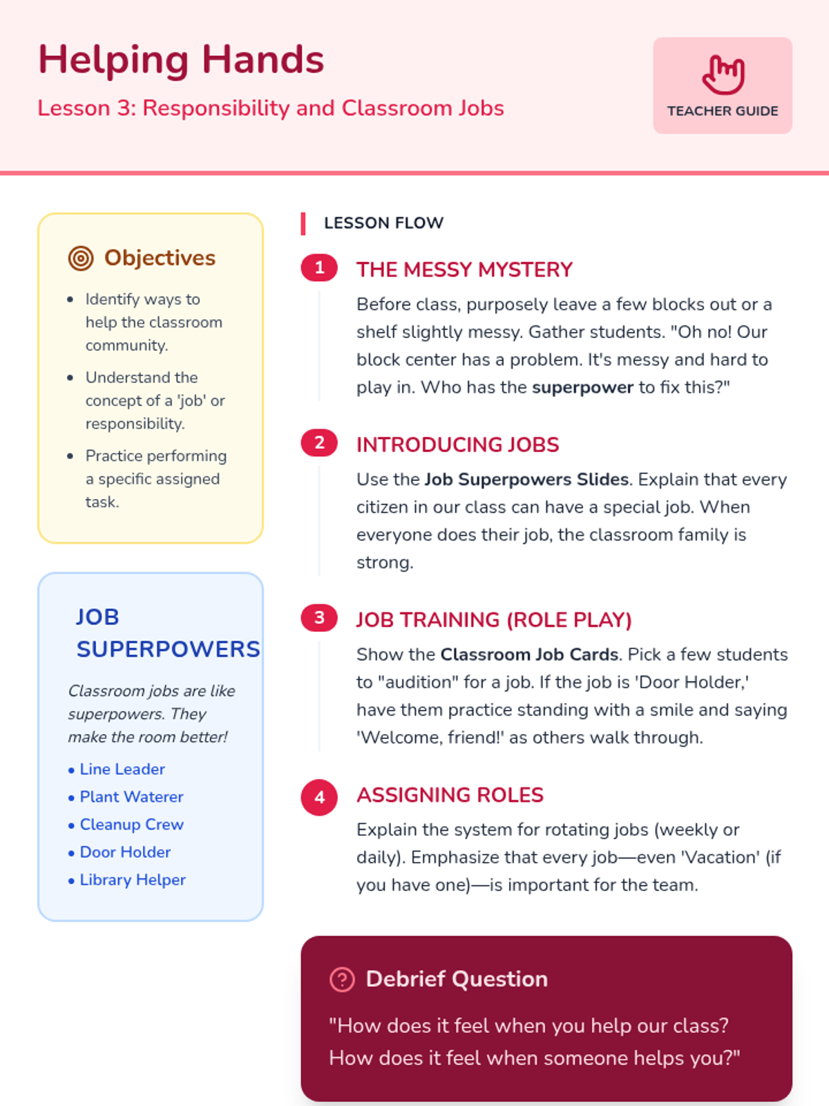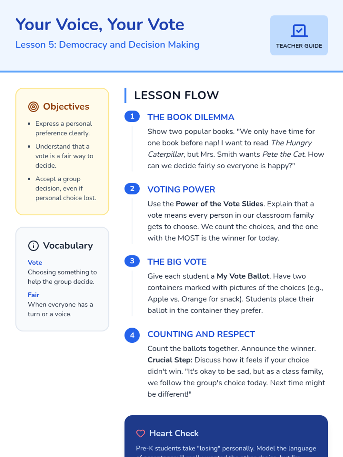 This sequence introduces Pre-K learners to citizenship through classroom community, rules, jobs, fairness, and voting. Students move from individual belonging to collaborative decision-making, grounding abstract civic concepts in daily school life.